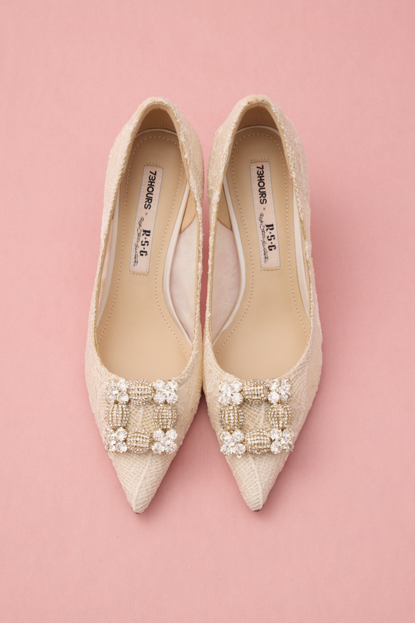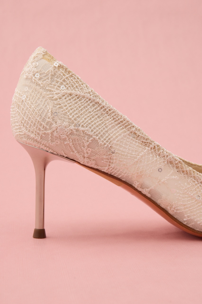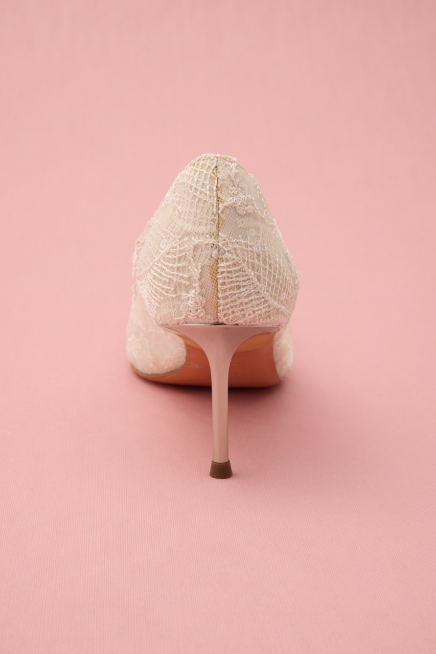 デイリーからウエディングシーンにも◎。繊細で上品な刺繍にスパンコールを散りばめたエレガントなピンヒールパンプス。とびききゴージャスなバックルも足元を華やかに彩ります。