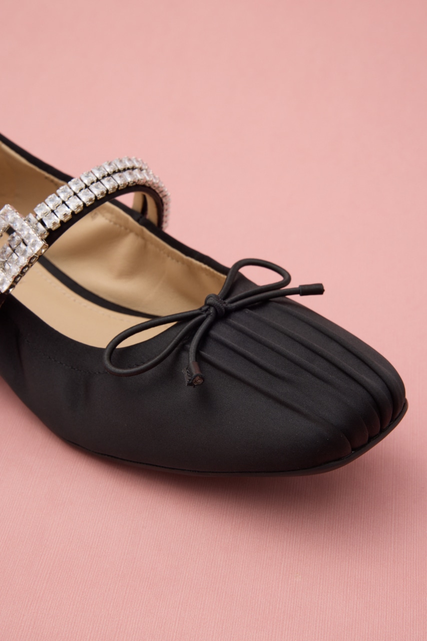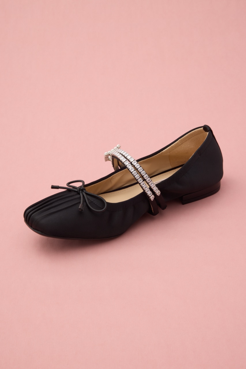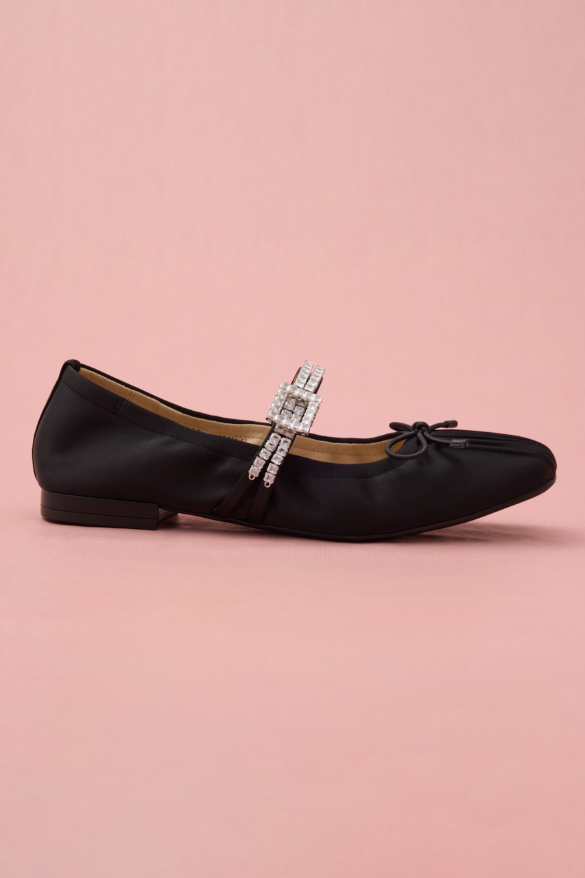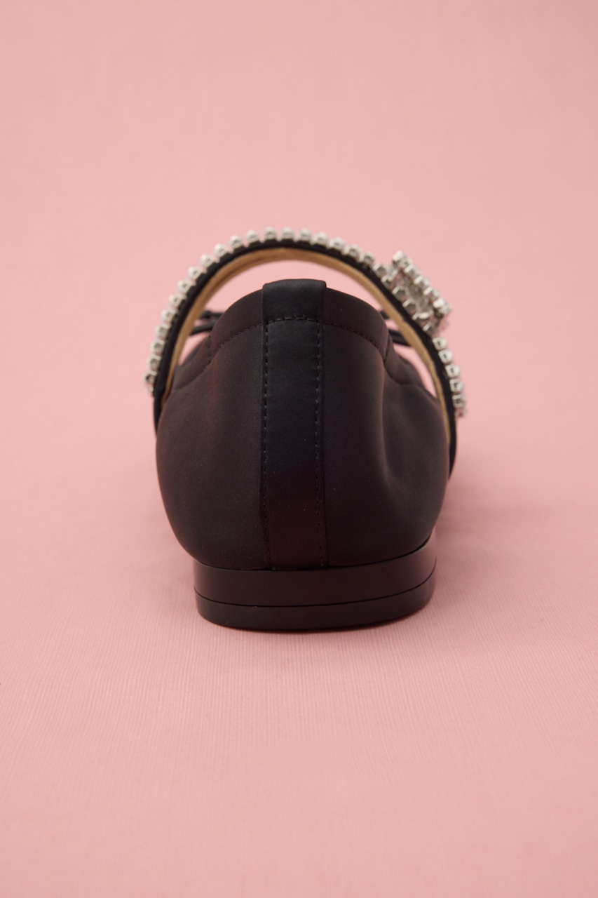 ゴージャスなスクエアストーン&バックルがデザインされたメリージェーンバレエシューズ。シルバーは、しなやかなシャイニーレザー・ブラックは品のある艶やかなサテン地で品格が漂います。