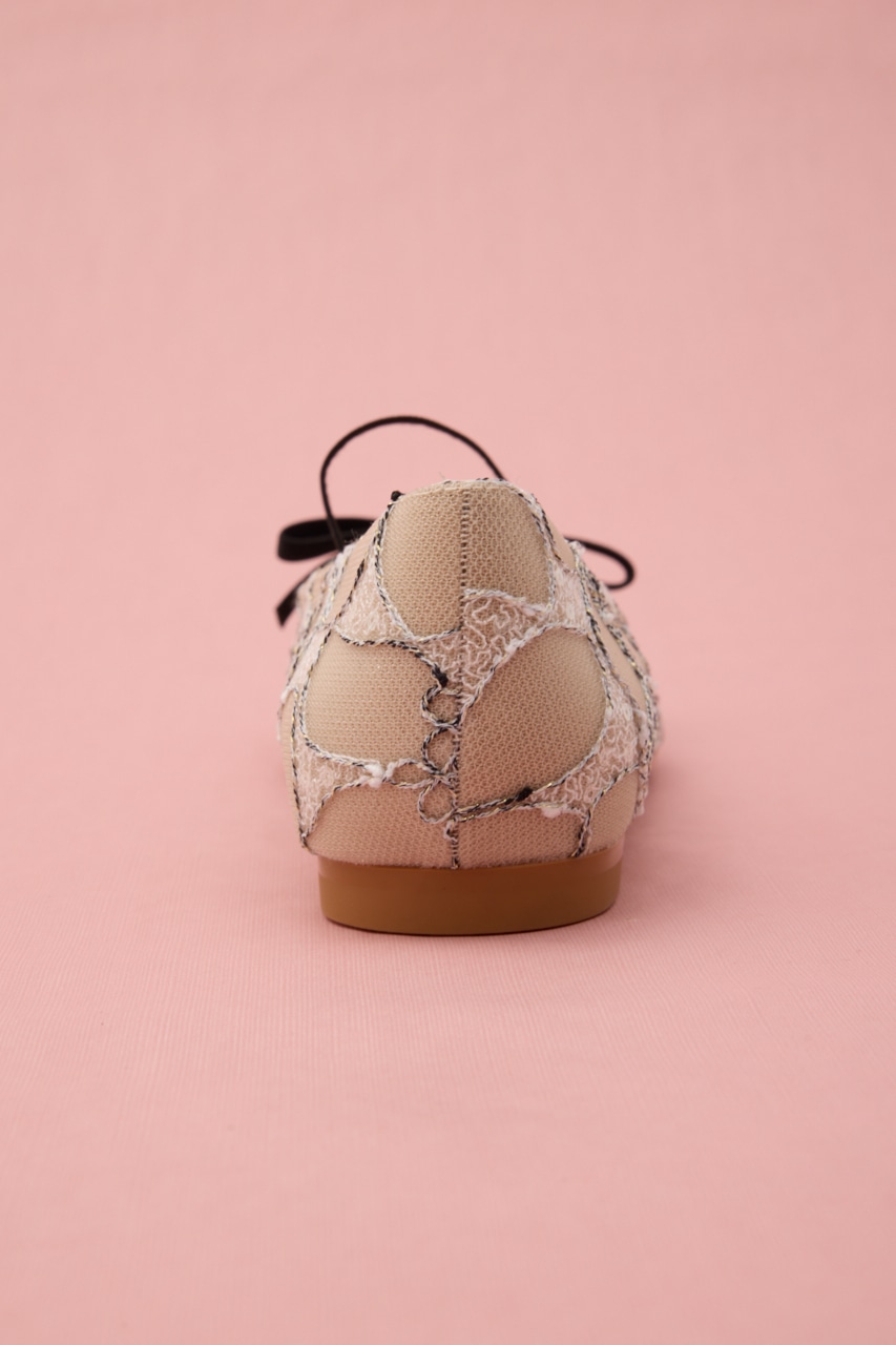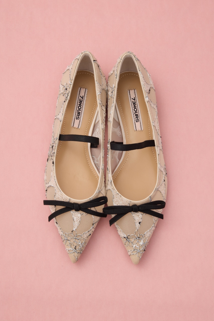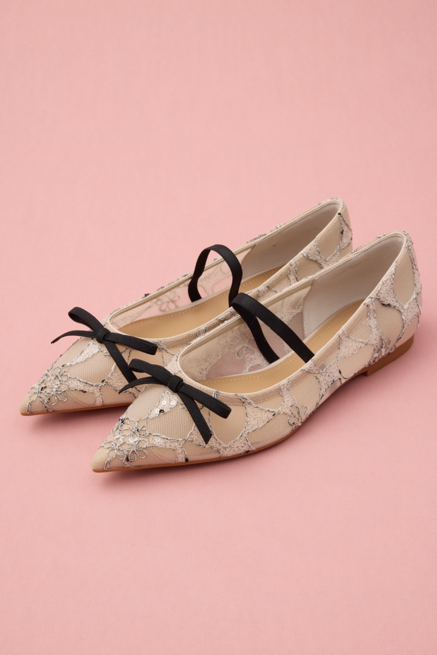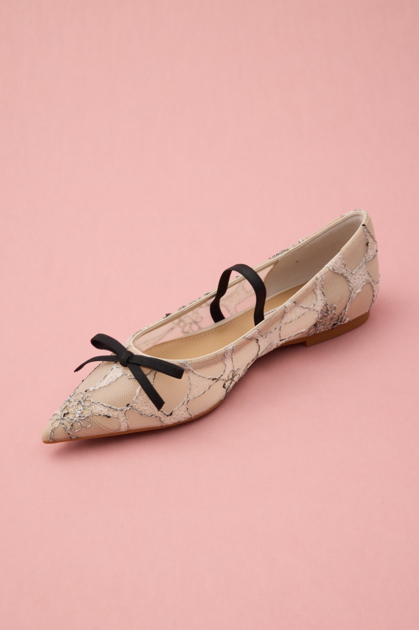 繊細デザインの立体感のあるエンブロイダリー レースが美しいカッターシューズ。アクセントのきいたブラックの華奢なリボンが足元をきゅっと引きしめてくれます。