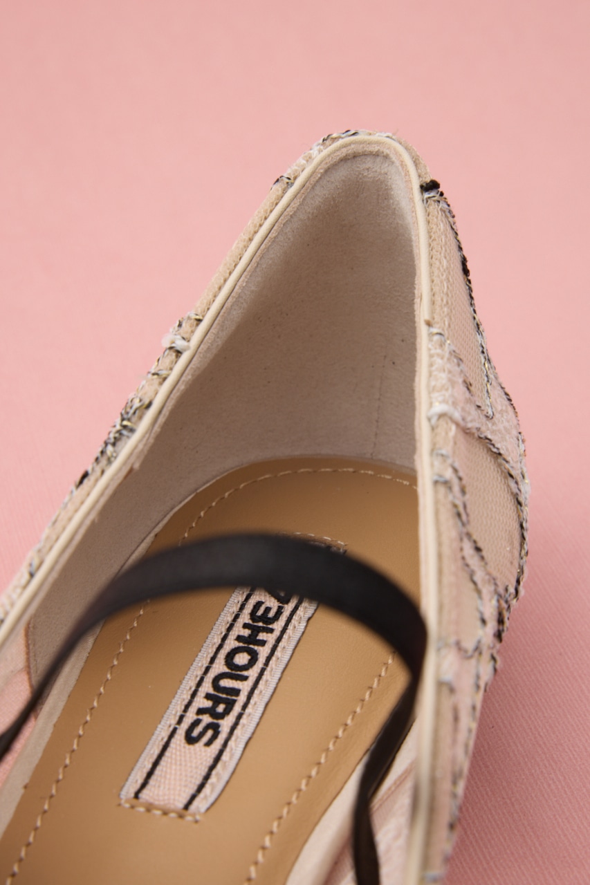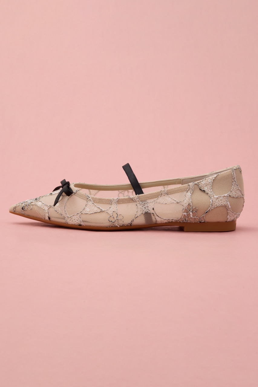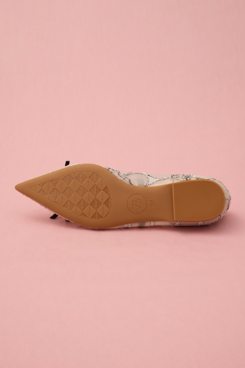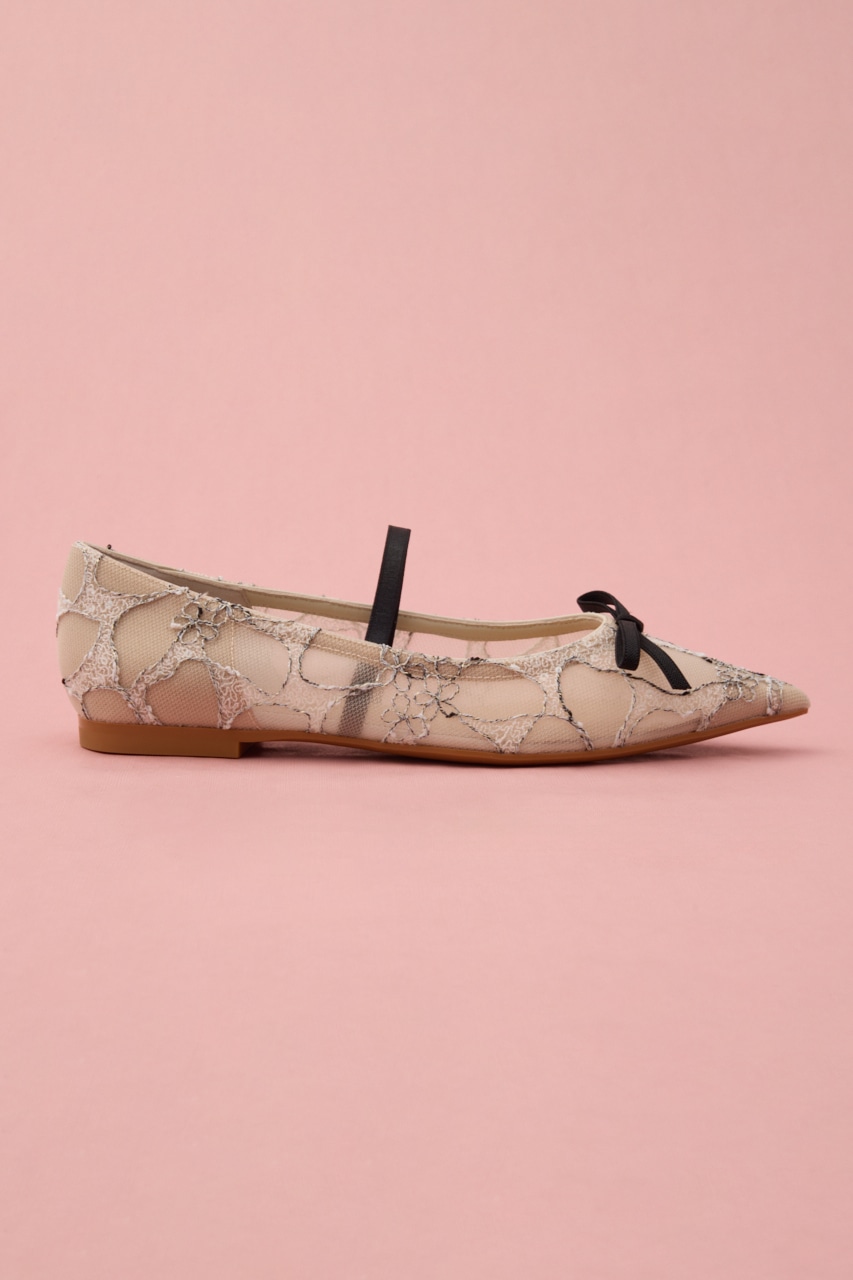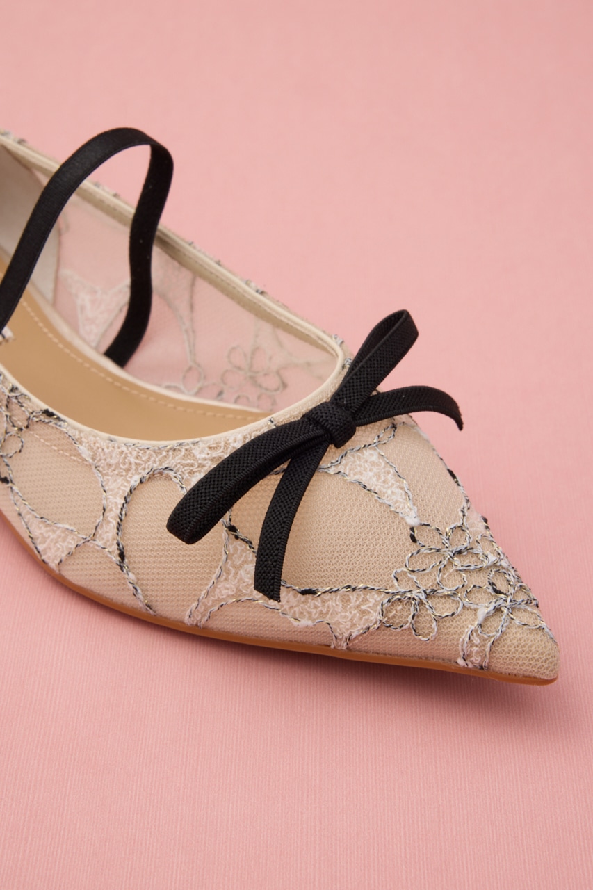 繊細デザインの立体感のあるエンブロイダリー レースが美しいカッターシューズ。アクセントのきいたブラックの華奢なリボンが足元をきゅっと引きしめてくれます。