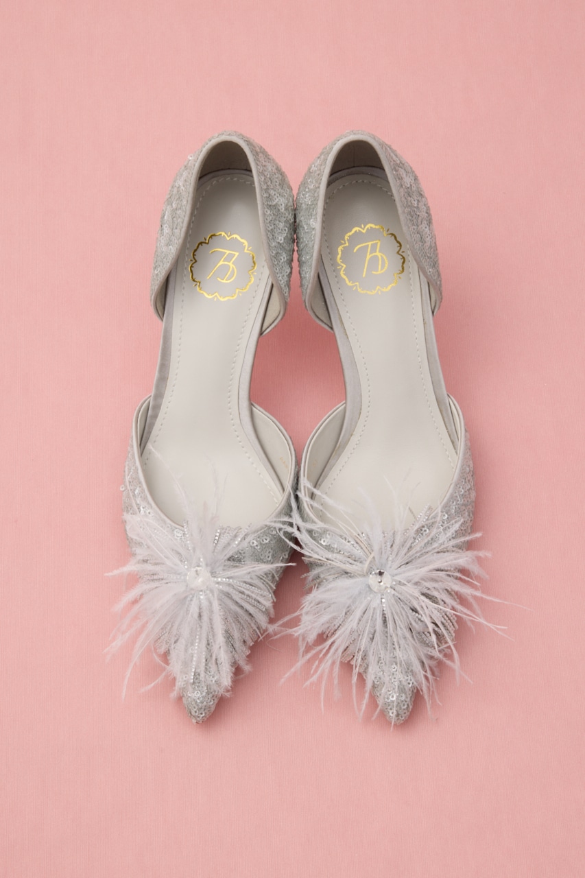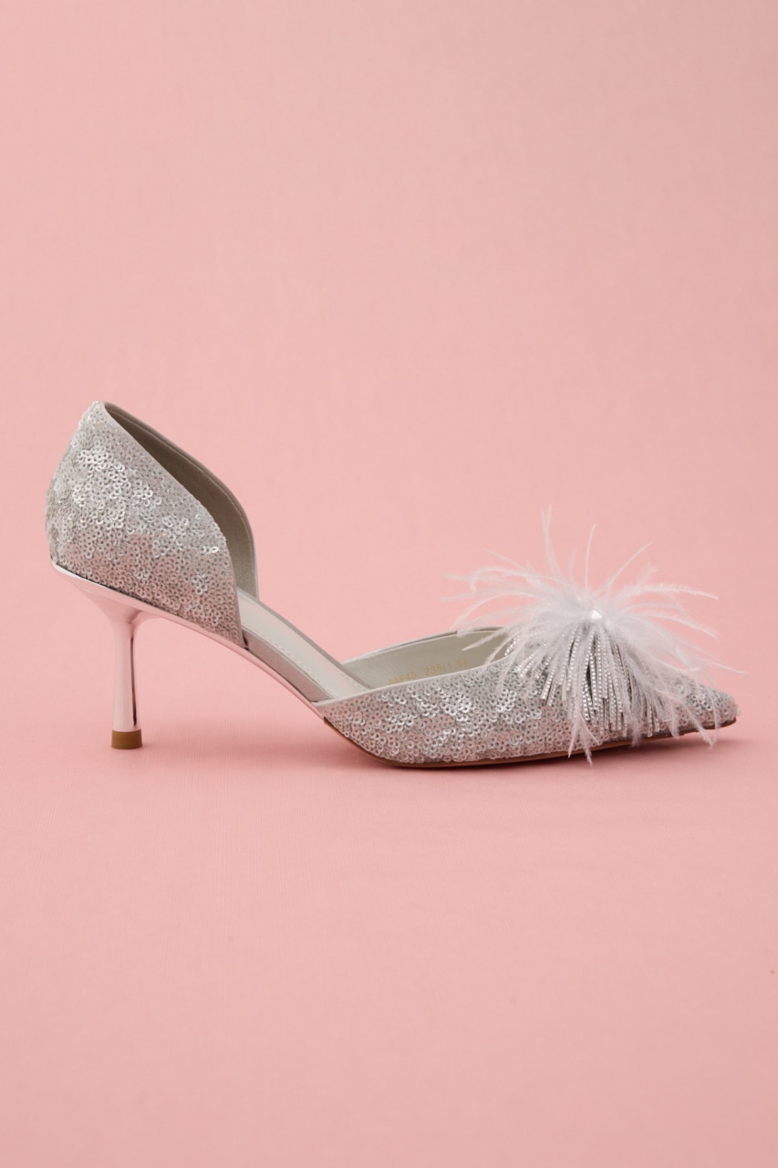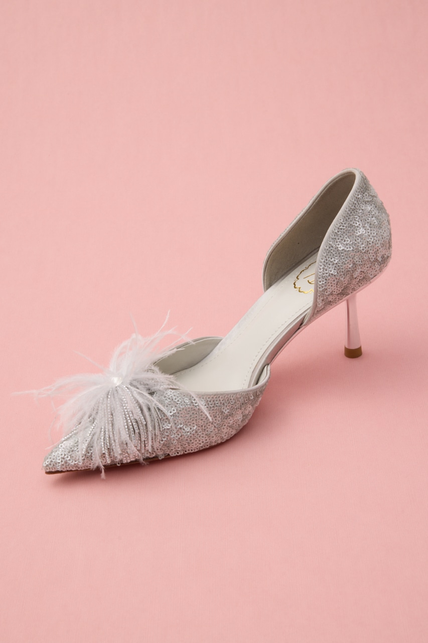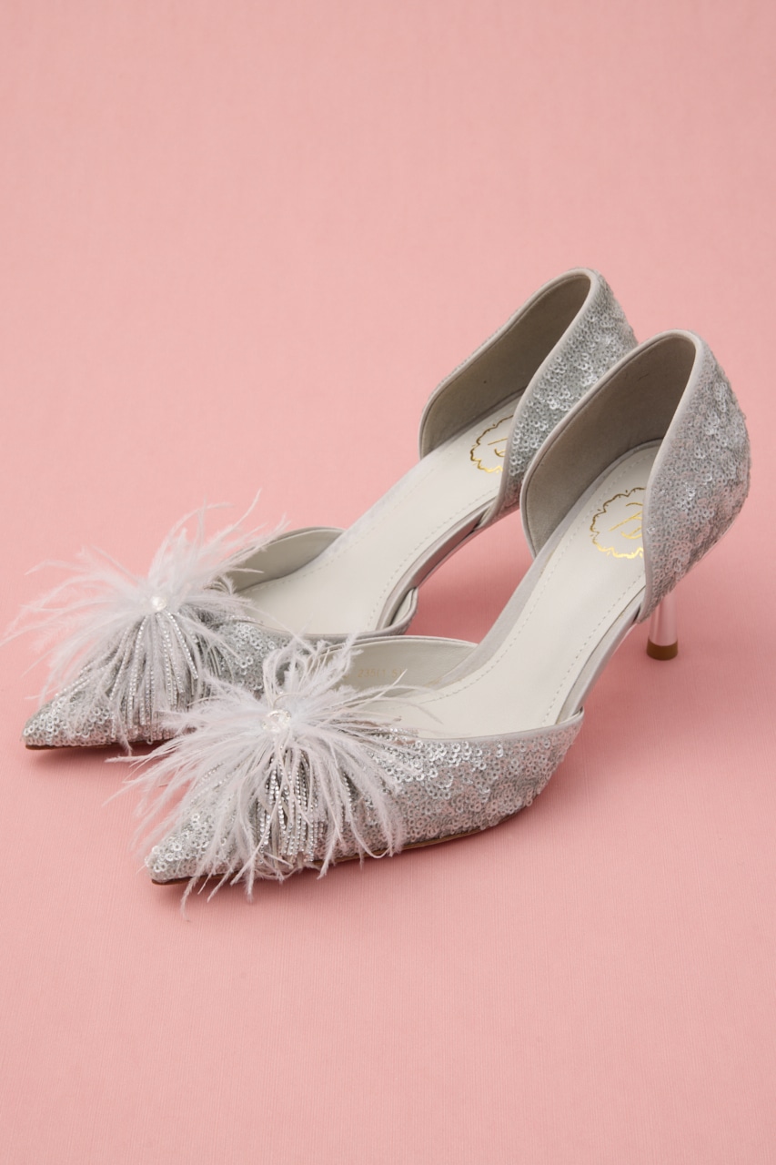 パーティーシーンにも大活躍してくれるセパレートパンプス。艶やかなスパンコールデザインに歩くたびにふわりと舞うフラワーのような、フェザー×ストーンリボンが女性らしさと乙女心をくすぐる1足。