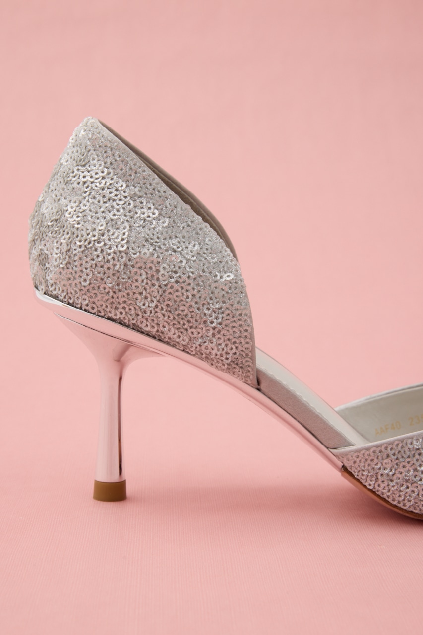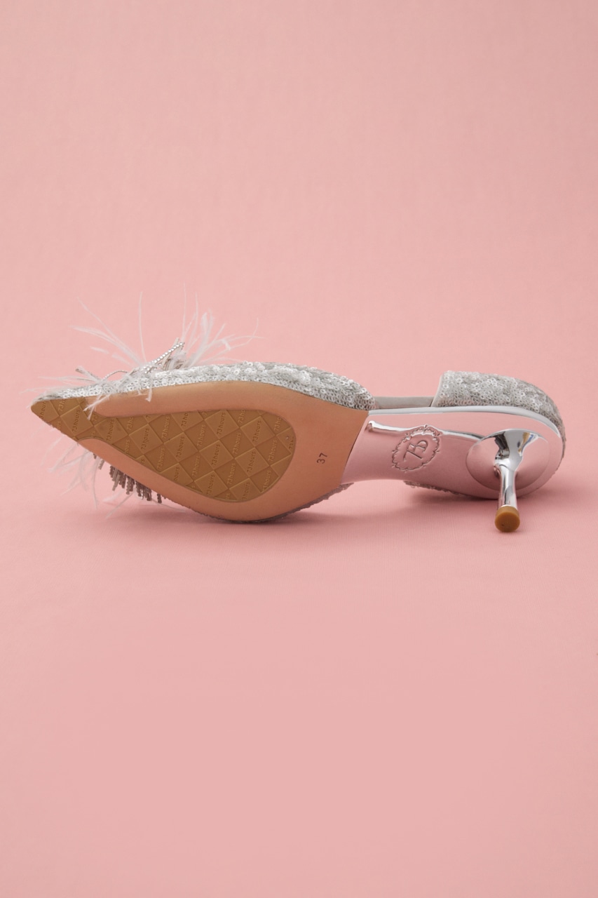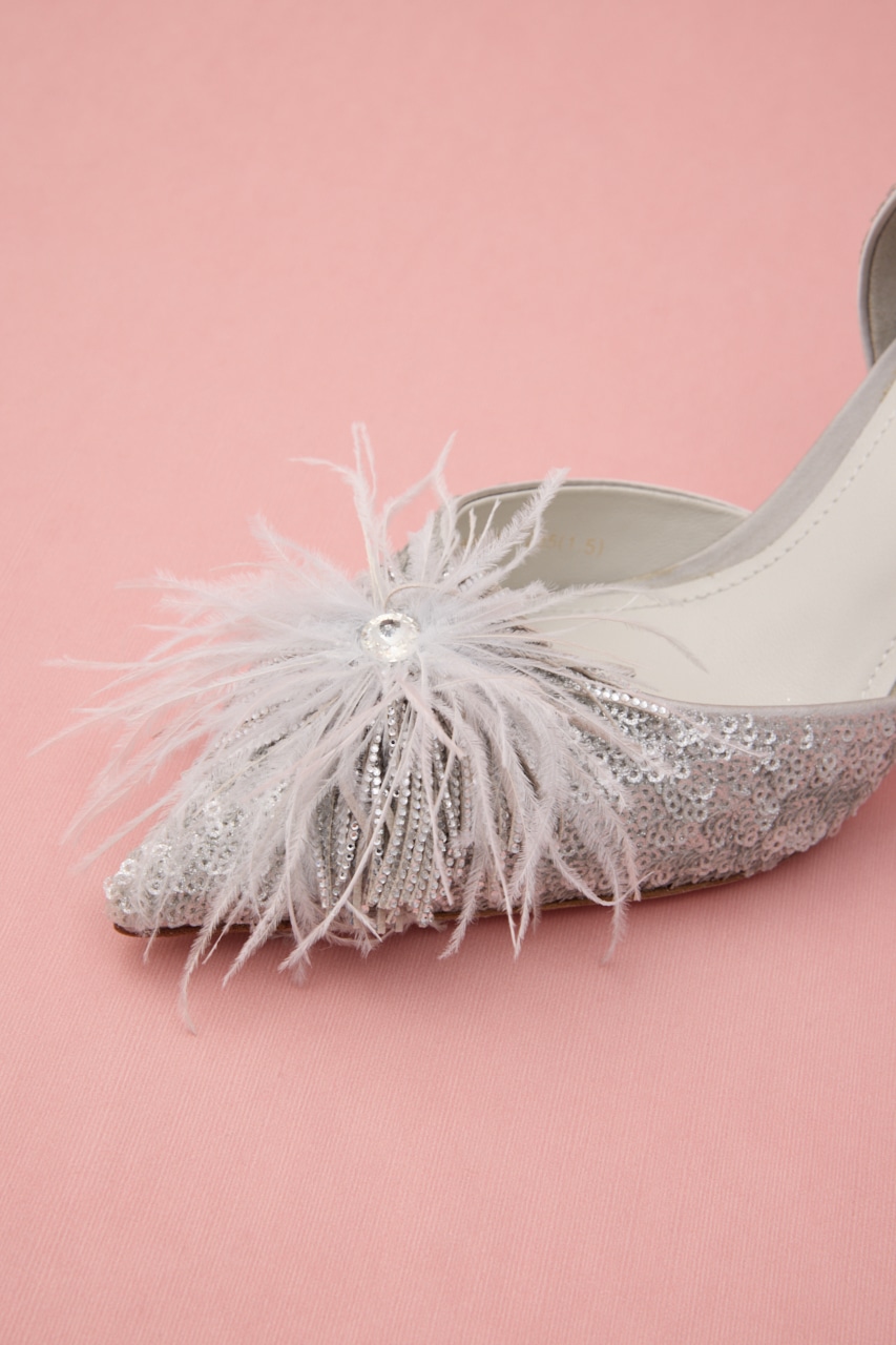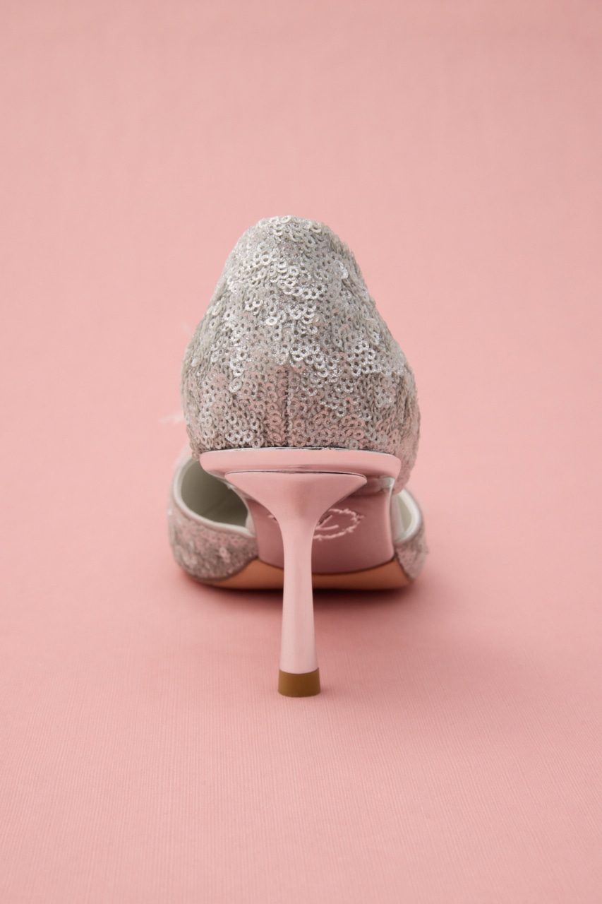 パーティーシーンにも大活躍してくれるセパレートパンプス。艶やかなスパンコールデザインに歩くたびにふわりと舞うフラワーのような、フェザー×ストーンリボンが女性らしさと乙女心をくすぐる1足。