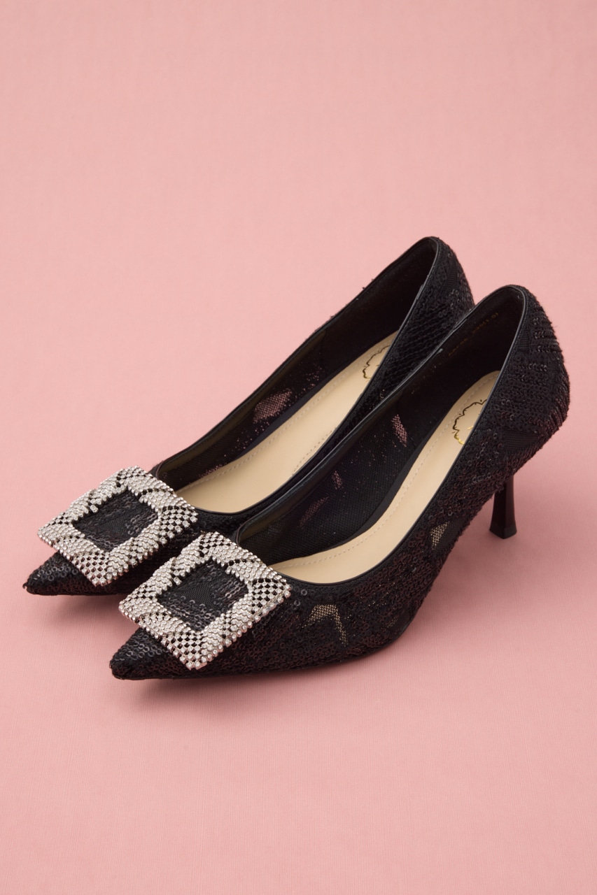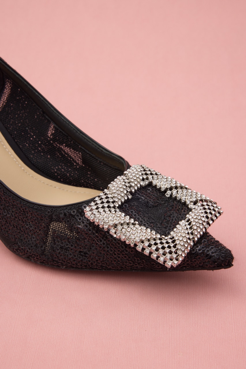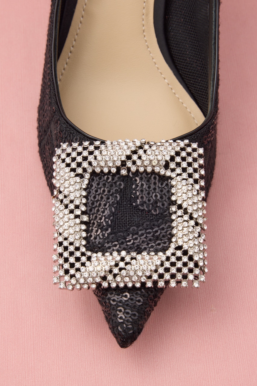 細やかなディテールが光る。ぬけ感のある立体的なスクエアバックルに、さり気なくヌーディーなメッシュ地にはスパンコールを散りばめた大人な色気が漂うデザインパンプス。