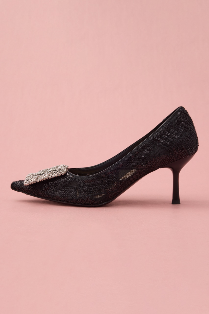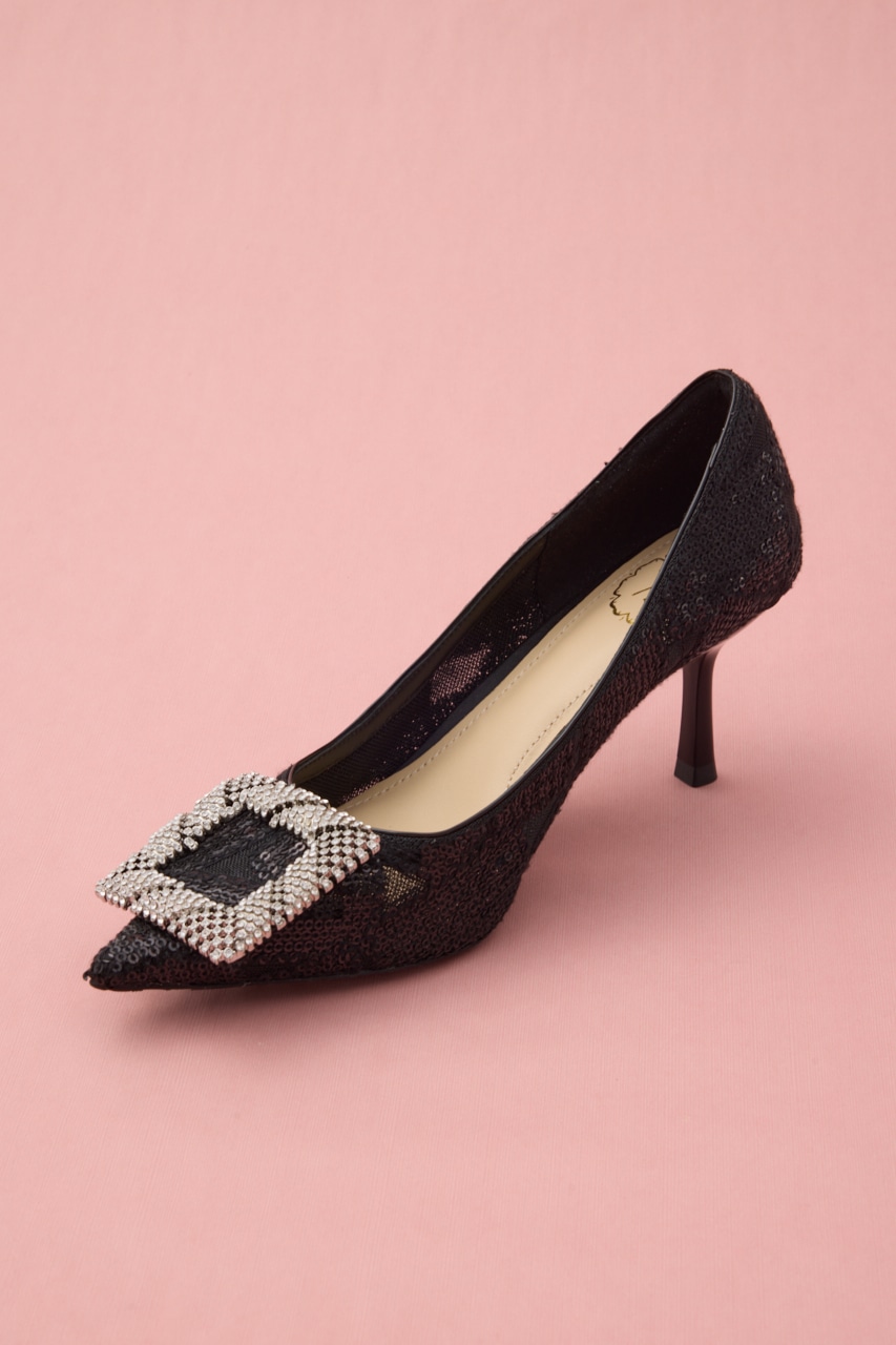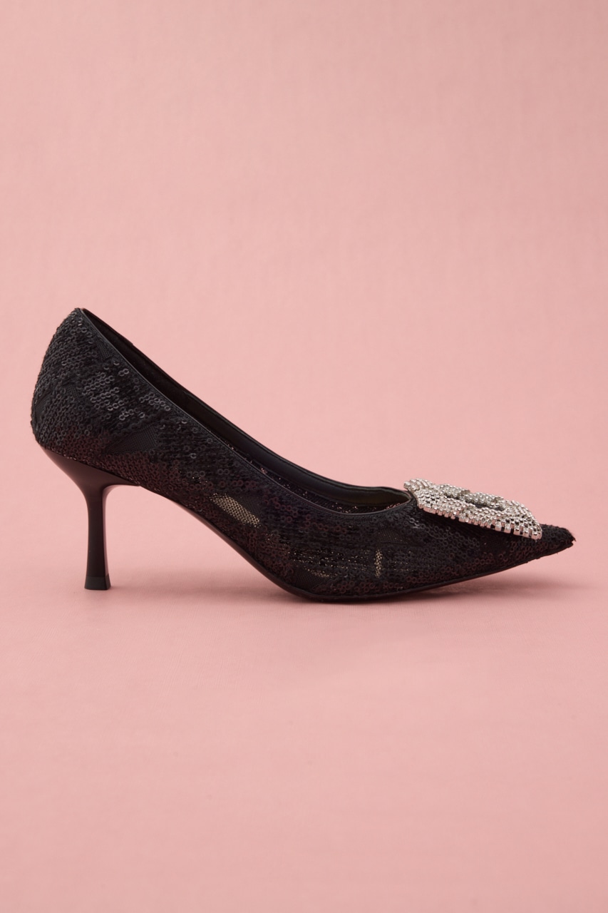細やかなディテールが光る。ぬけ感のある立体的なスクエアバックルに、さり気なくヌーディーなメッシュ地にはスパンコールを散りばめた大人な色気が漂うデザインパンプス。