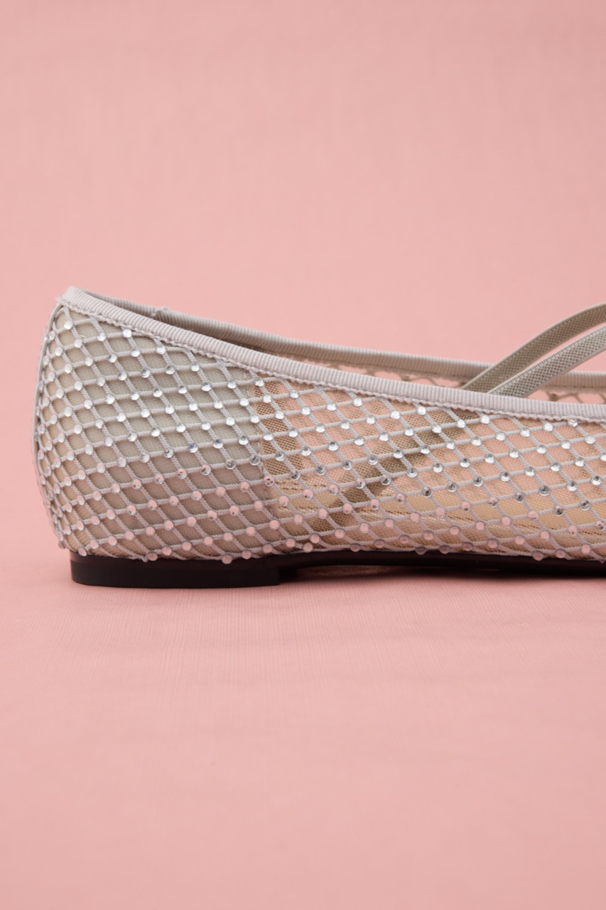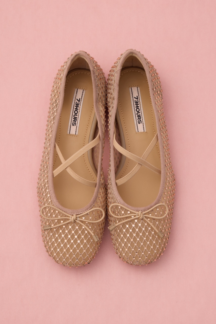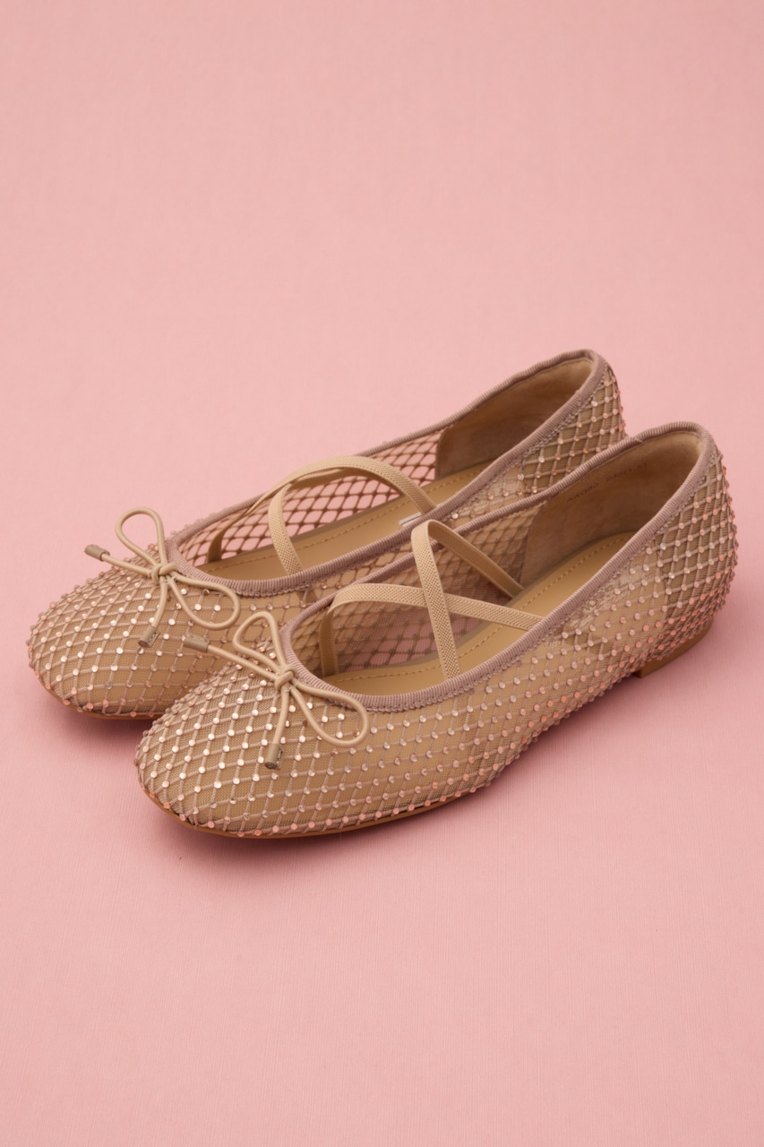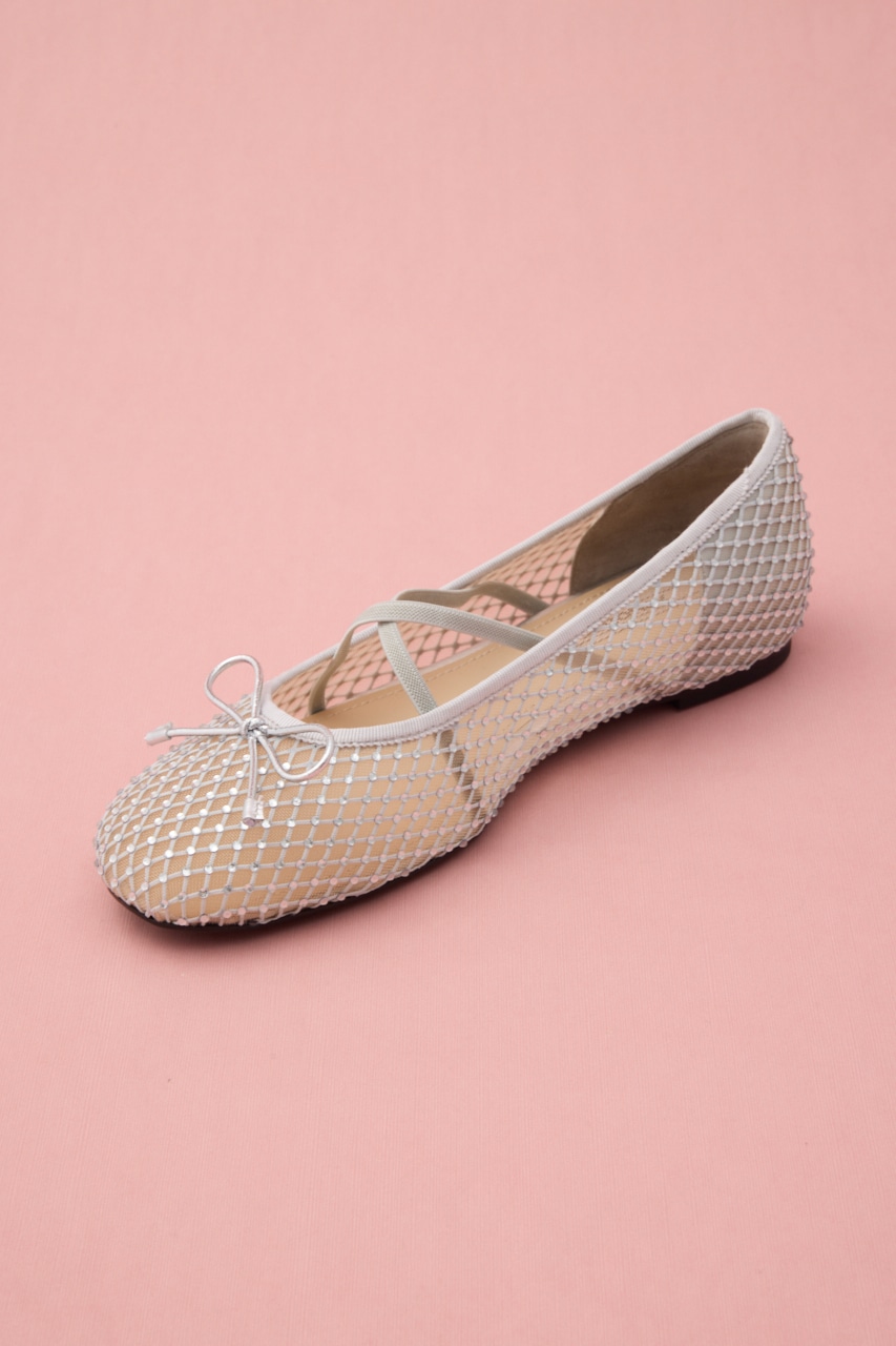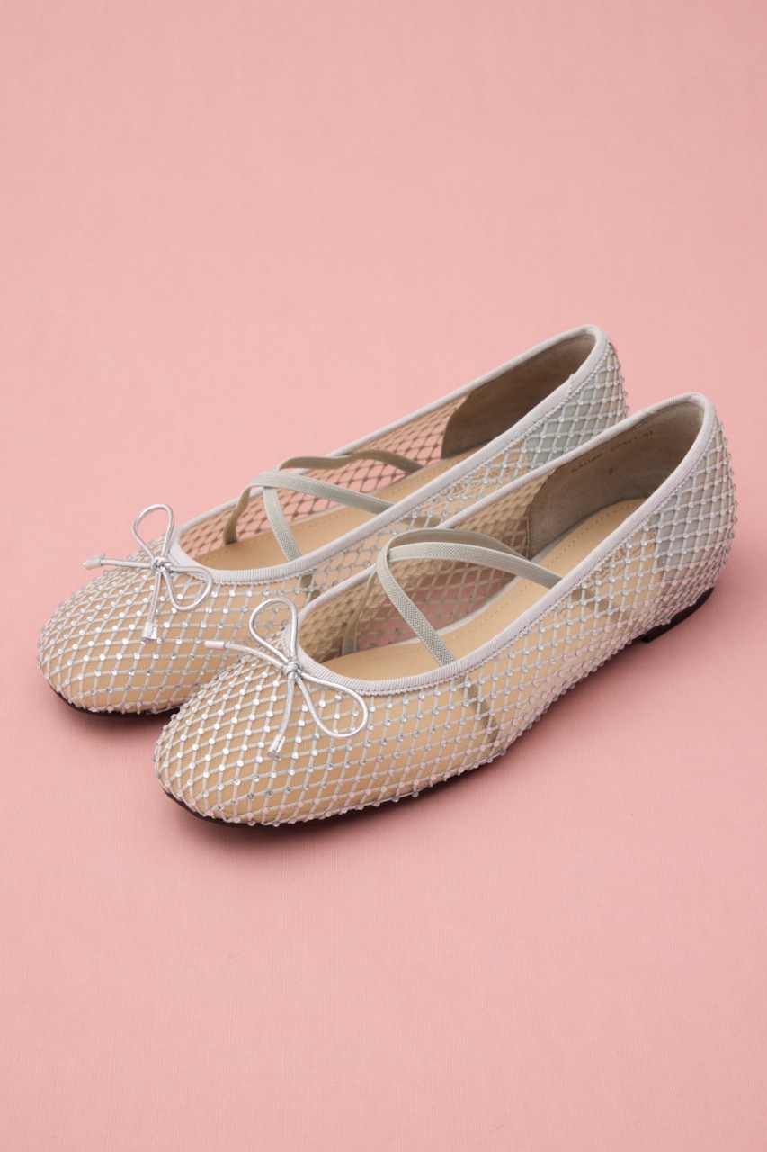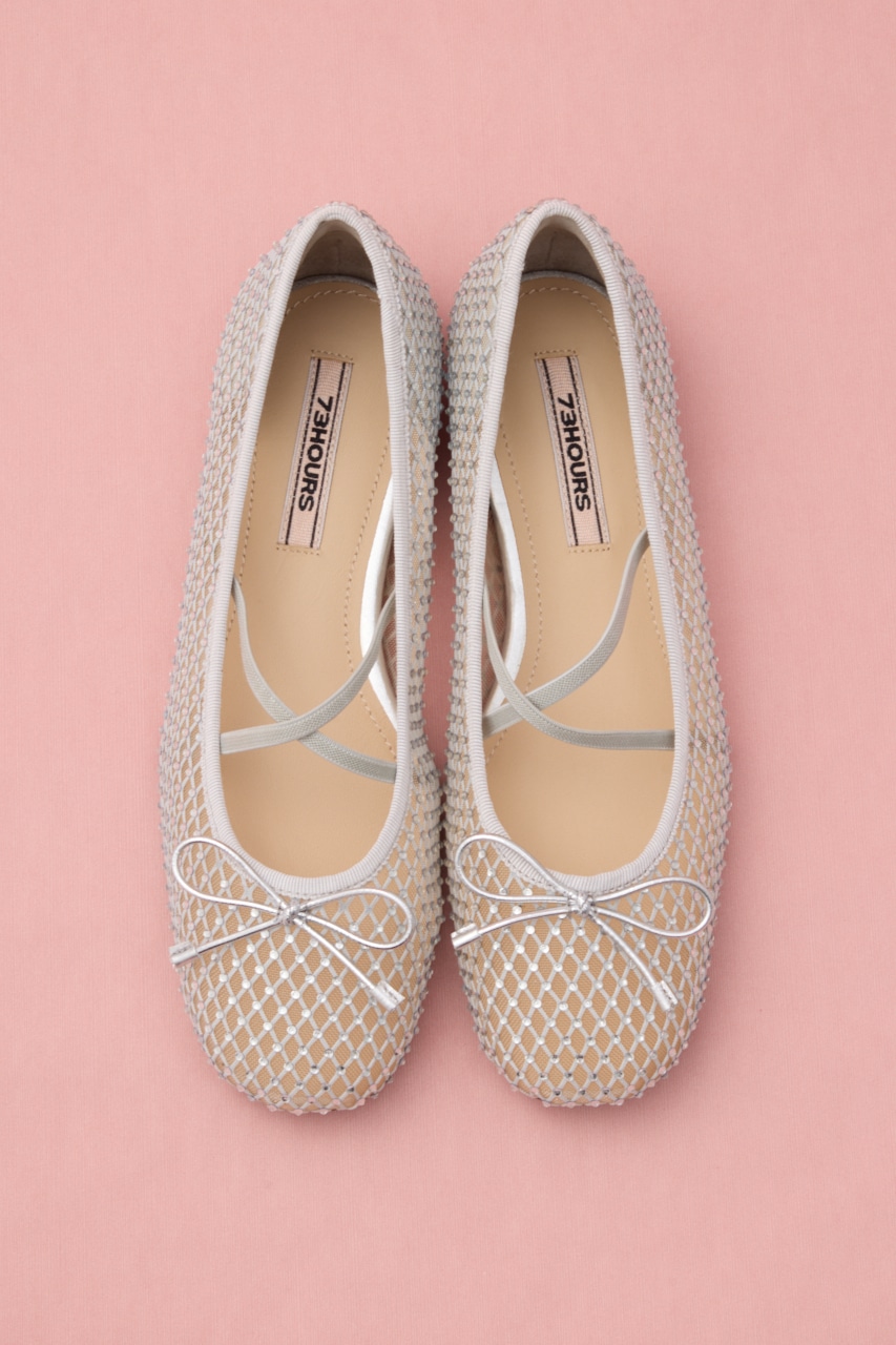 フィッシュネット地に1粒ずつストーンをほどこした、大人かわいい軽量バレリーナシューズ。さらっとしてぬけ感のあるメッシュ地なので、春夏の足元に◎クロスベルトで甲を安定させてくれるのも嬉しいポイントです。