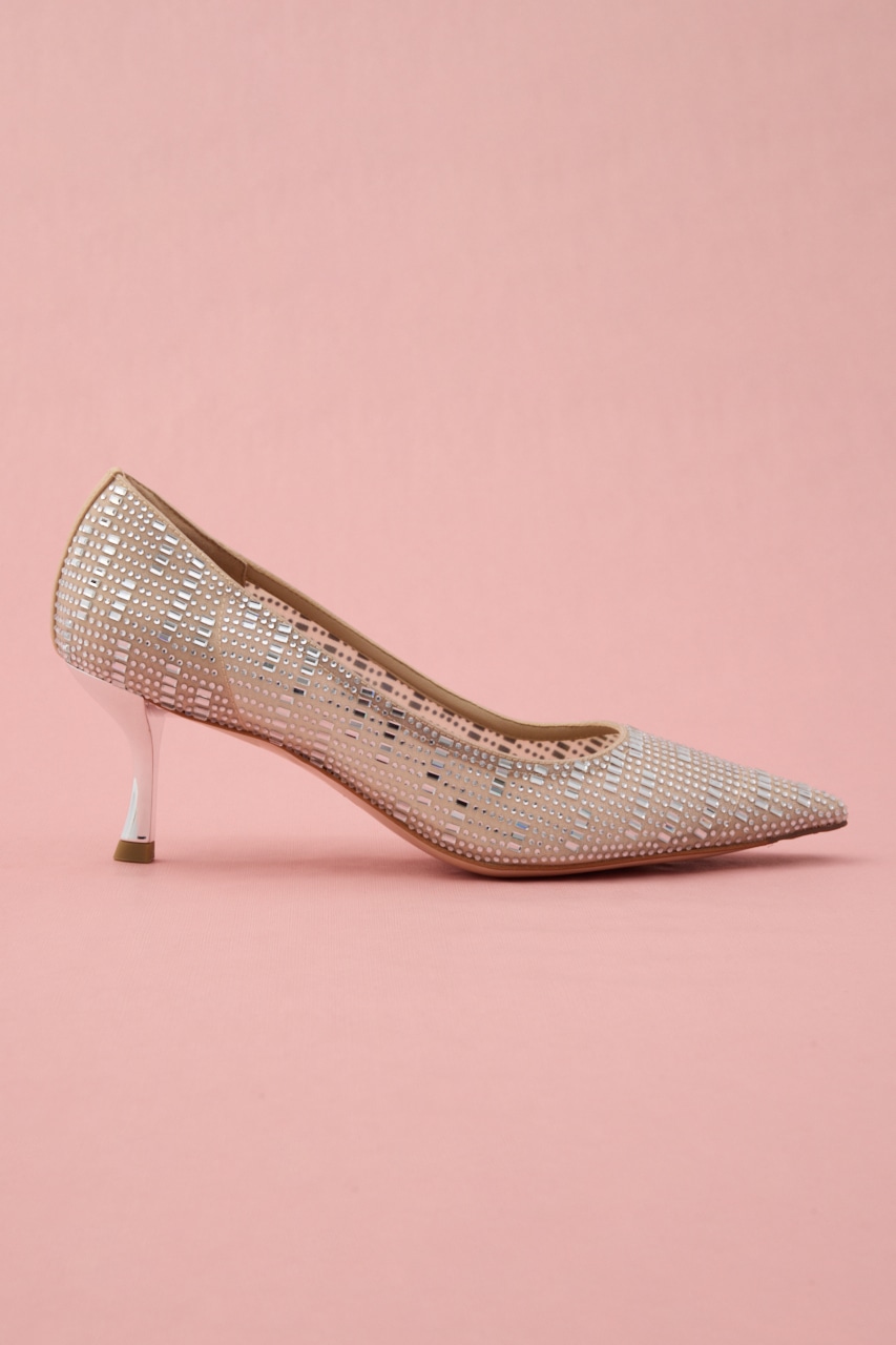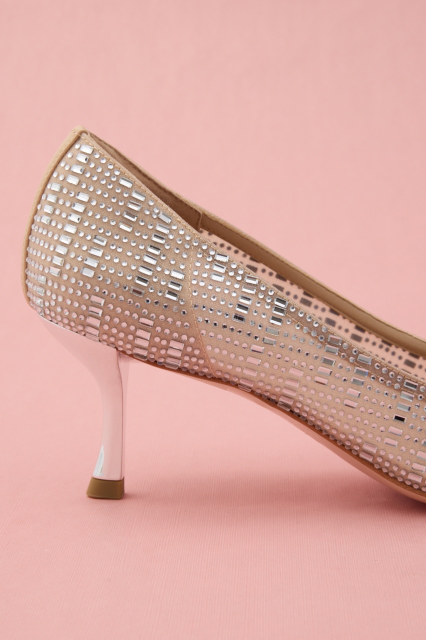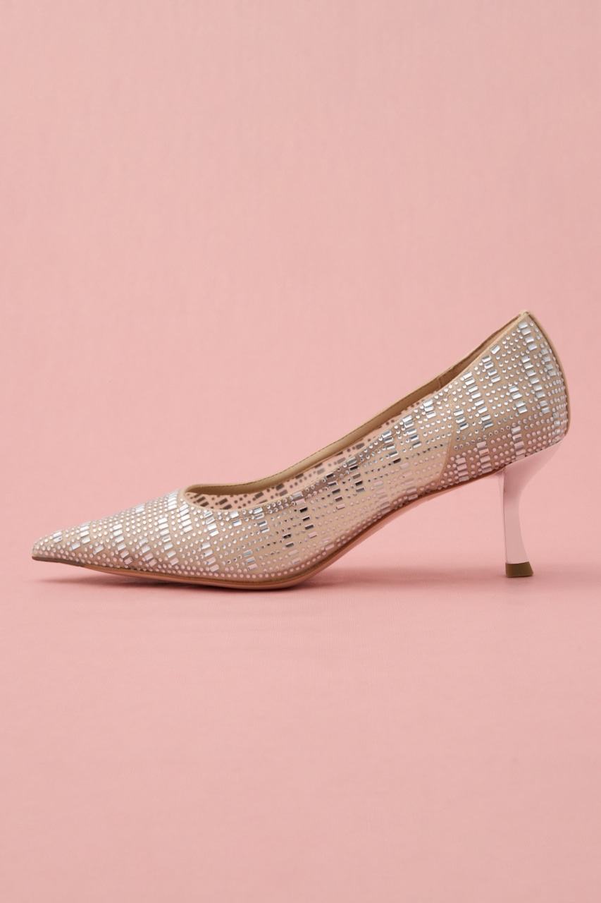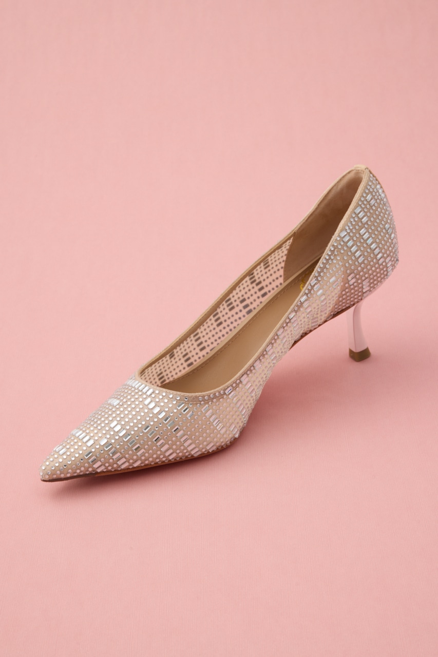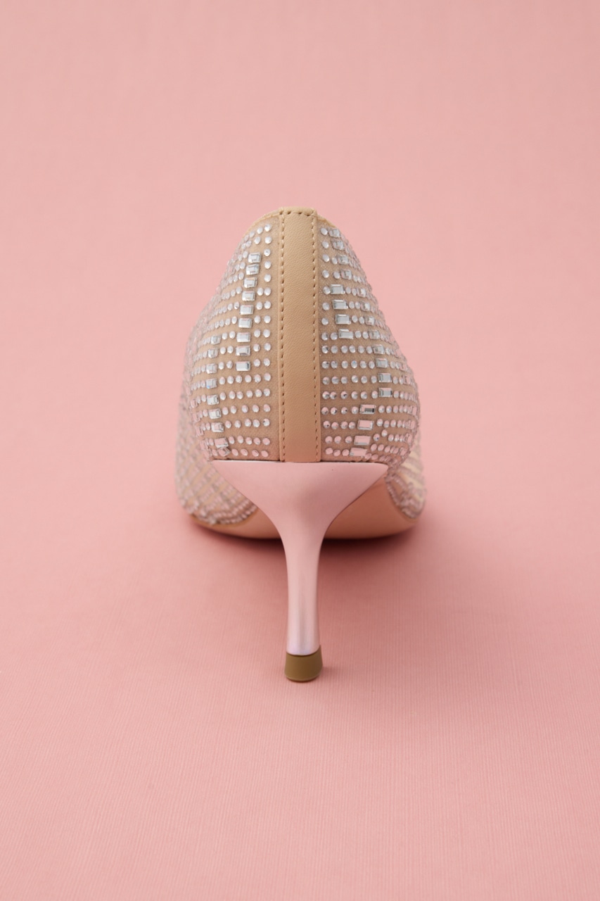 華やかな足元に魅せてくれるポインテッドトゥパンプス。肌馴染みのよいヌーディーなカラーのメッシュ地に様々な形のストーンを流れるようなデザインに装飾しました。