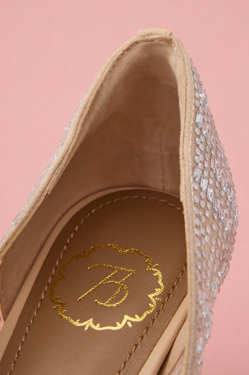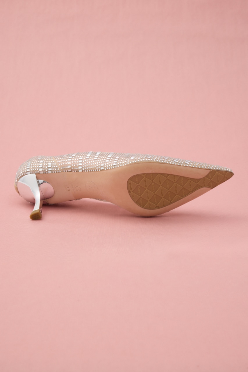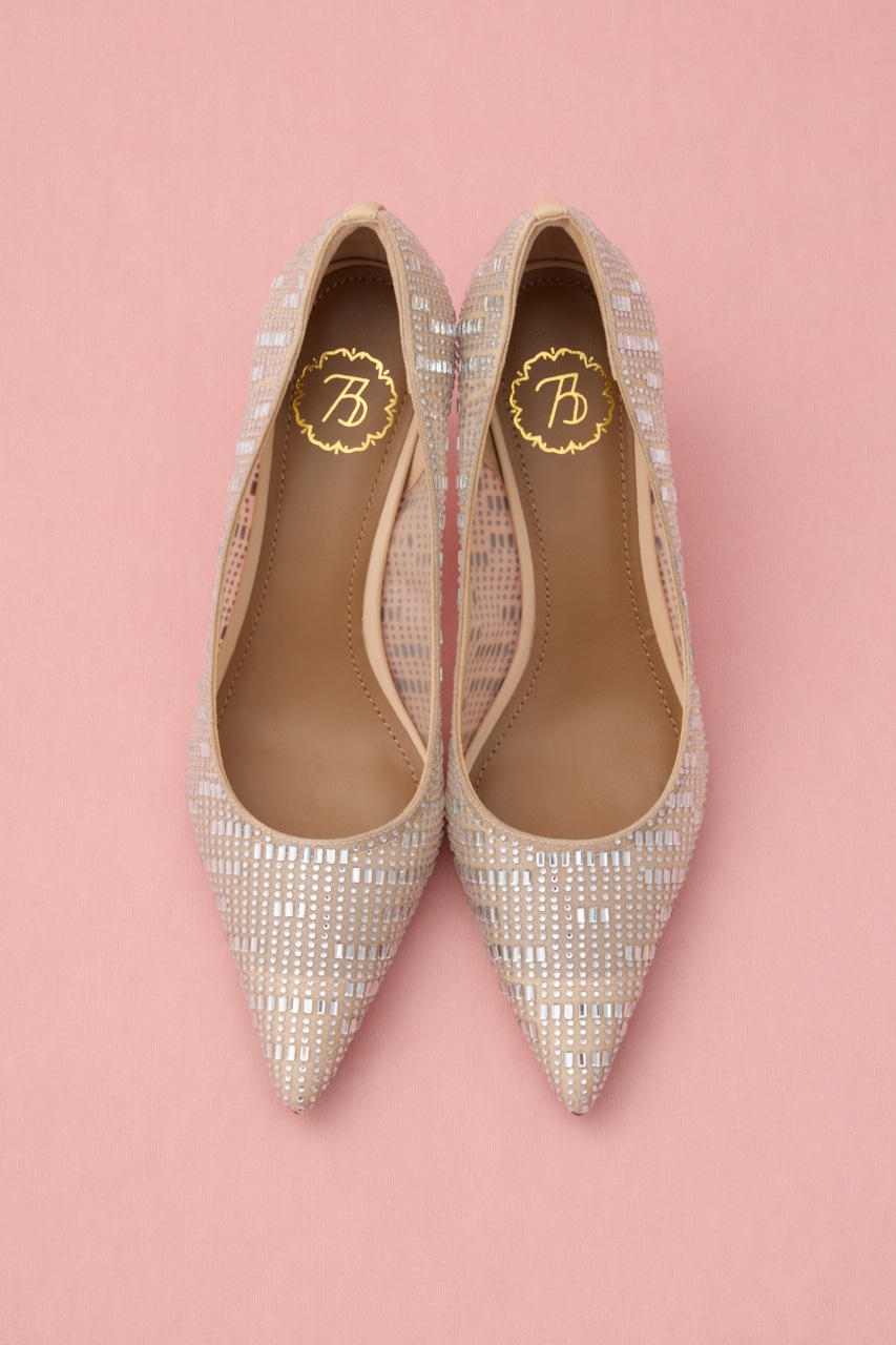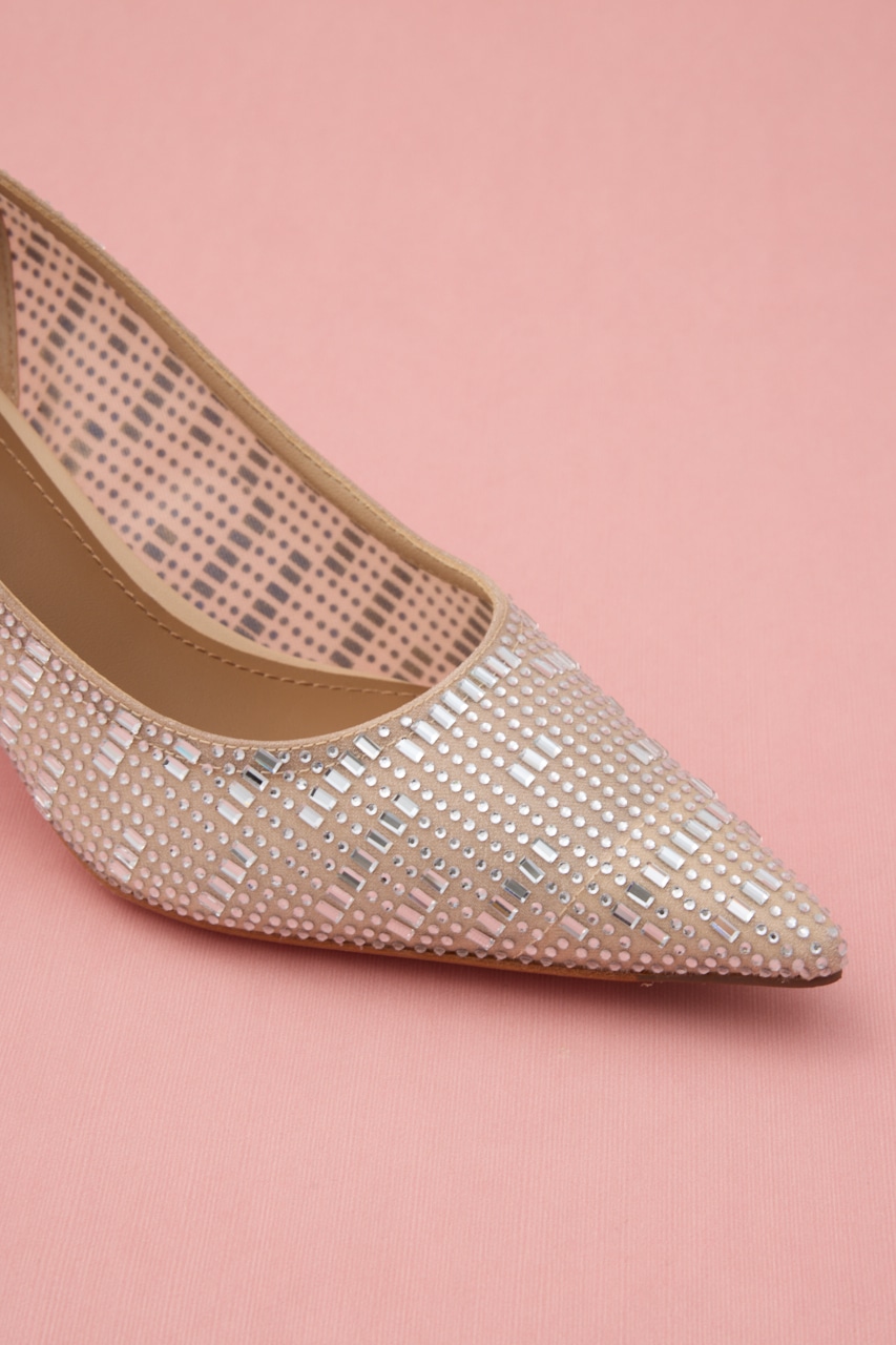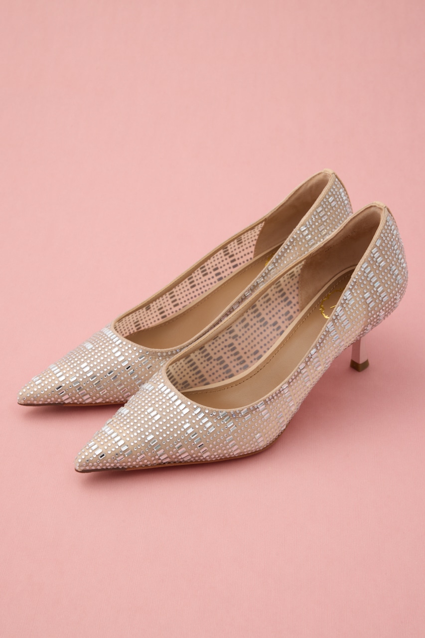 華やかな足元に魅せてくれるポインテッドトゥパンプス。肌馴染みのよいヌーディーなカラーのメッシュ地に様々な形のストーンを流れるようなデザインに装飾しました。