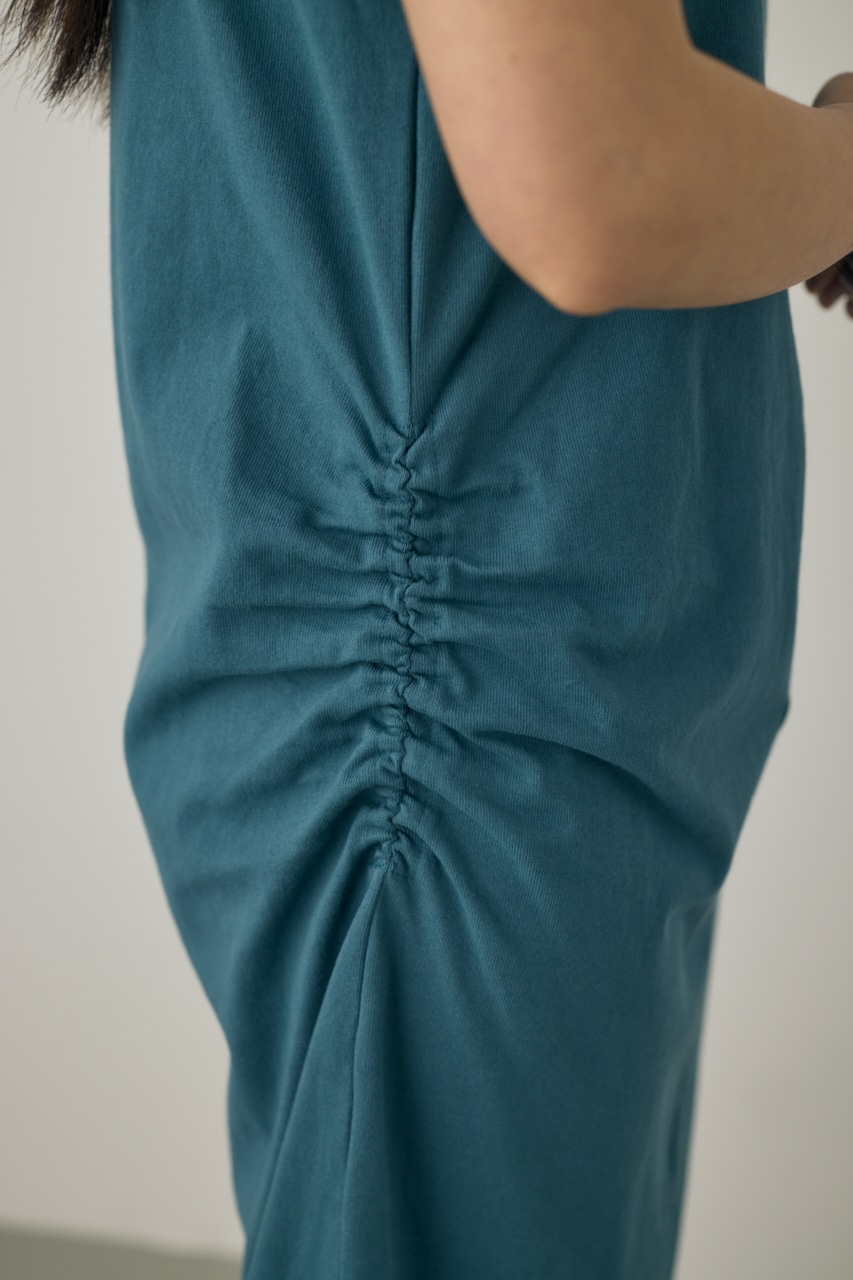左右アシンメトリーに寄せたサイドギャザーがポイント。