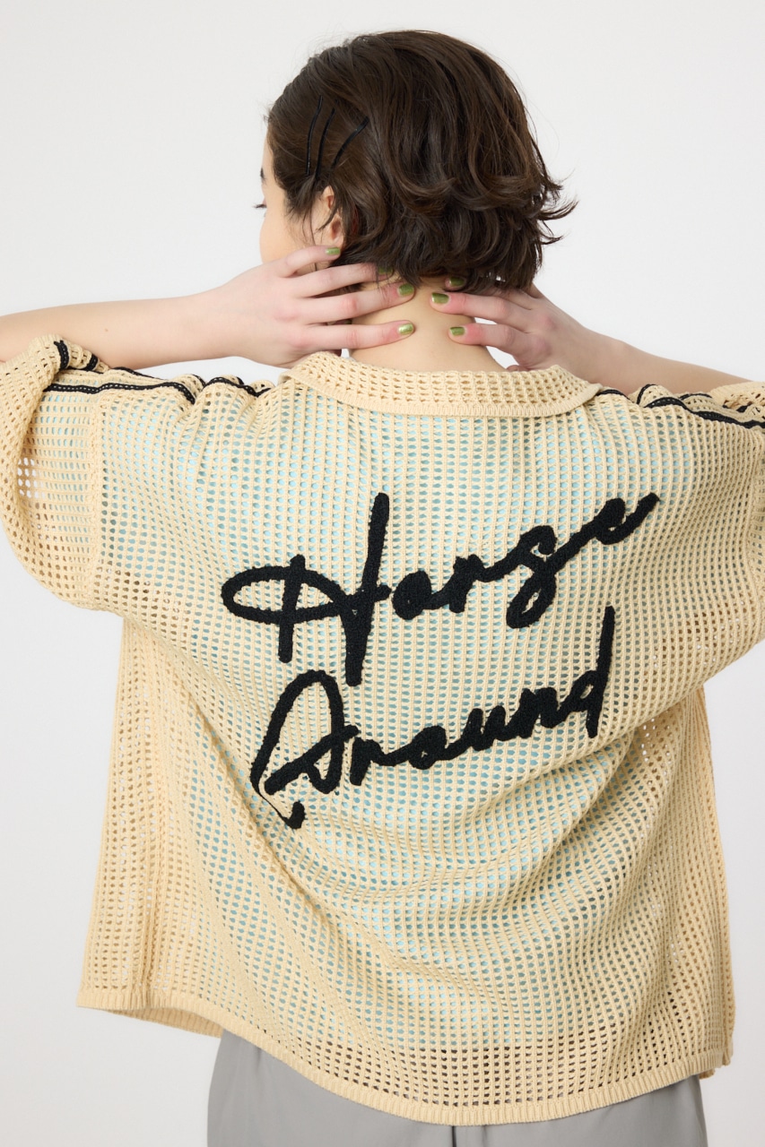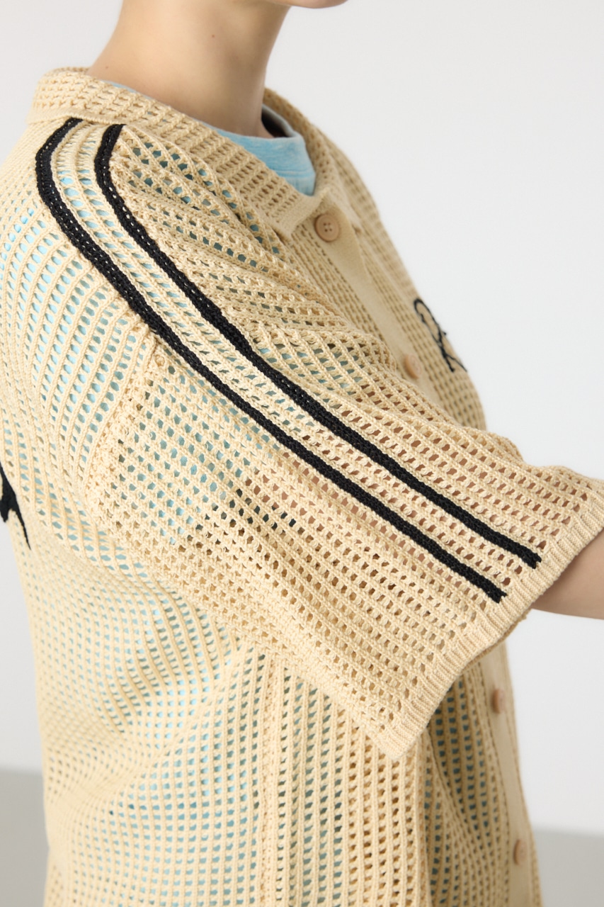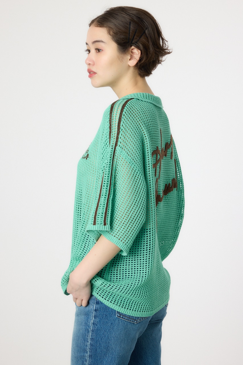 格子状に粗く編み上げた透かし編みに配色の効いたロゴと袖ラインがポイントの透かし編みニット。