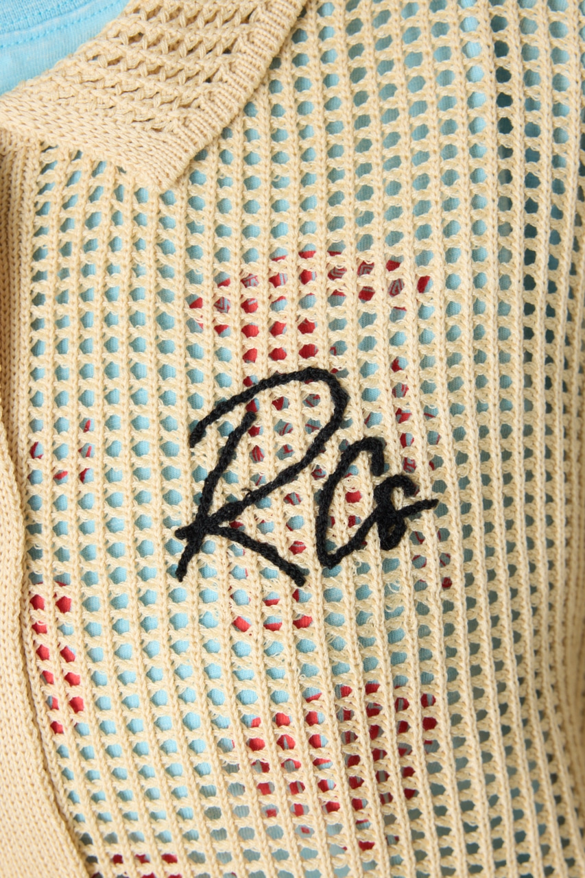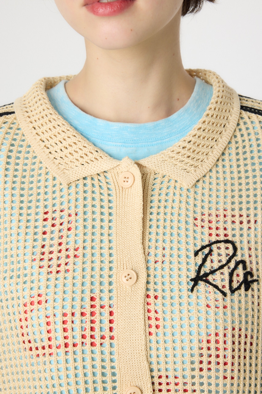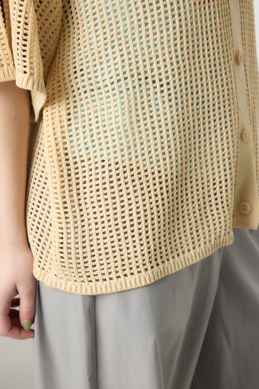 格子状に粗く編み上げた透かし編みに配色の効いたロゴと袖ラインがポイントの透かし編みニット。