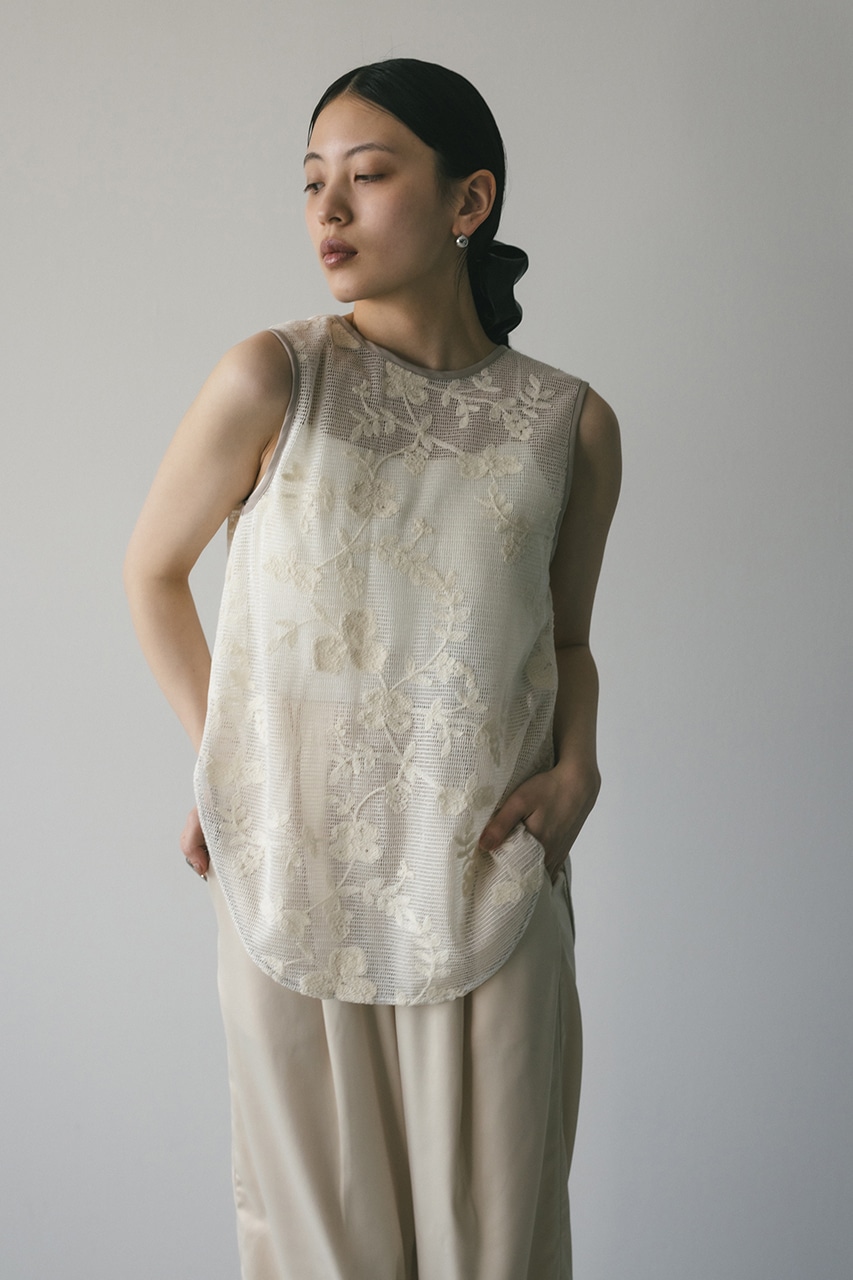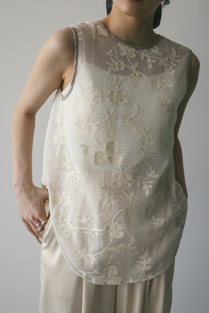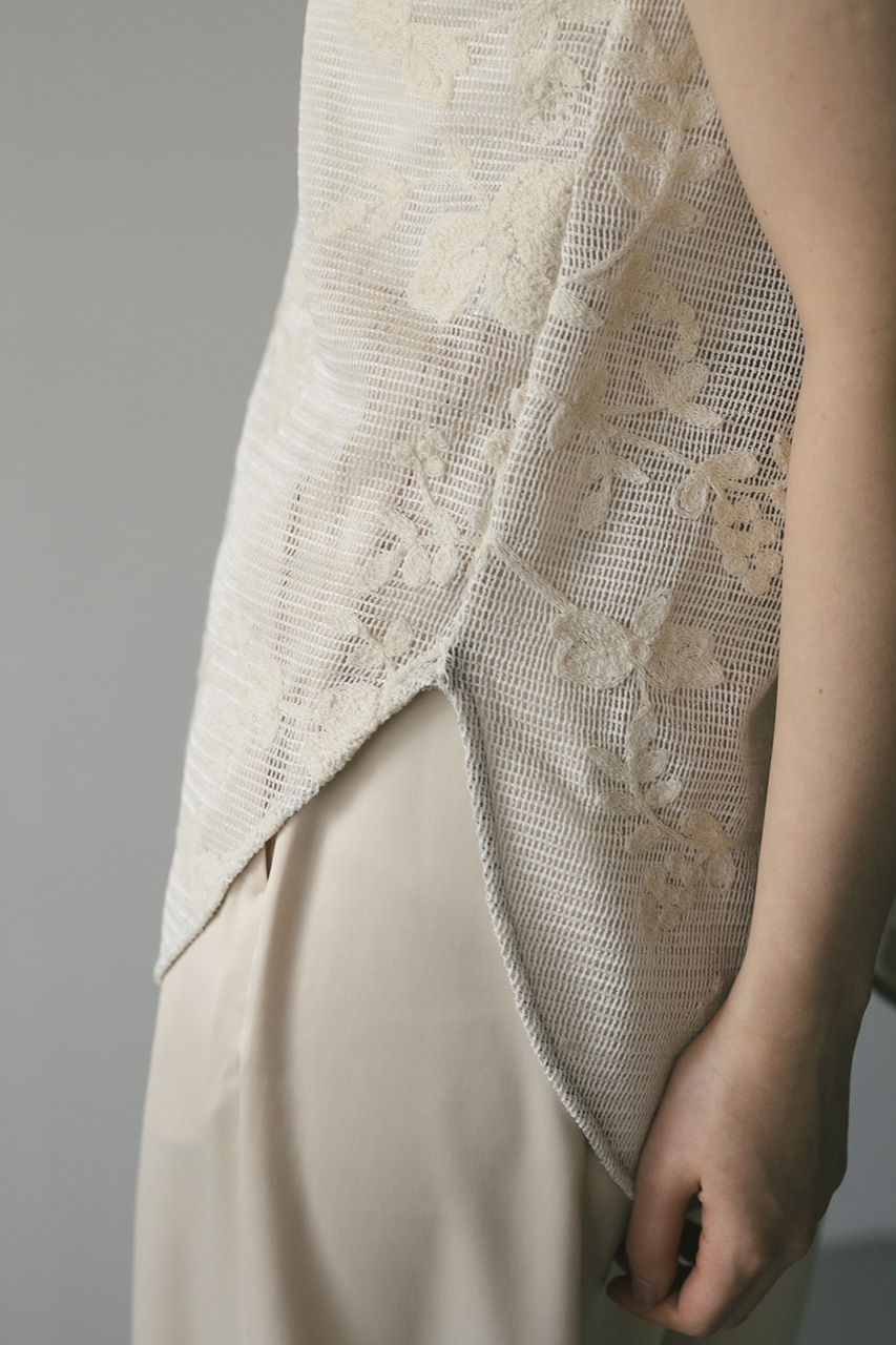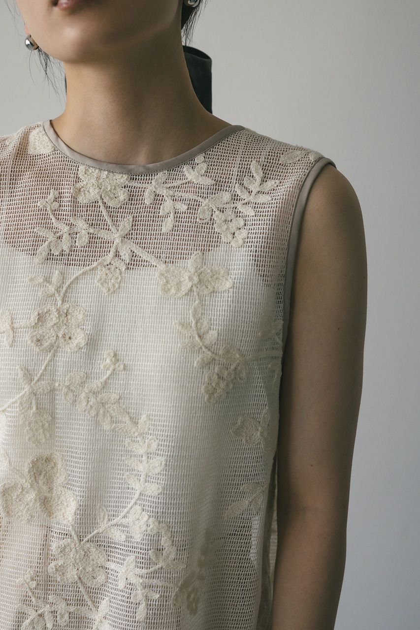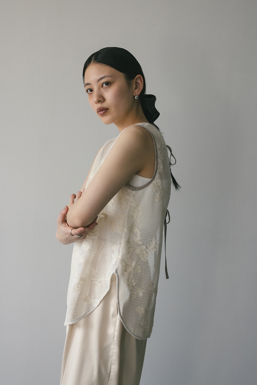 格子柄の生地にフラワー柄を刺繍した生地を使用した前後2WAYで着用できるトップス。