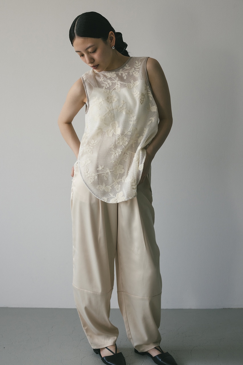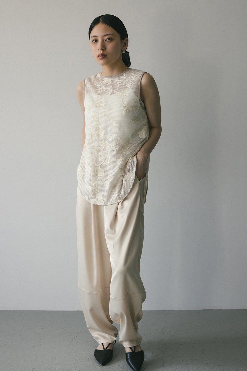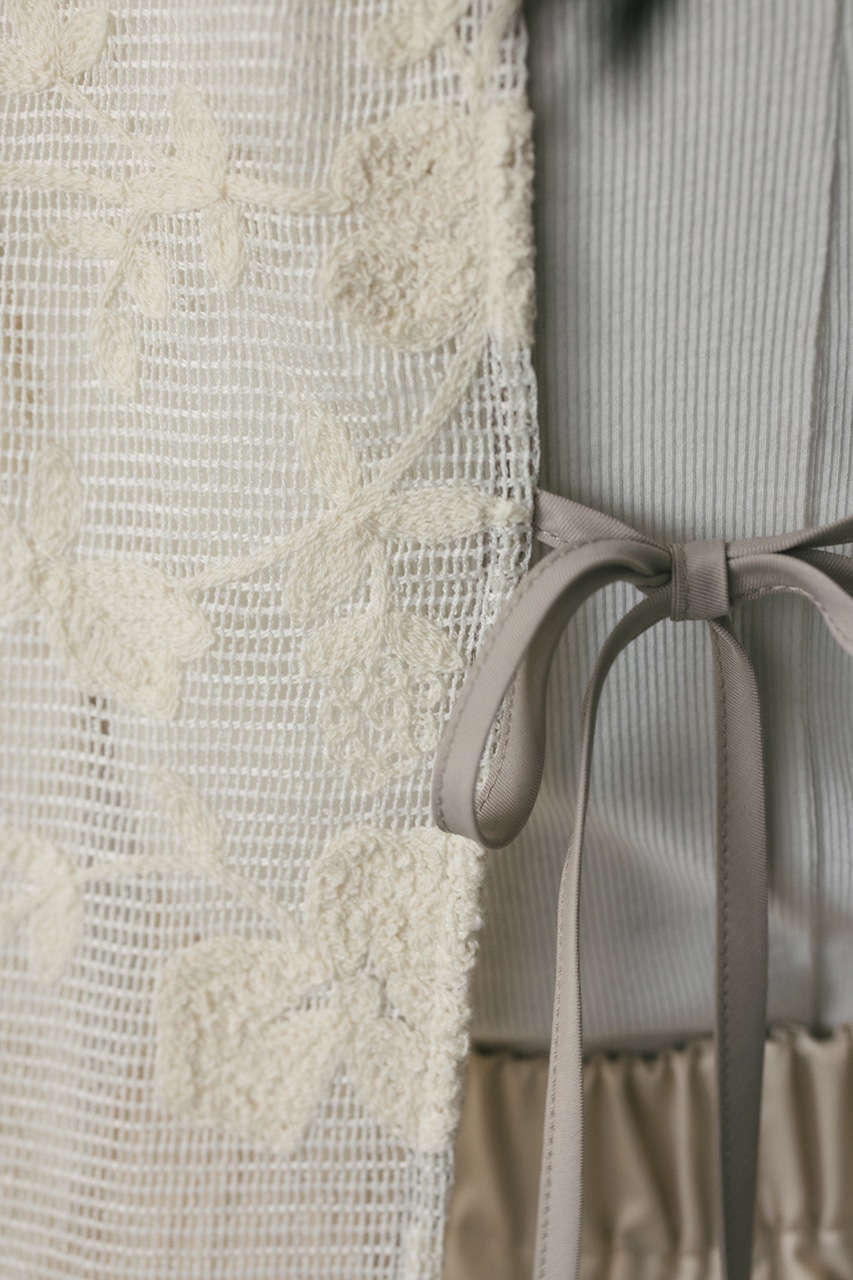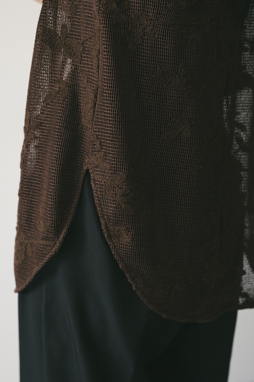 格子柄の生地にフラワー柄を刺繍した生地を使用した前後2WAYで着用できるトップス。