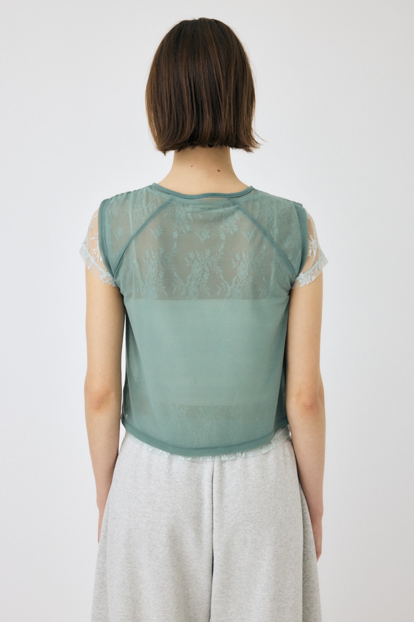 透け感の多めなレースの上に、シアー感のあるカットソー素材のトップスをレイヤードしています。