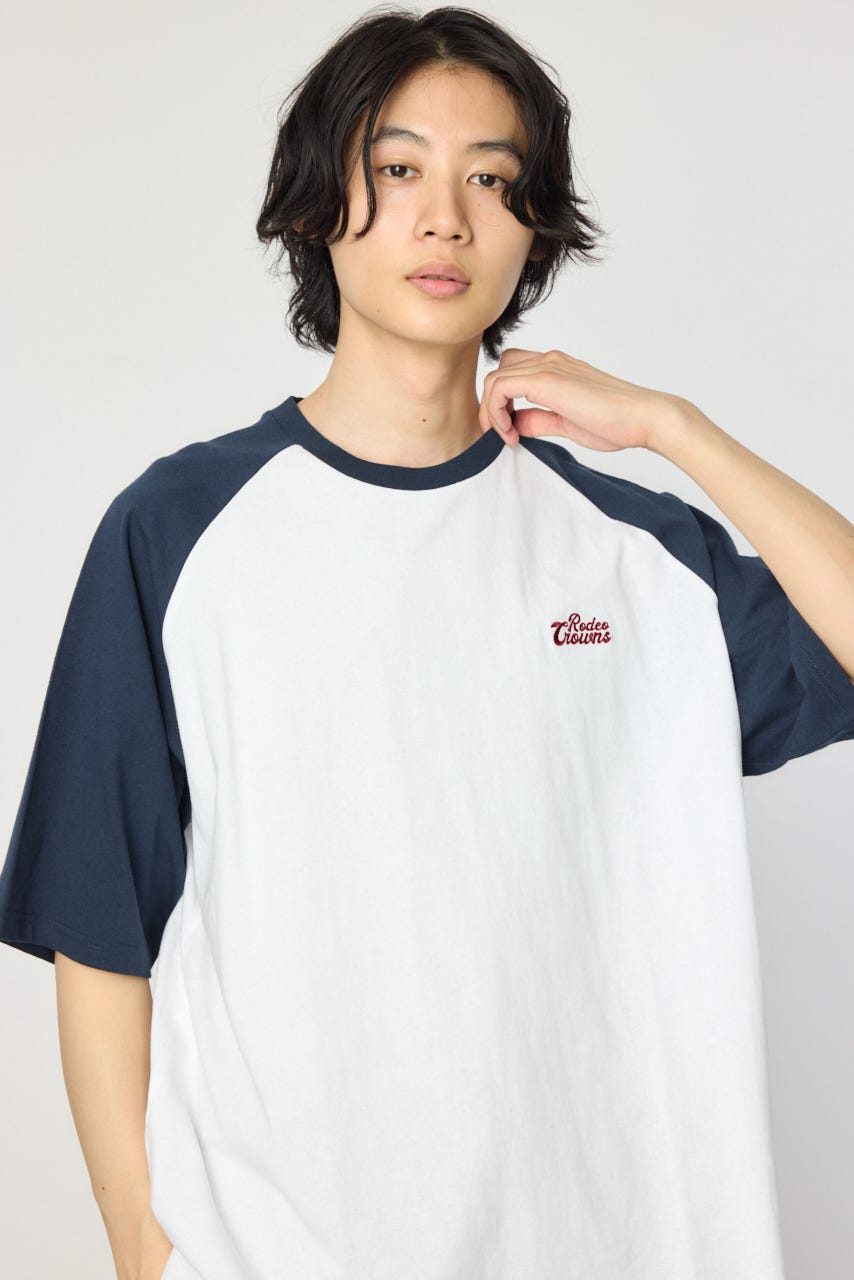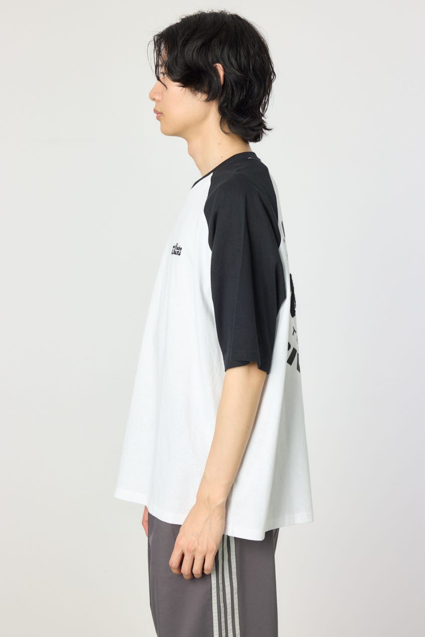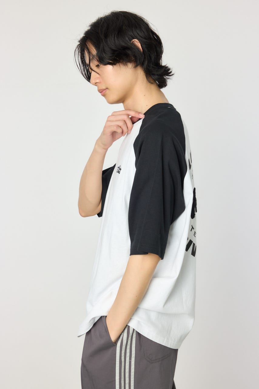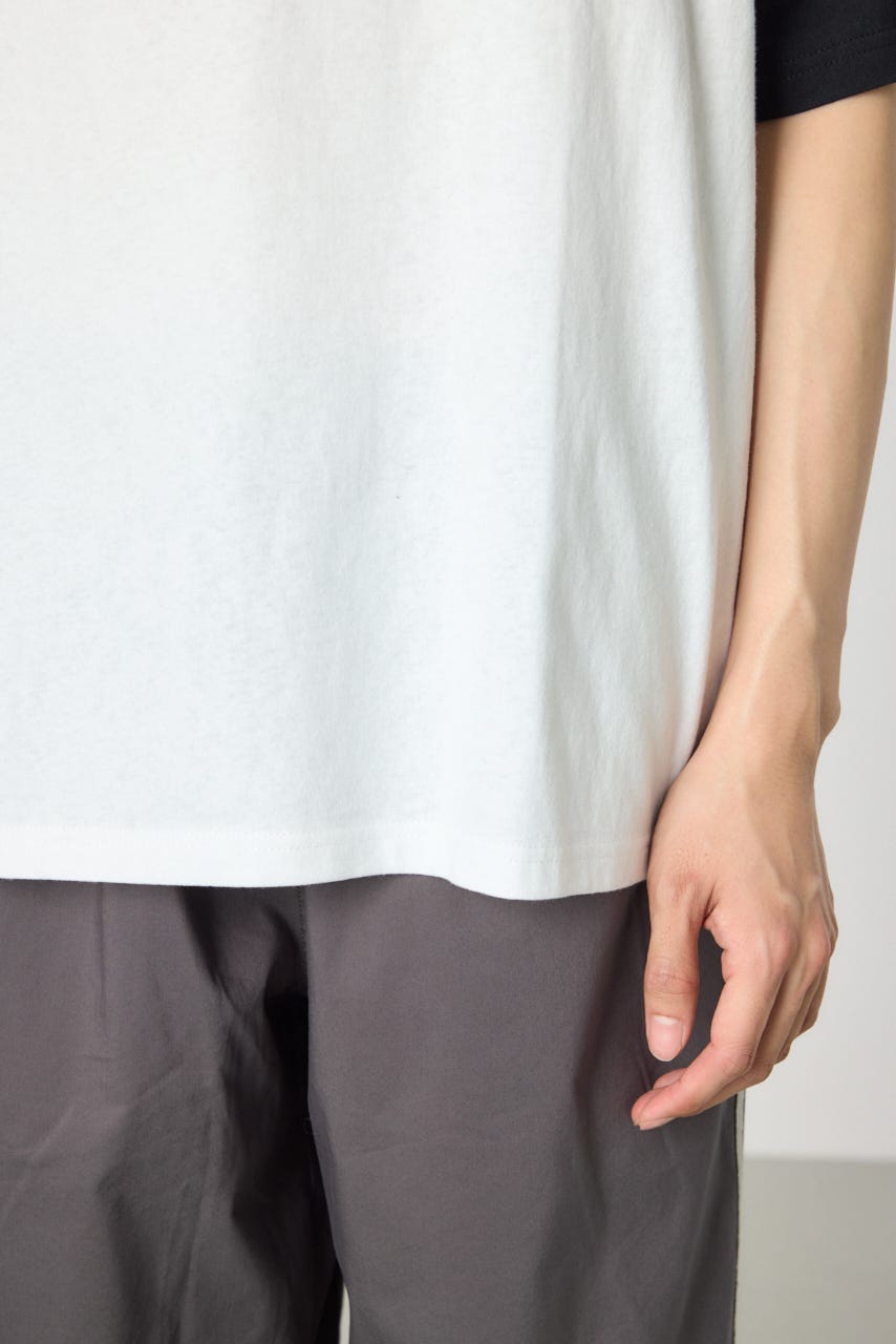 ホワイトボディをベースとした配色ラグラン切替の半袖Tシャツ。