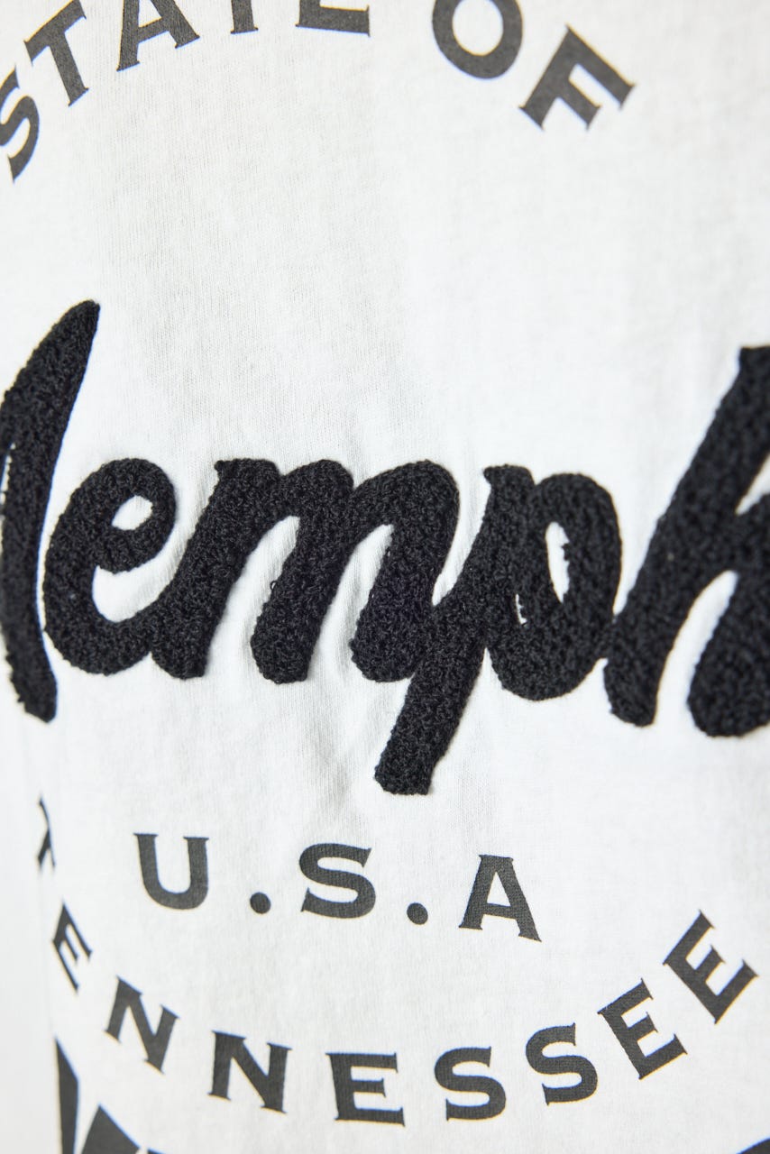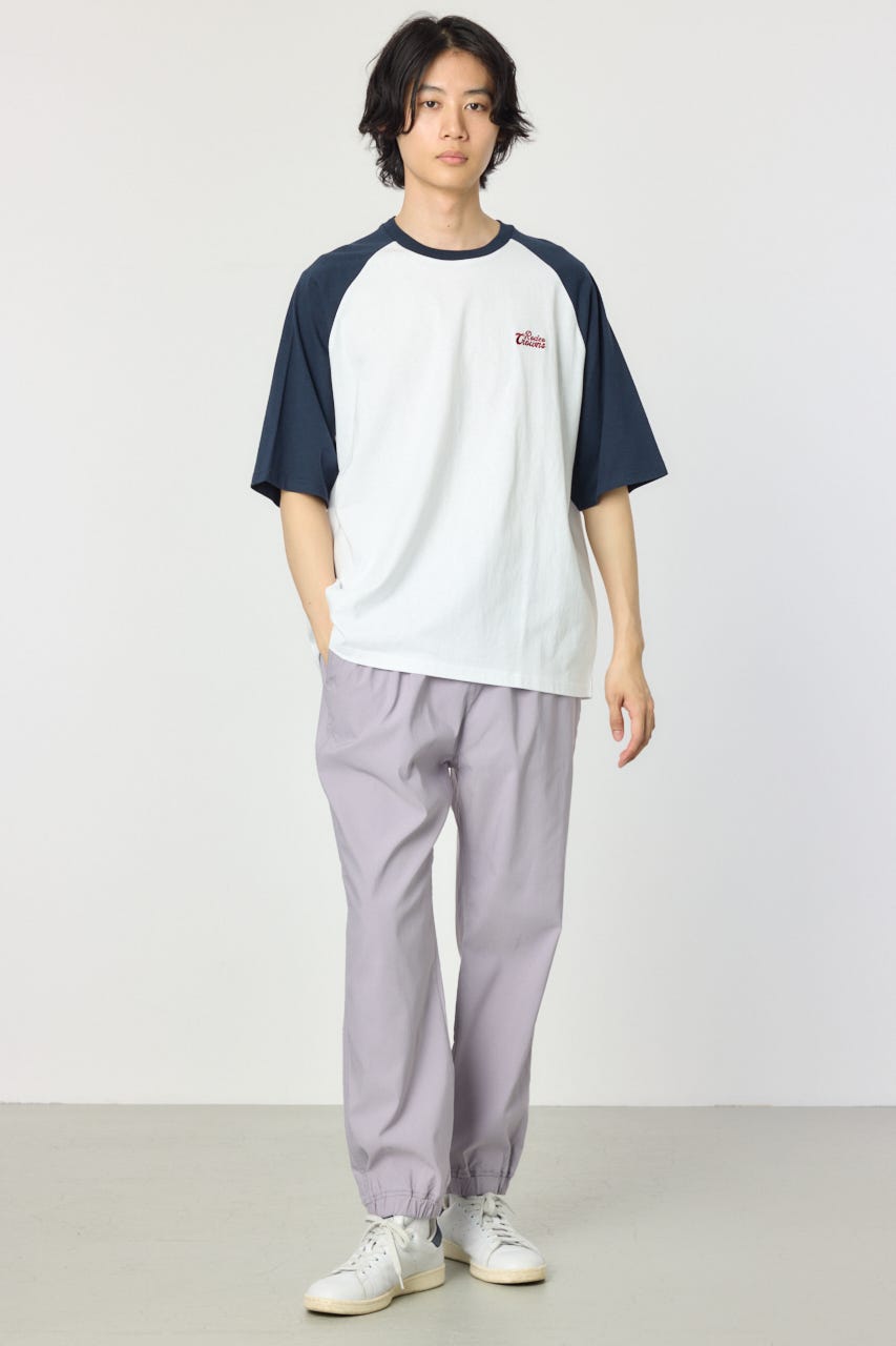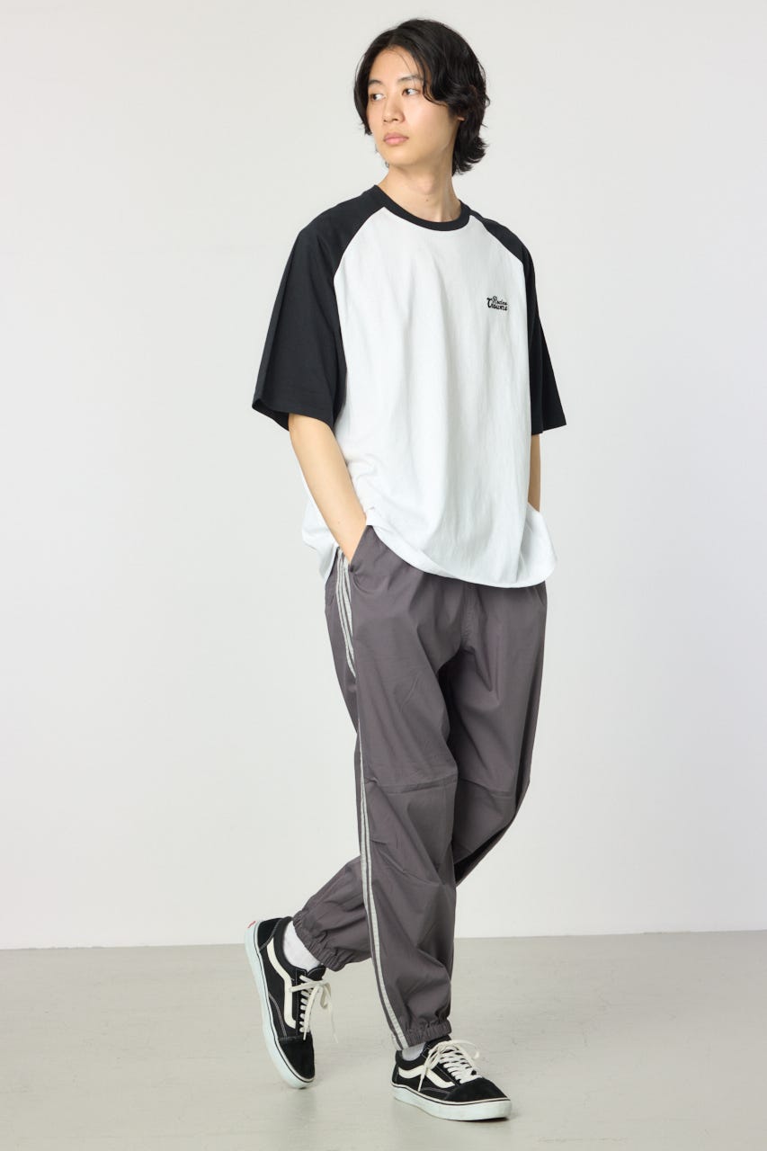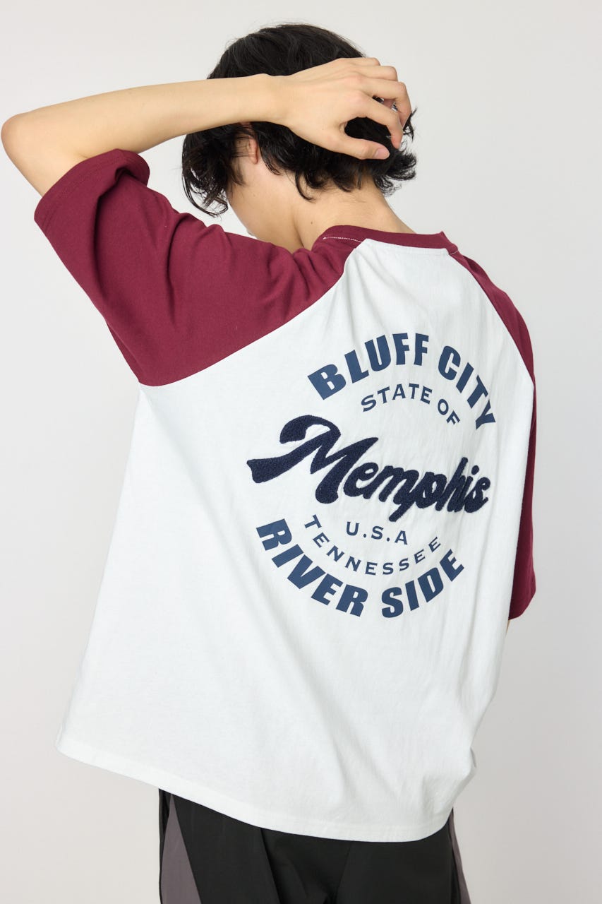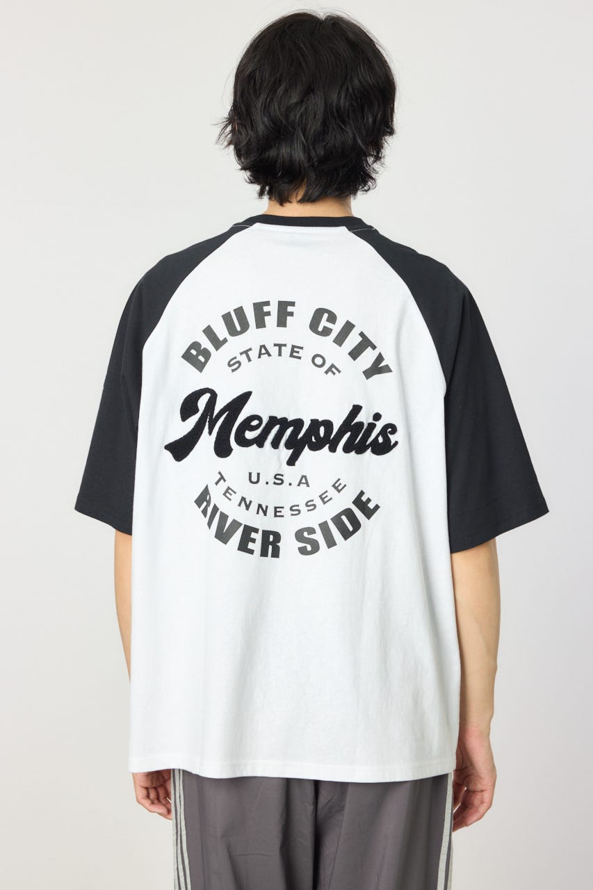 ホワイトボディをベースとした配色ラグラン切替の半袖Tシャツ。