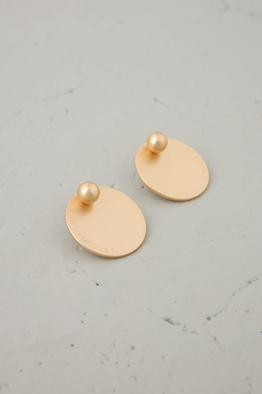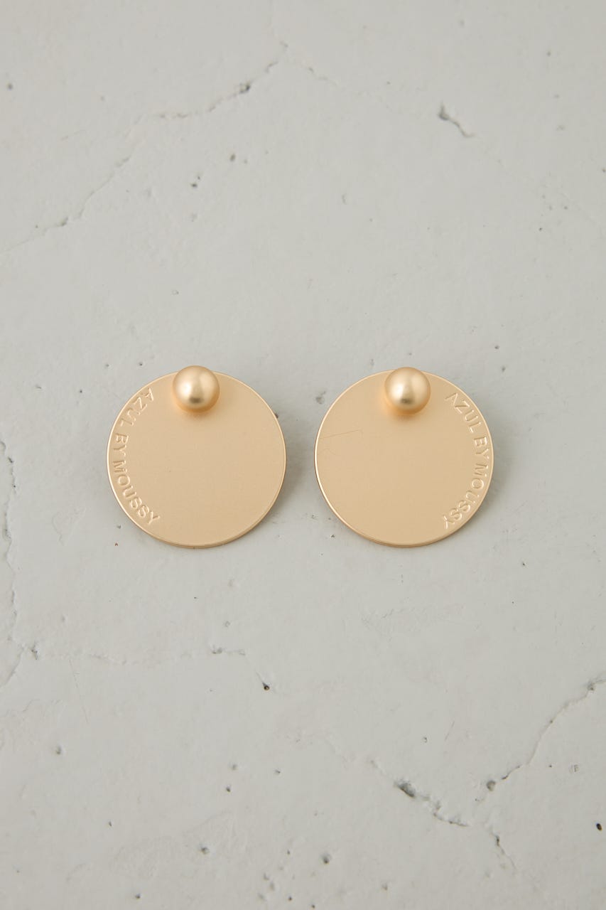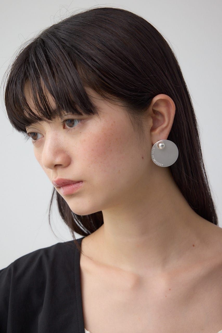 大ぶりなサークル型プレートにロゴをさりげなくあしらった、シンプルながらも存在感のあるピアス。