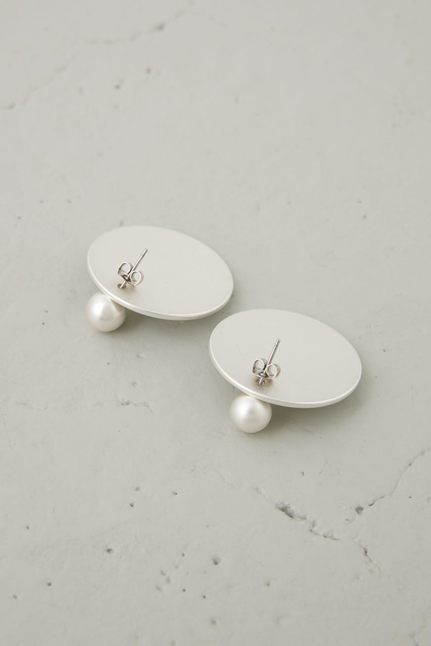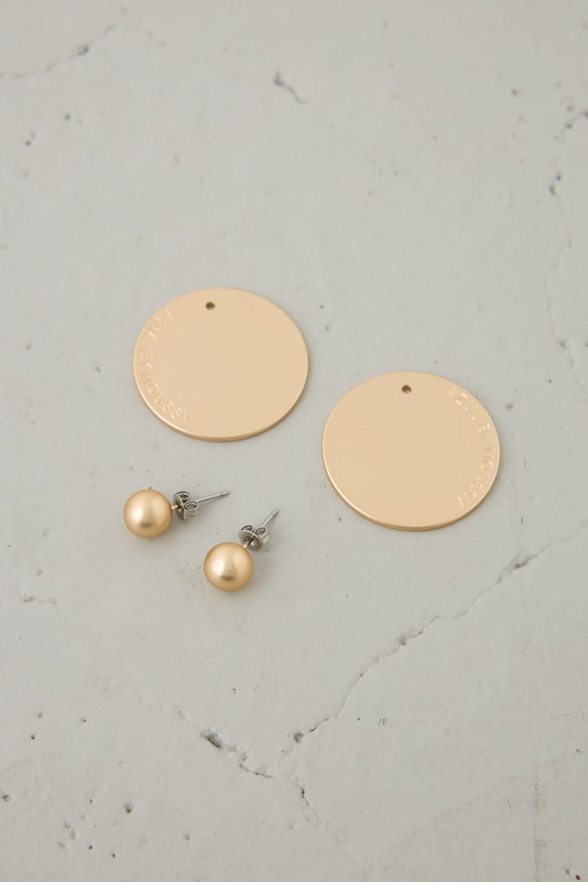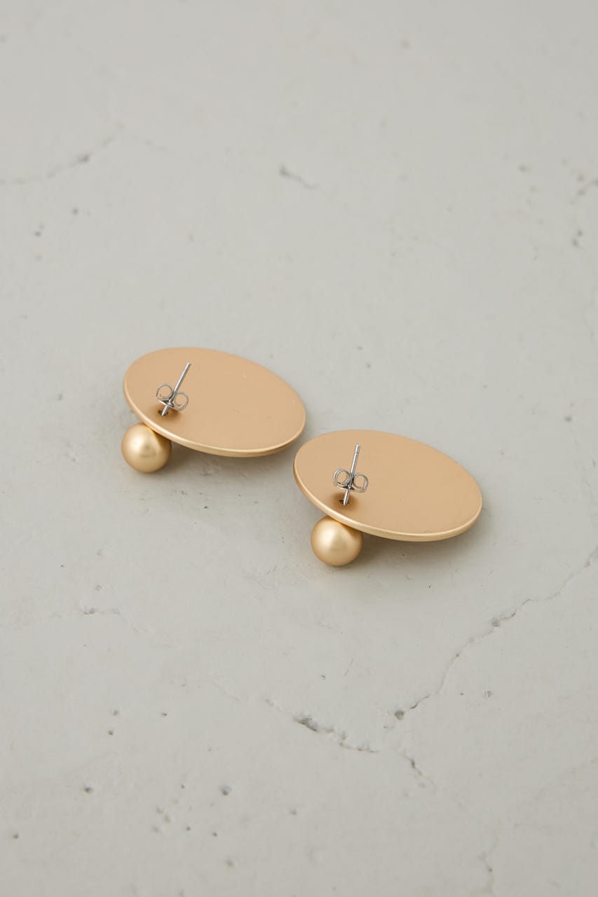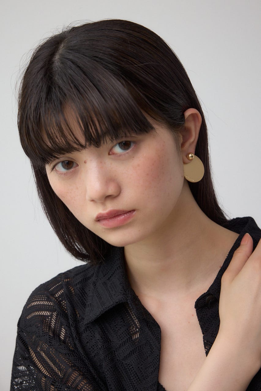 大ぶりなサークル型プレートにロゴをさりげなくあしらった、シンプルながらも存在感のあるピアス。