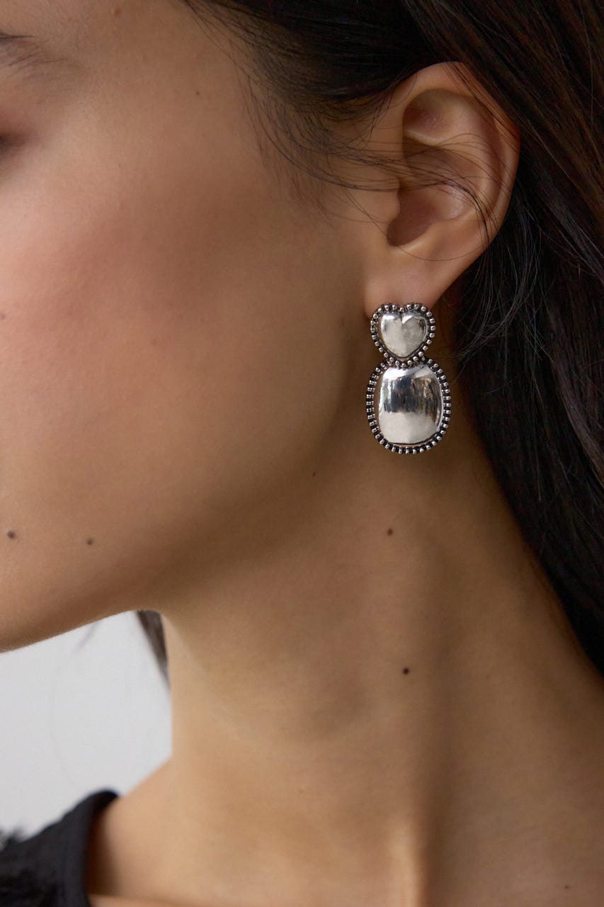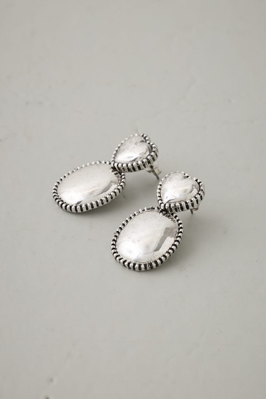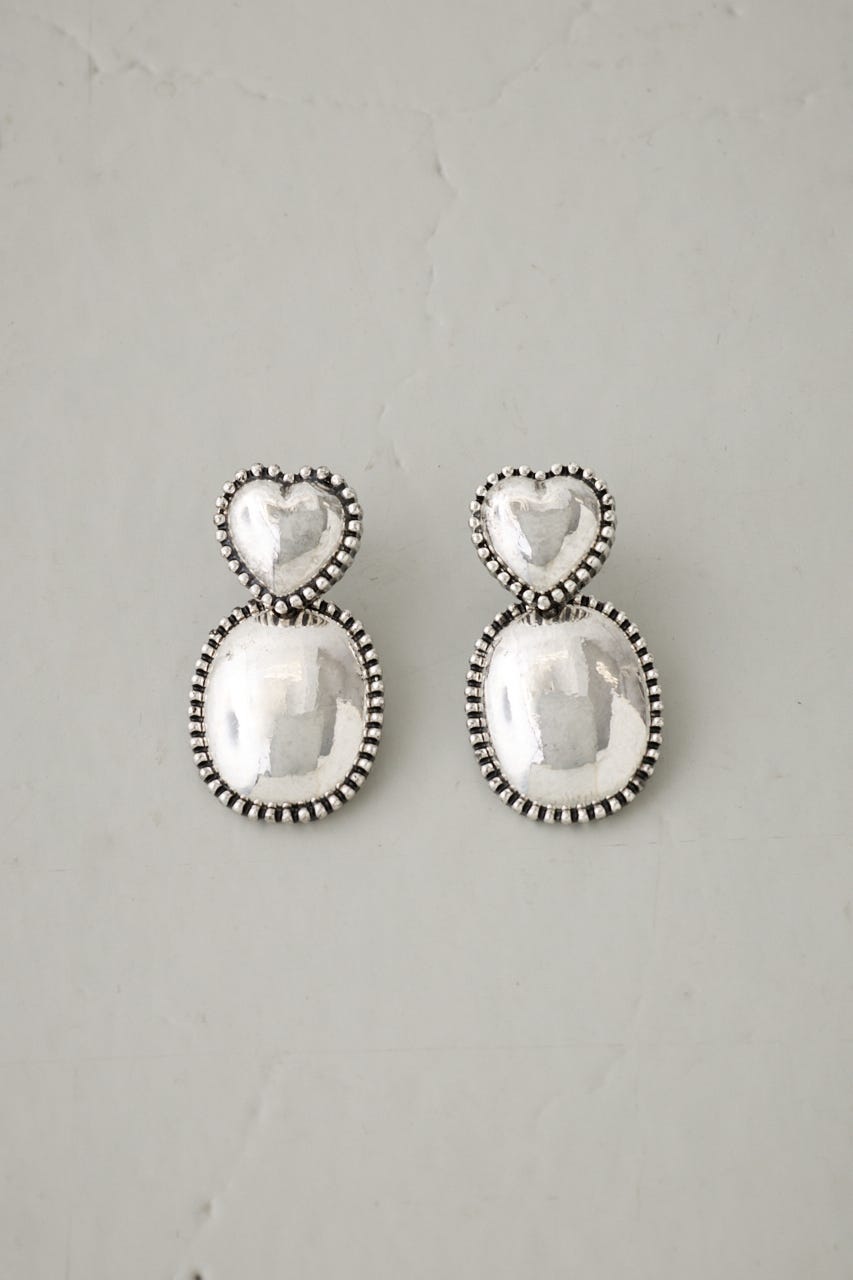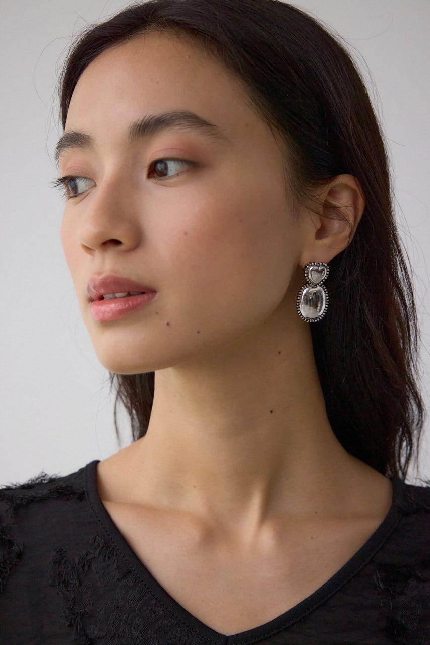 上部にハート、下部に楕円モチーフをあしらった2連デザインで、顔まわりに動きと個性をプラスしてくれるアイテムです。