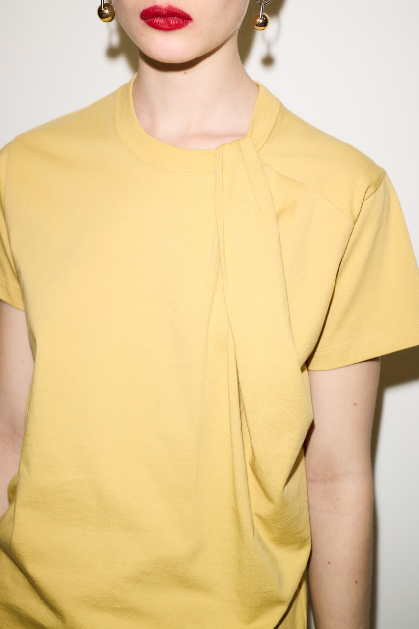 ■POINT:襟ぐりにツイストタックディテールを取り入れたデザインが目を惹くトップス。