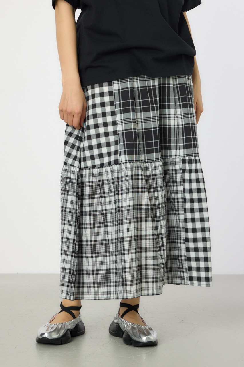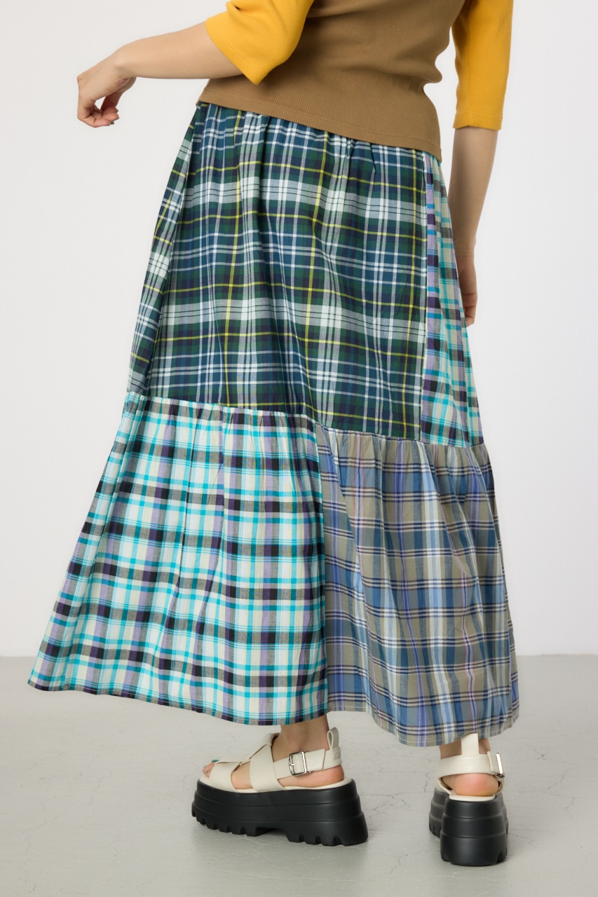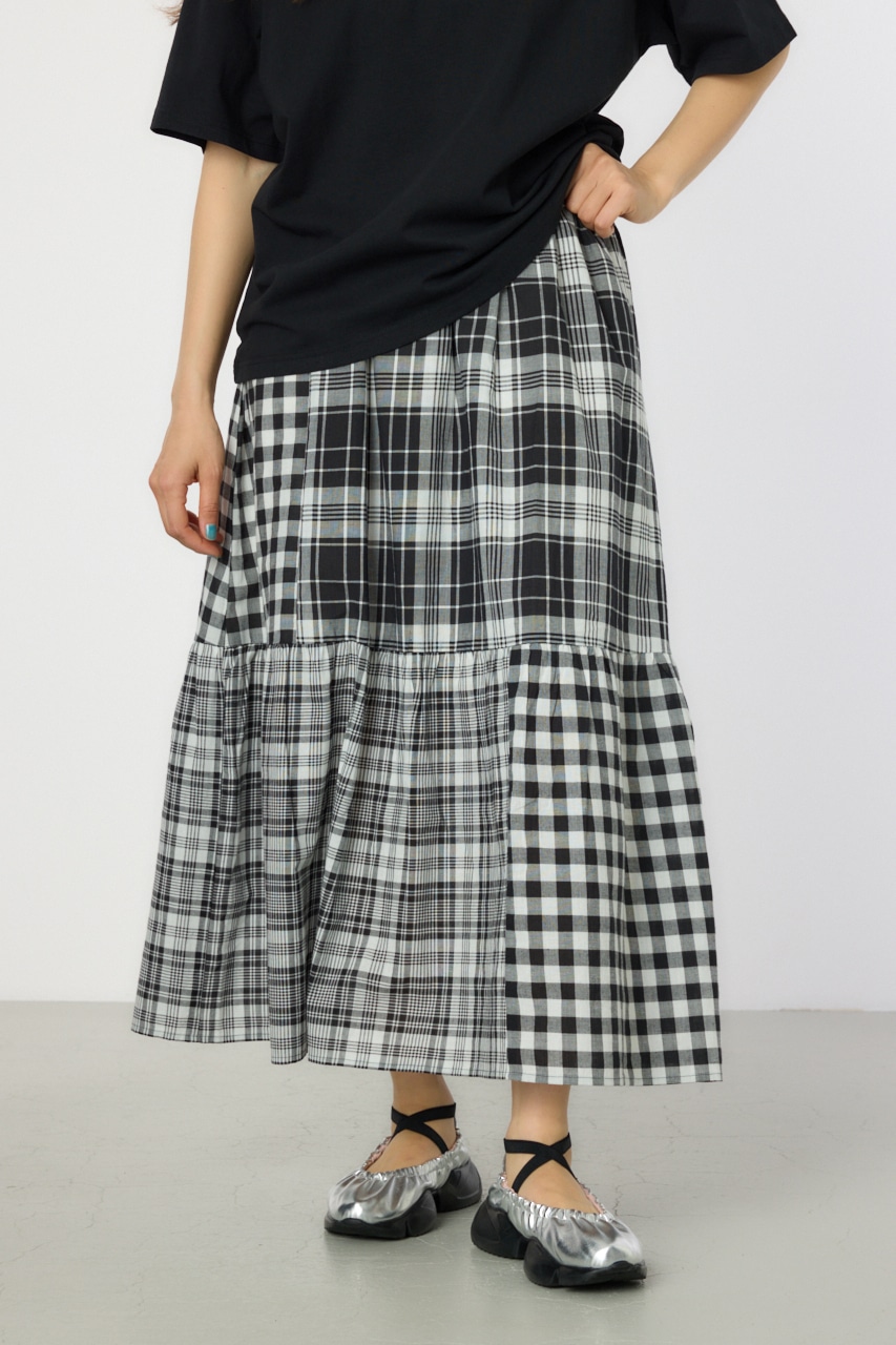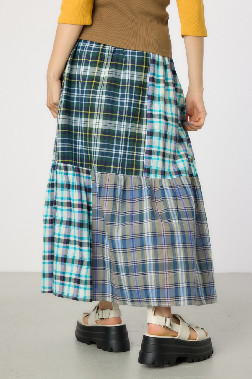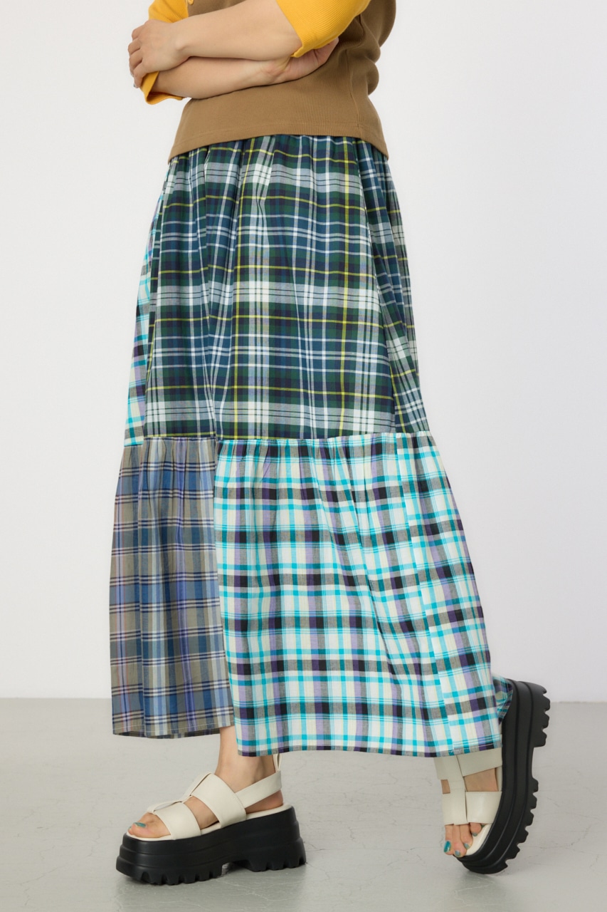 3種類の異なるチェック生地をパッチワーク状に仕上げたティアードスカート。