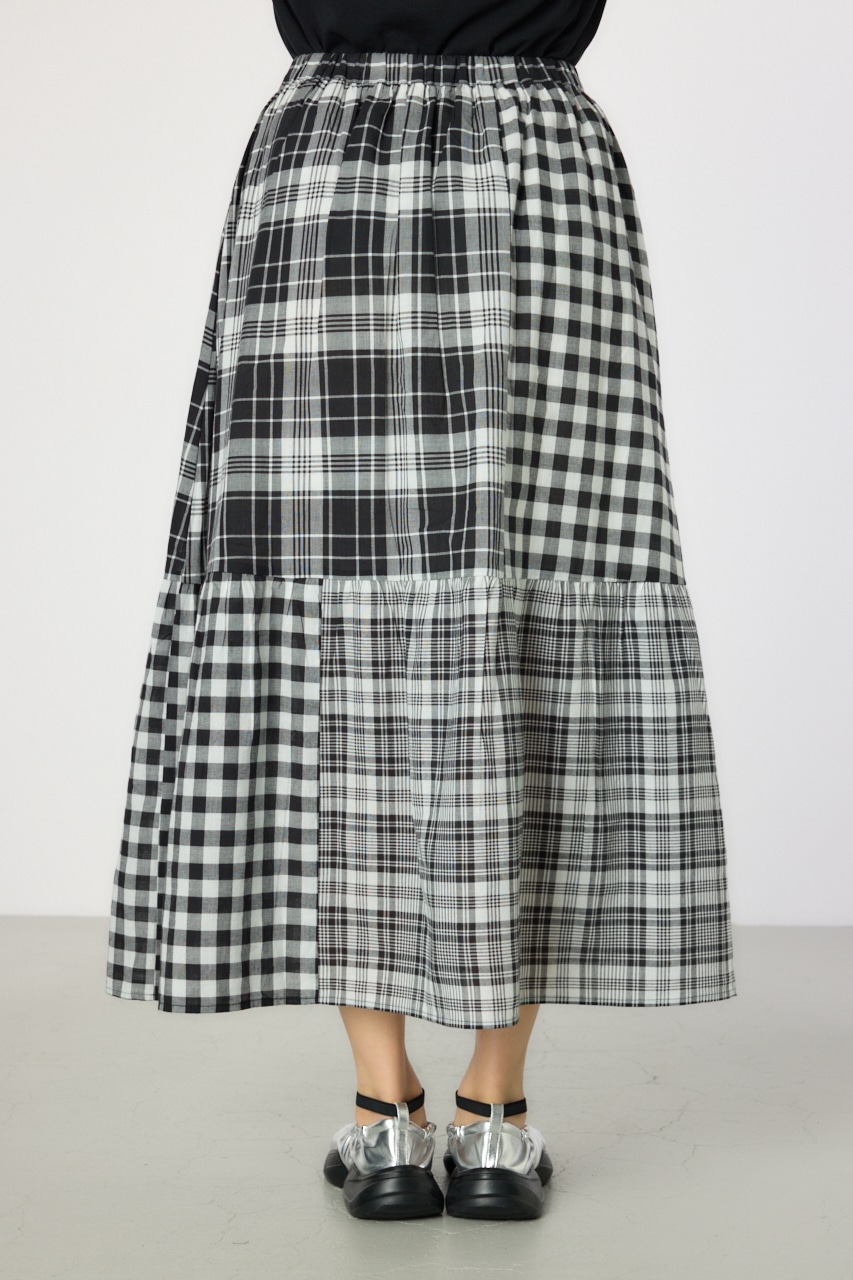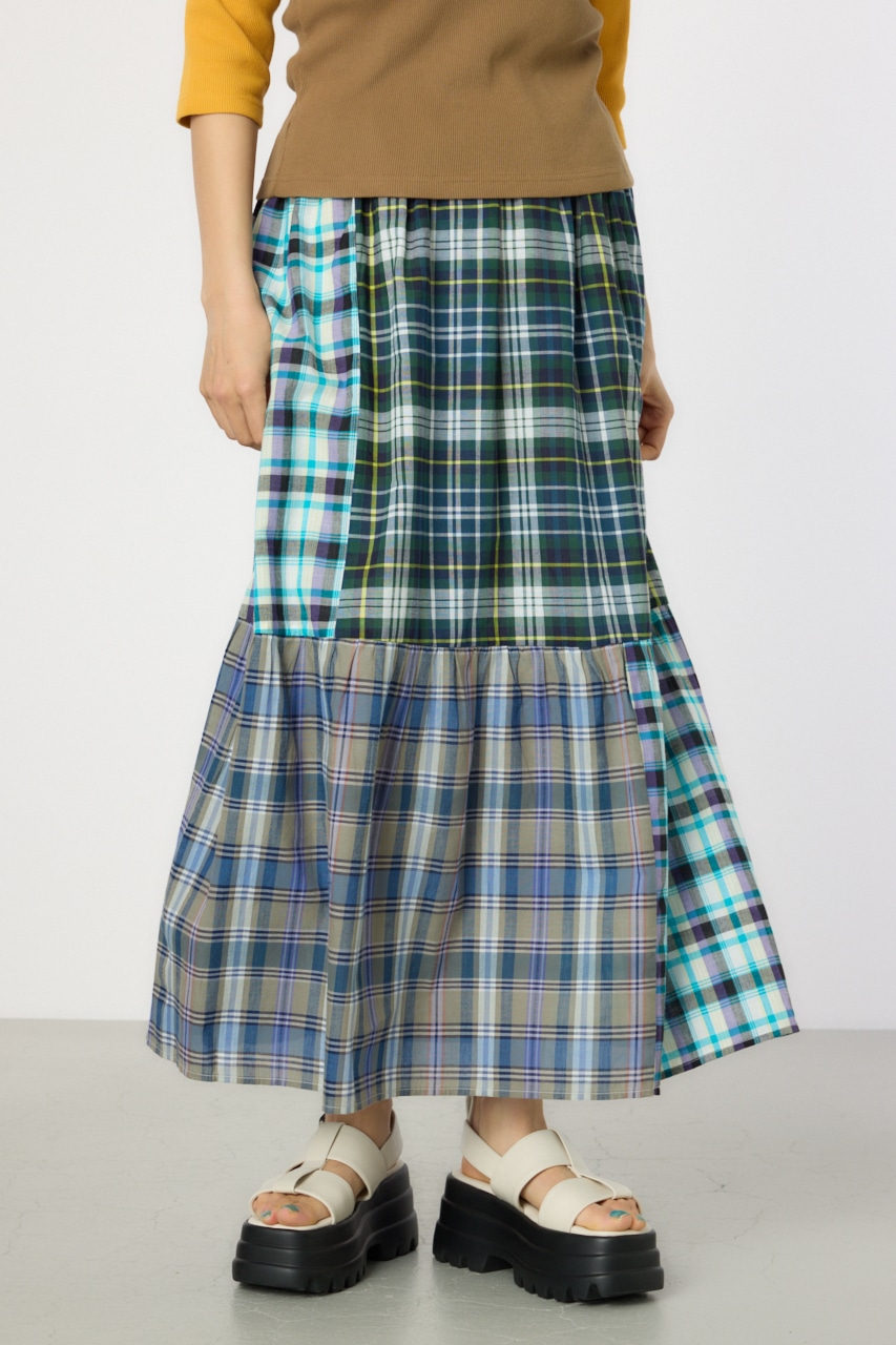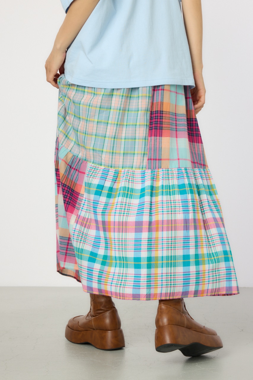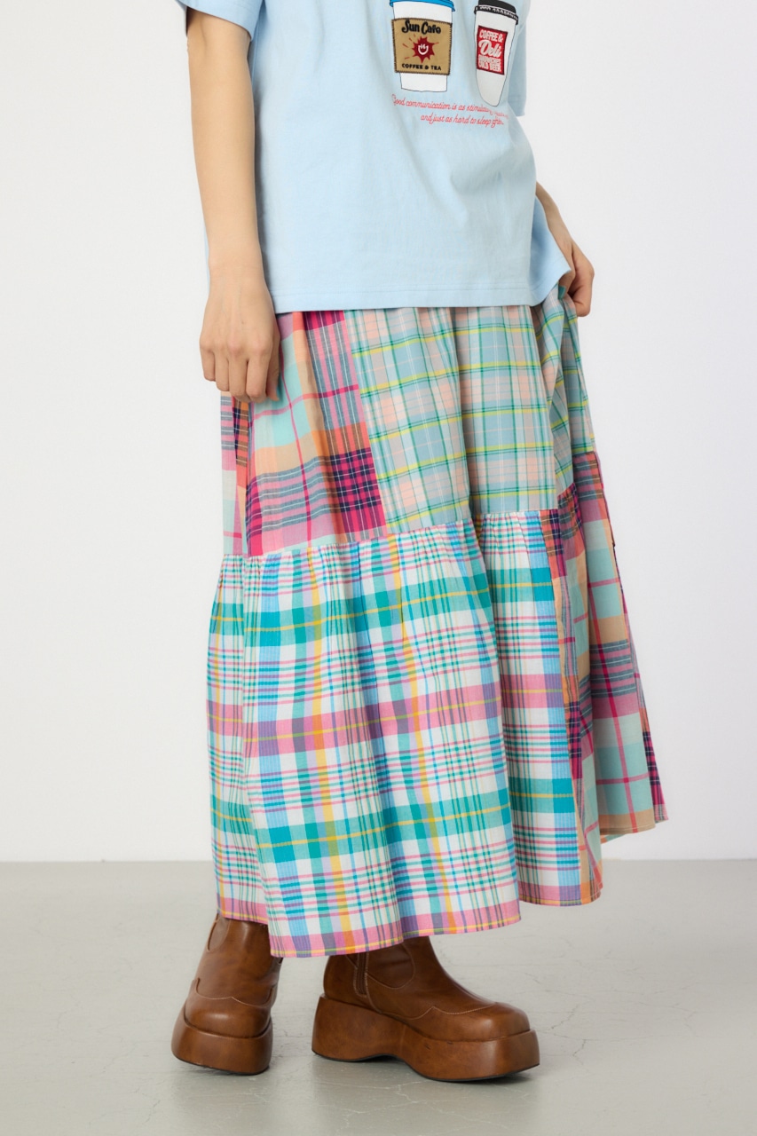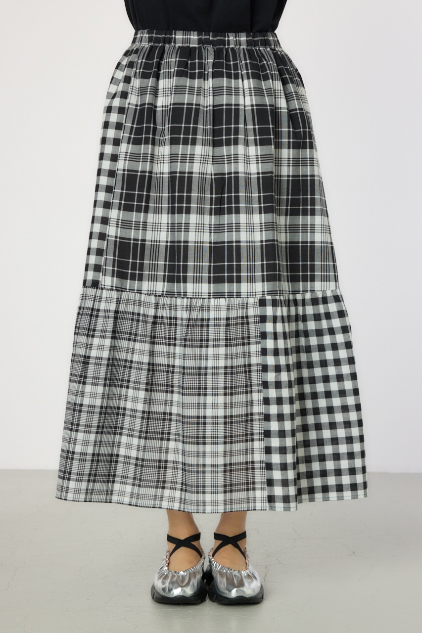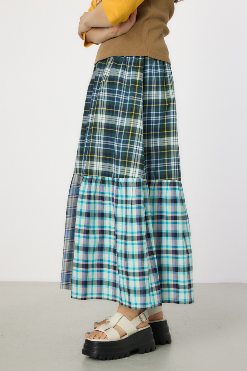 3種類の異なるチェック生地をパッチワーク状に仕上げたティアードスカート。