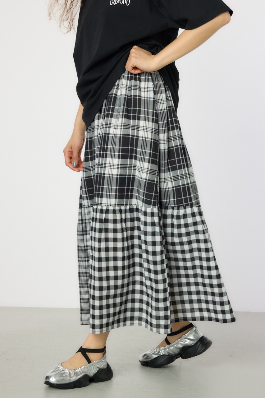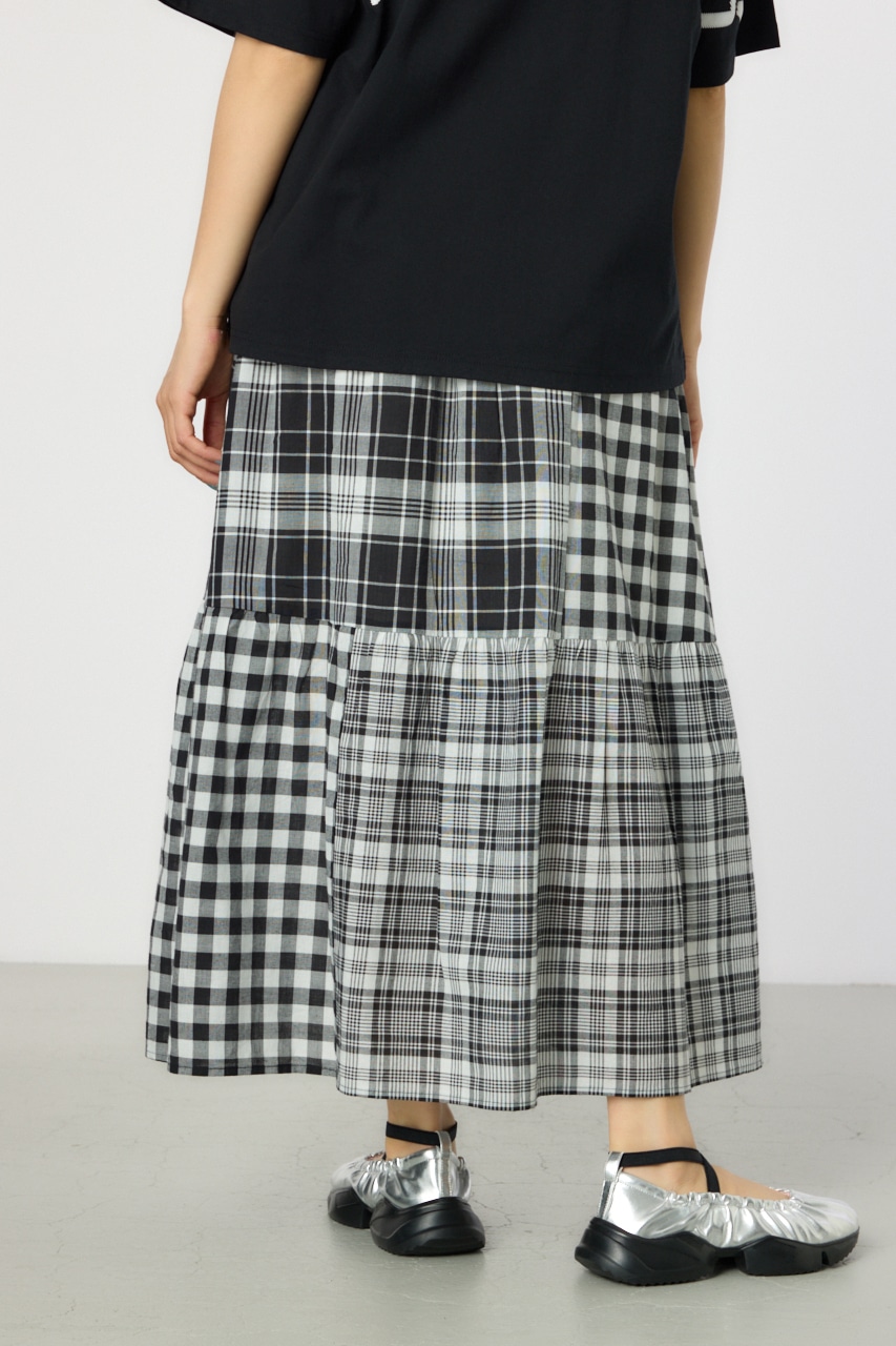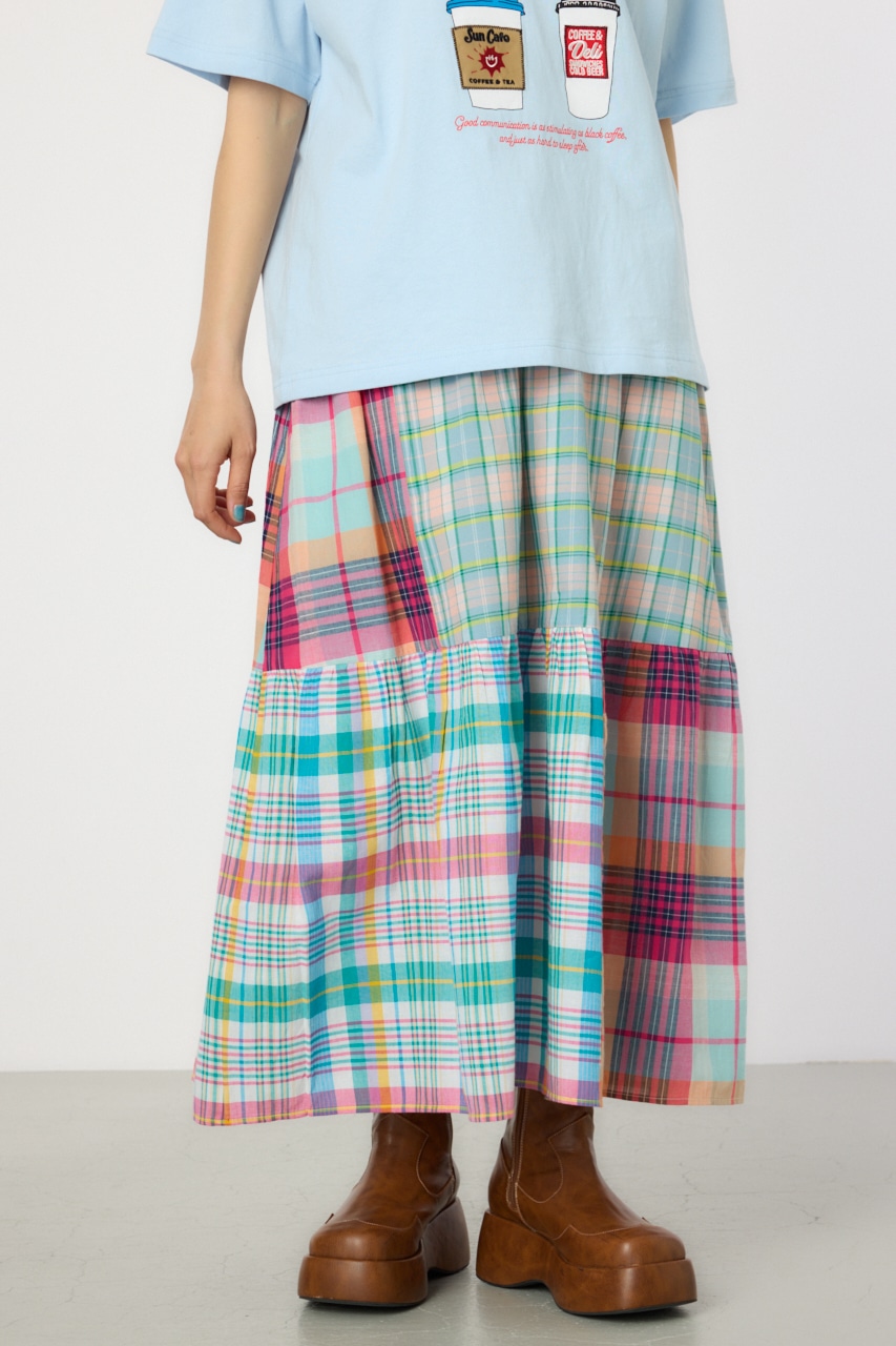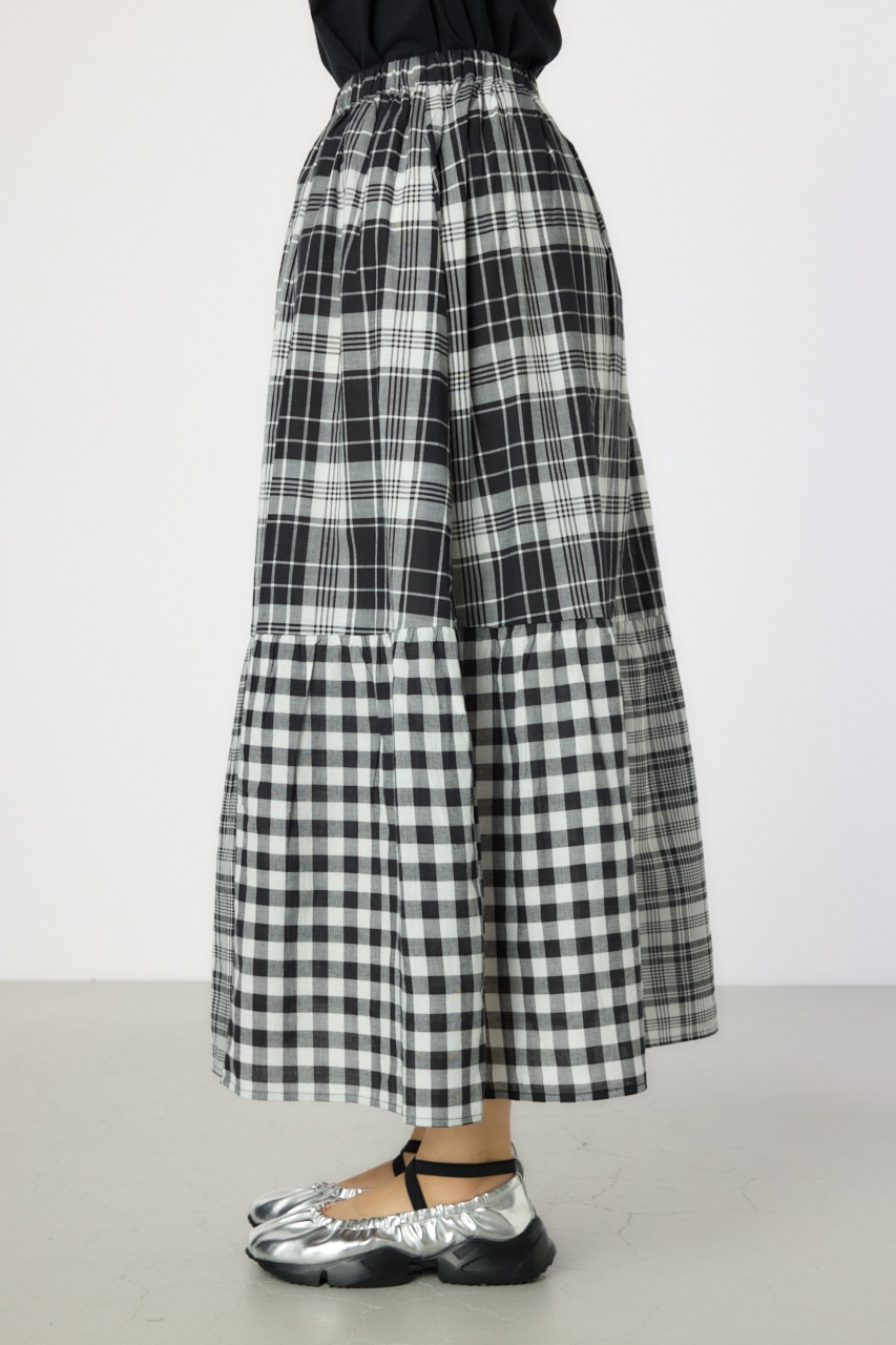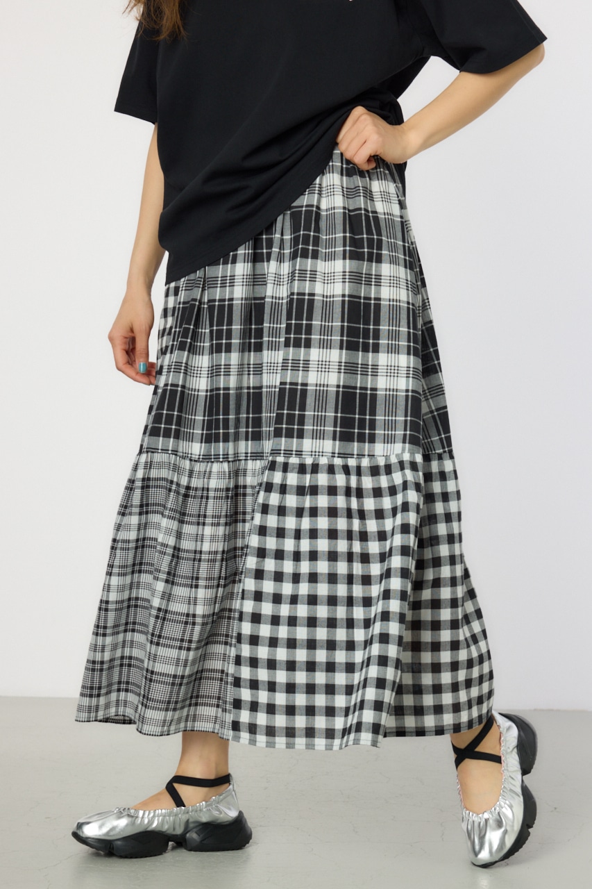 3種類の異なるチェック生地をパッチワーク状に仕上げたティアードスカート。