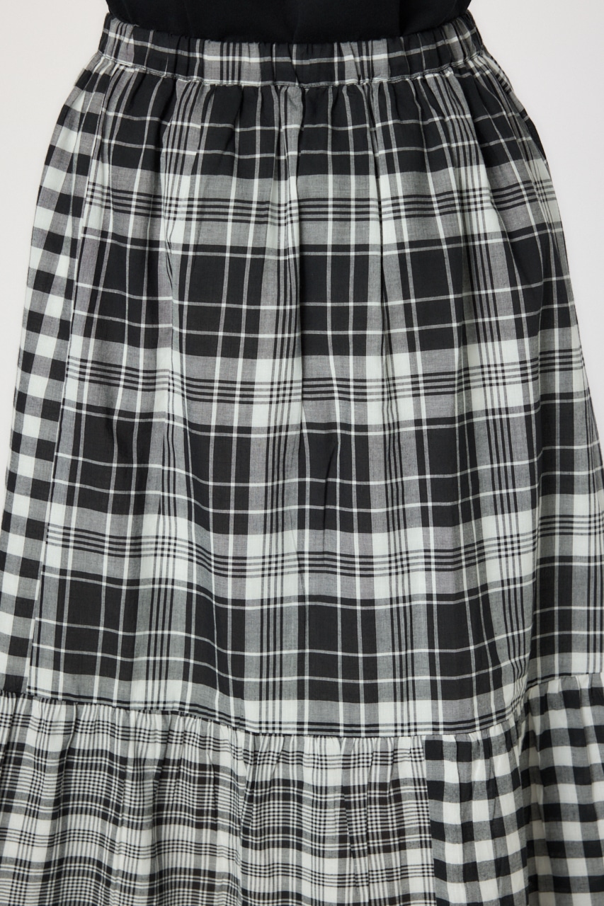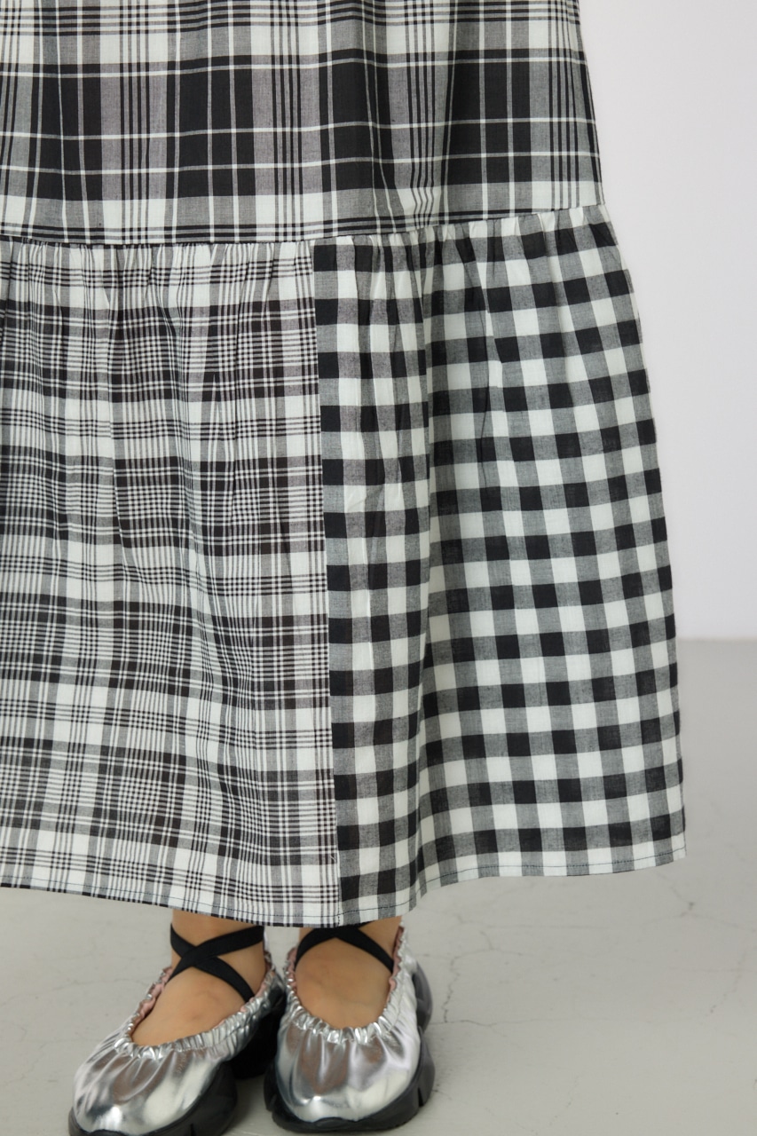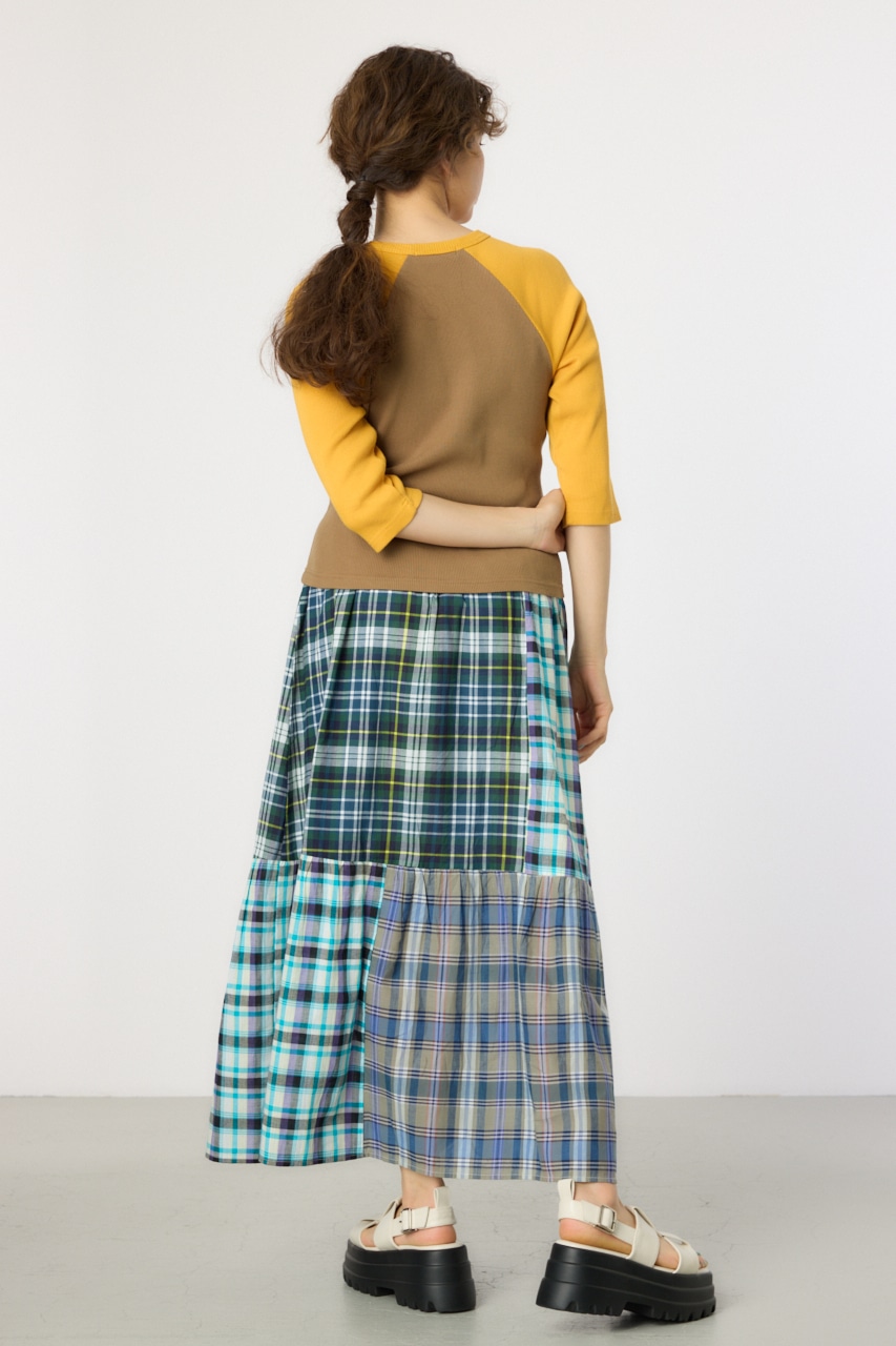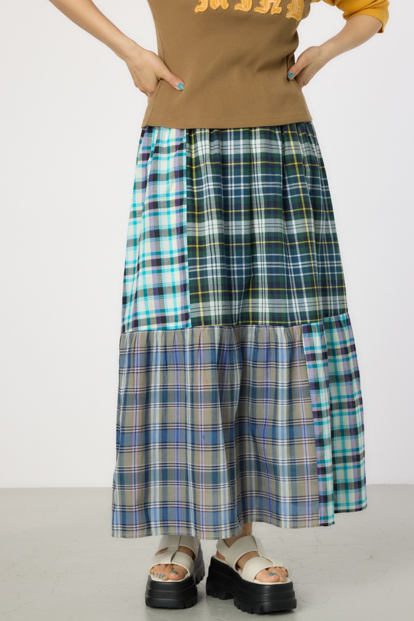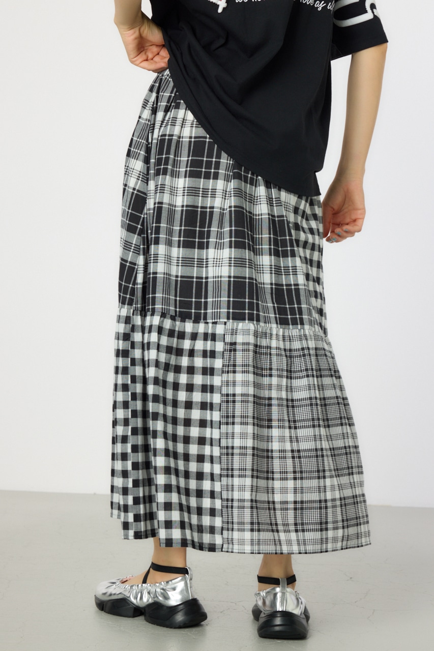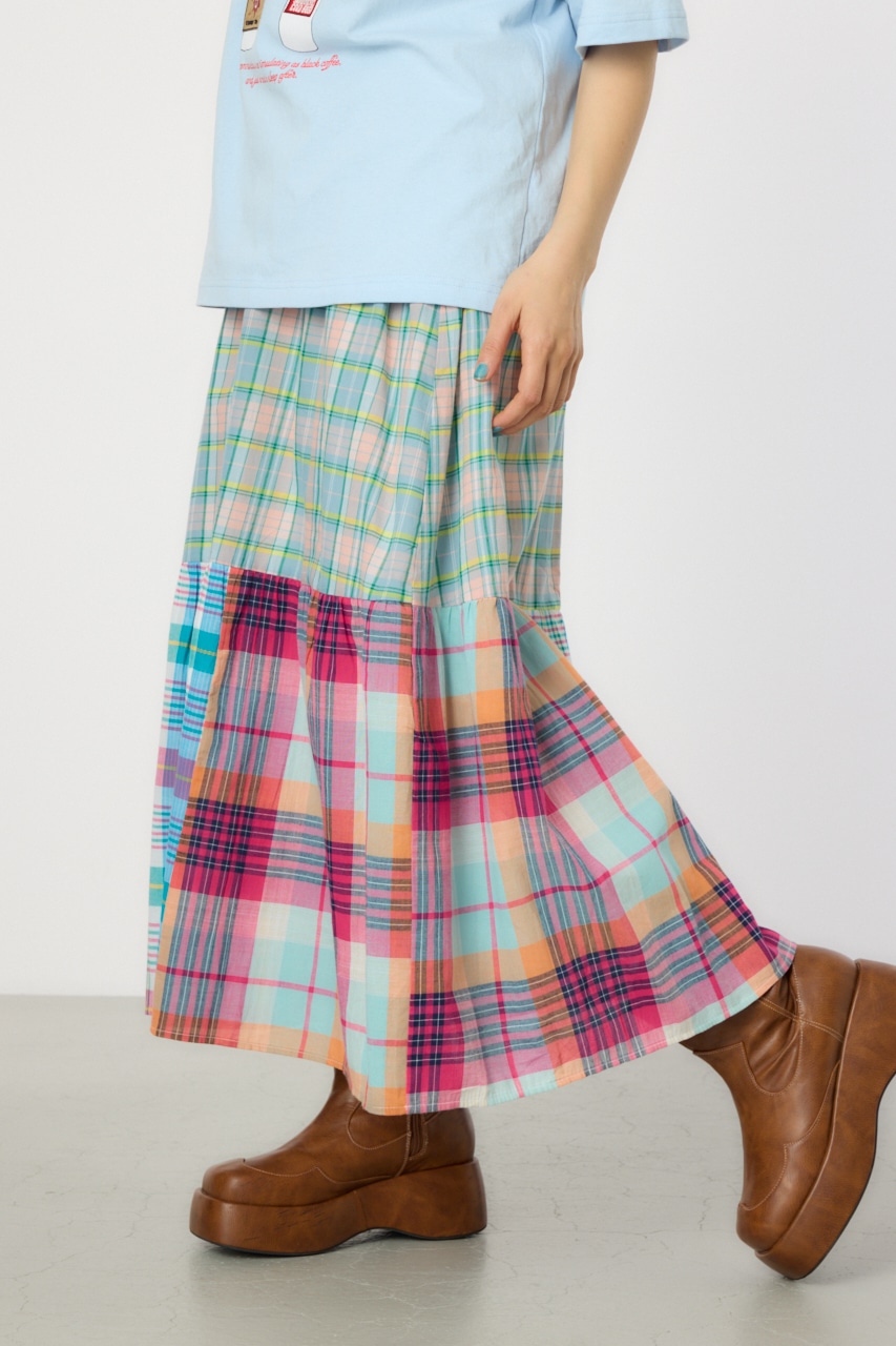 3種類の異なるチェック生地をパッチワーク状に仕上げたティアードスカート。