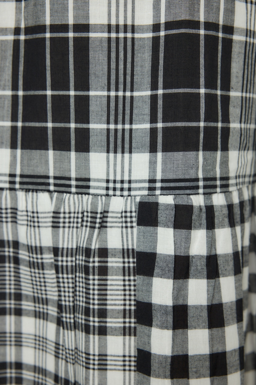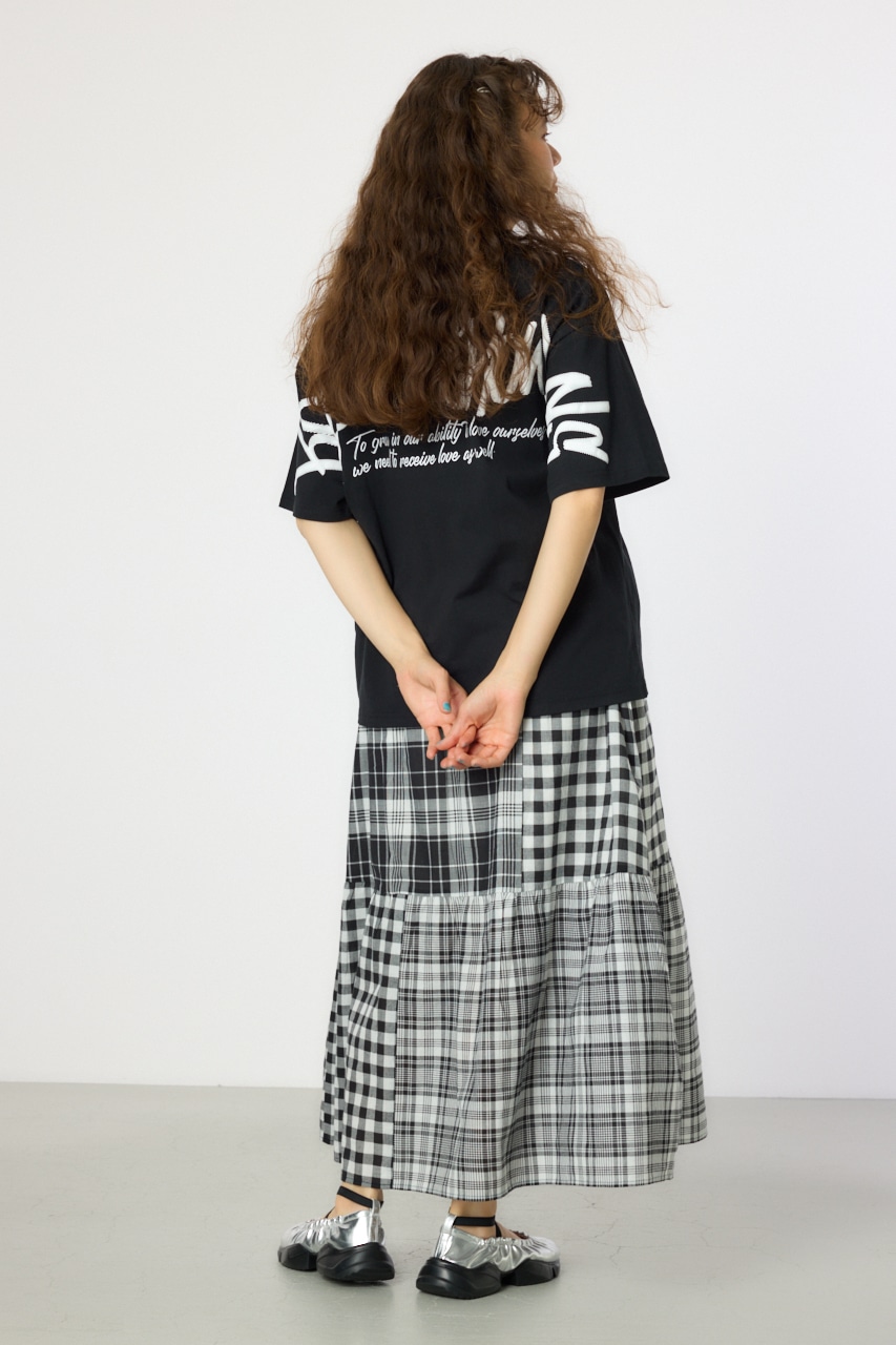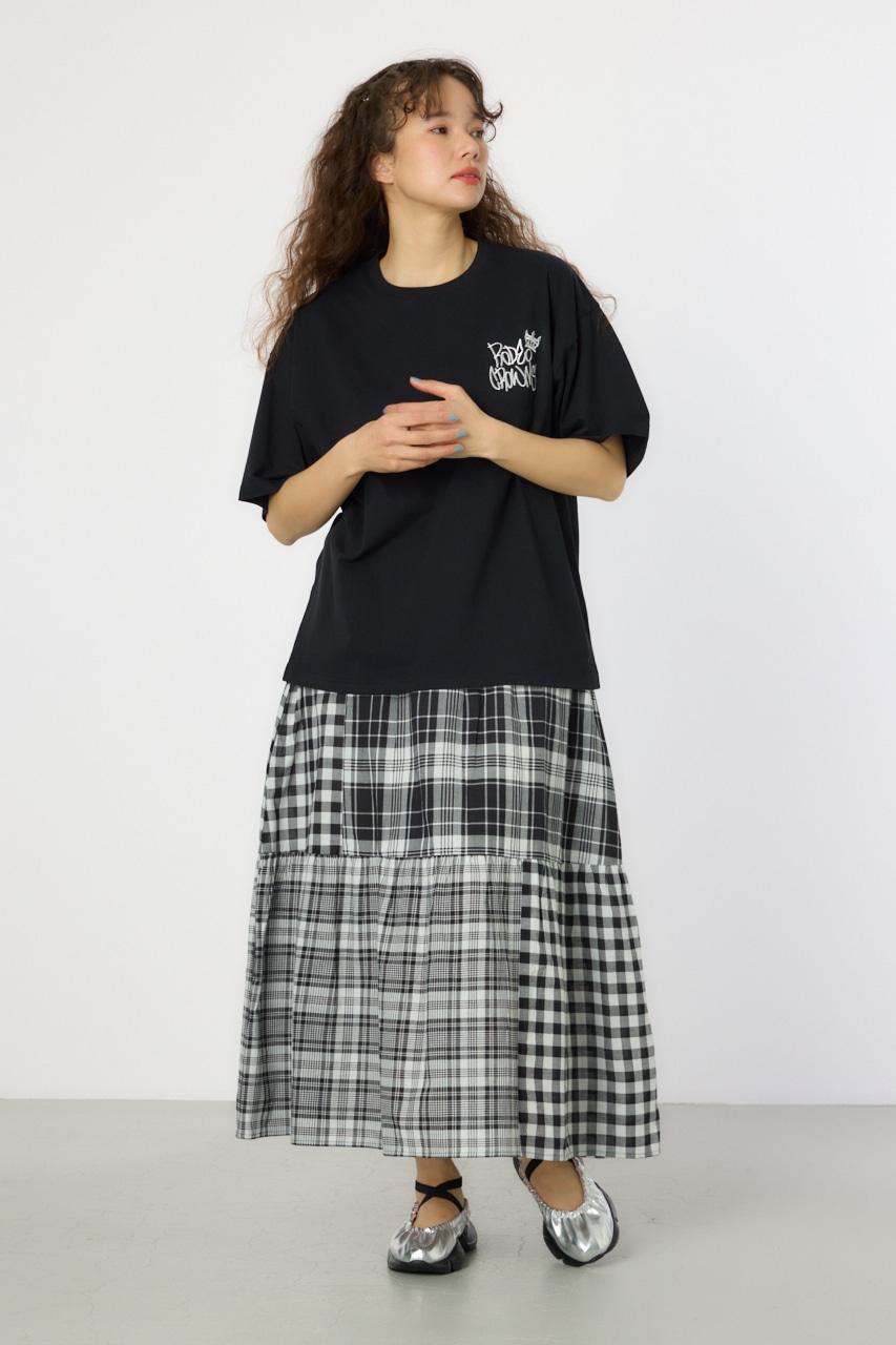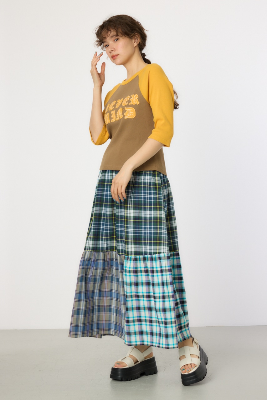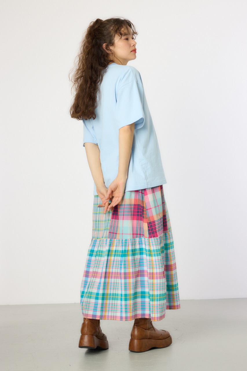 3種類の異なるチェック生地をパッチワーク状に仕上げたティアードスカート。
