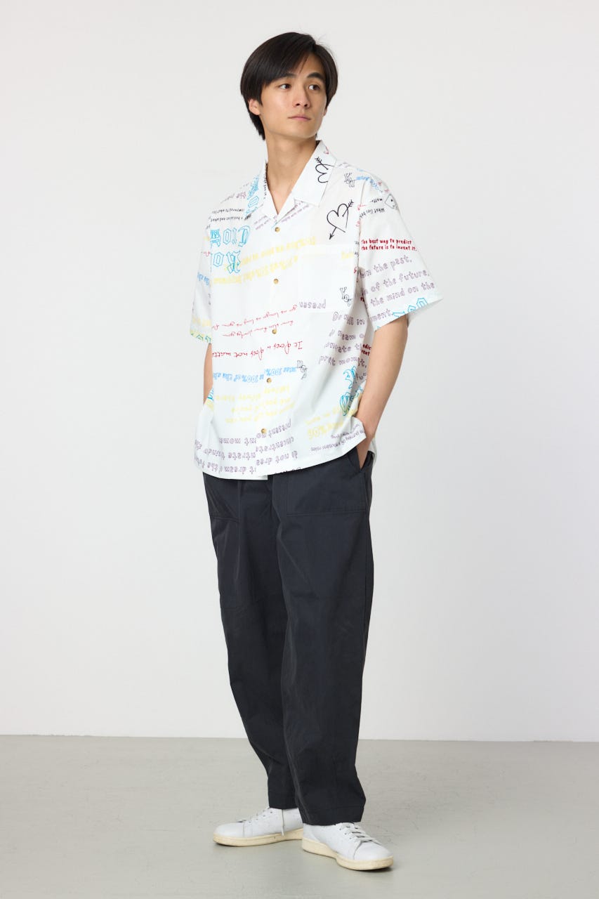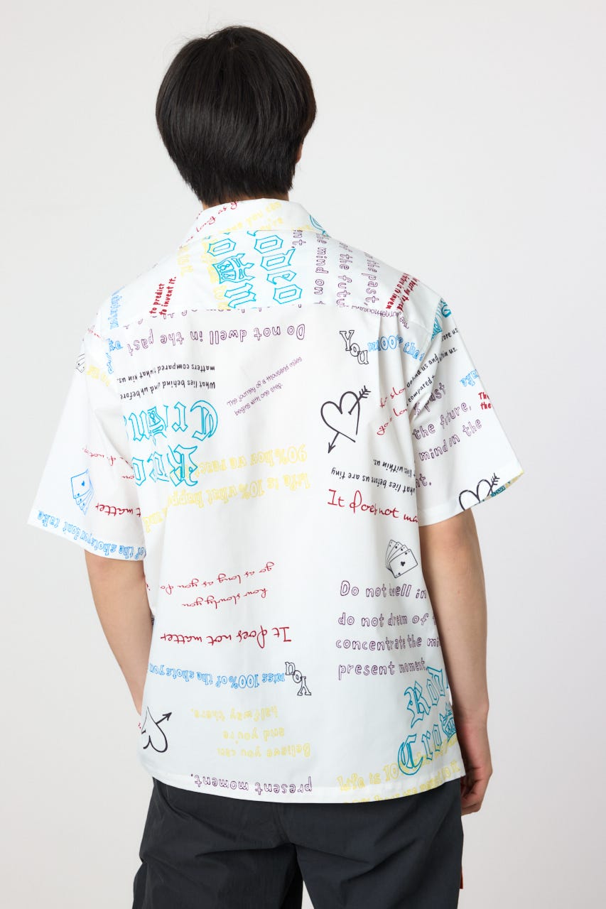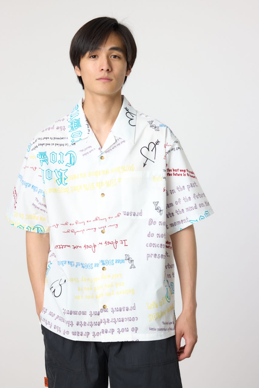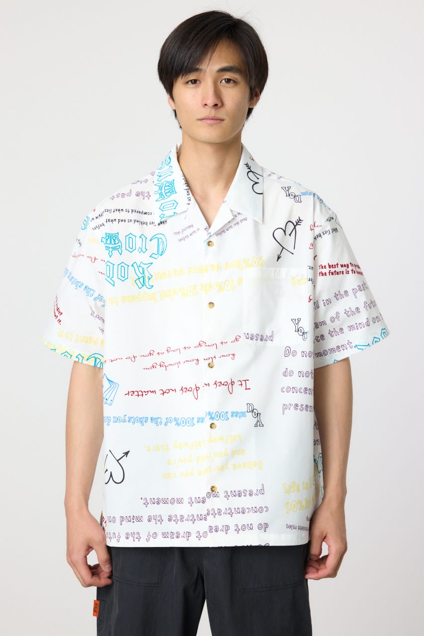 随所にちりばめられた手書き風レタリングデザインやモチーフプリントを組み合わせたオープンカラーシャツ。