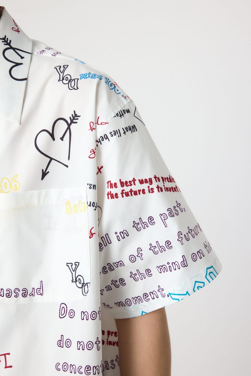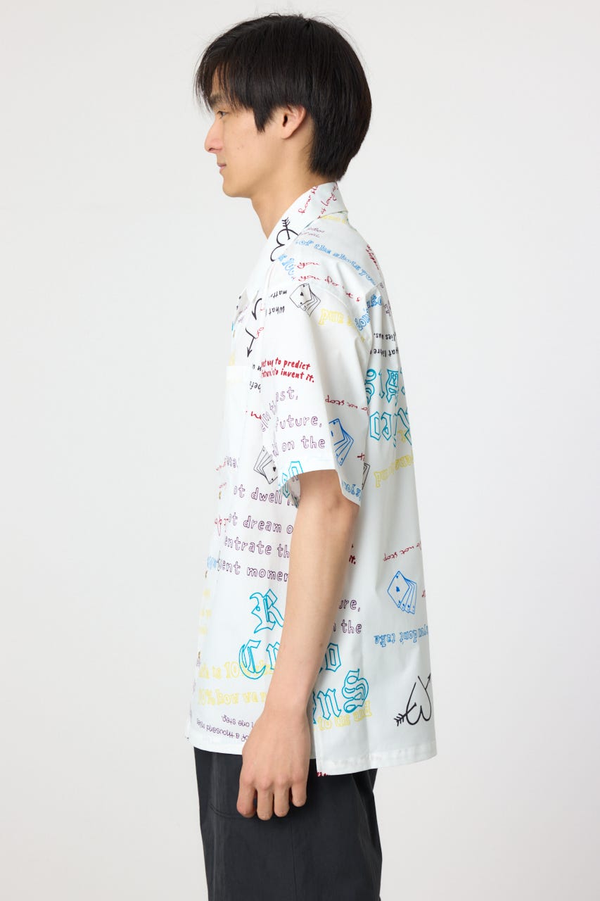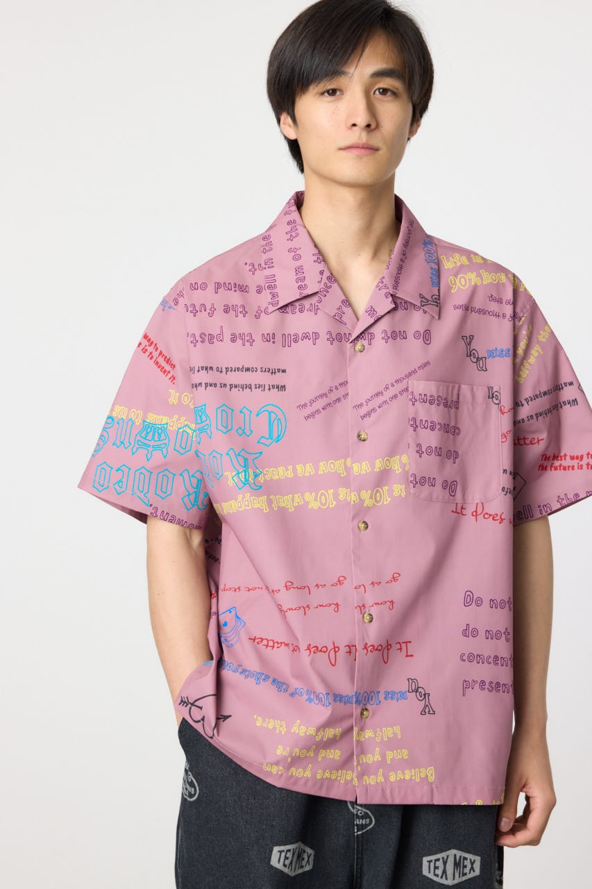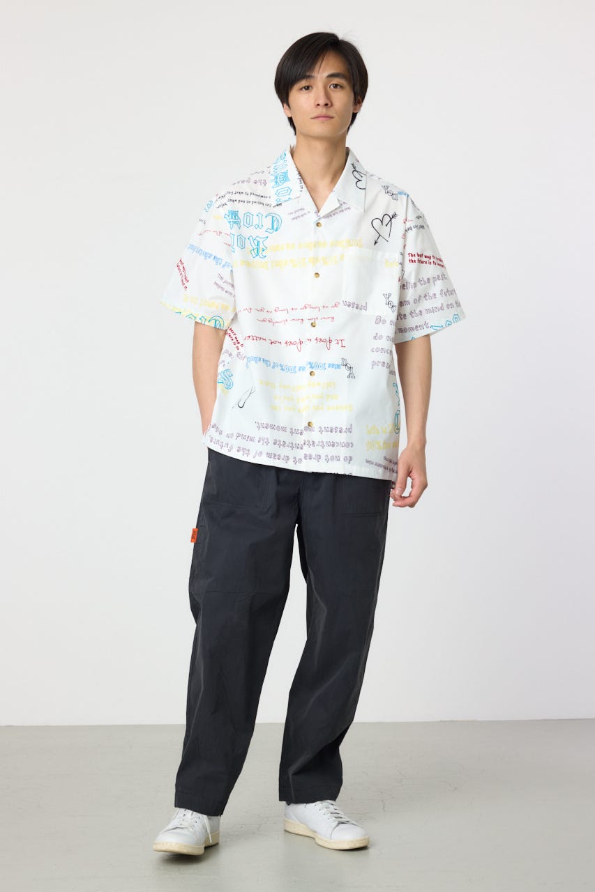 随所にちりばめられた手書き風レタリングデザインやモチーフプリントを組み合わせたオープンカラーシャツ。