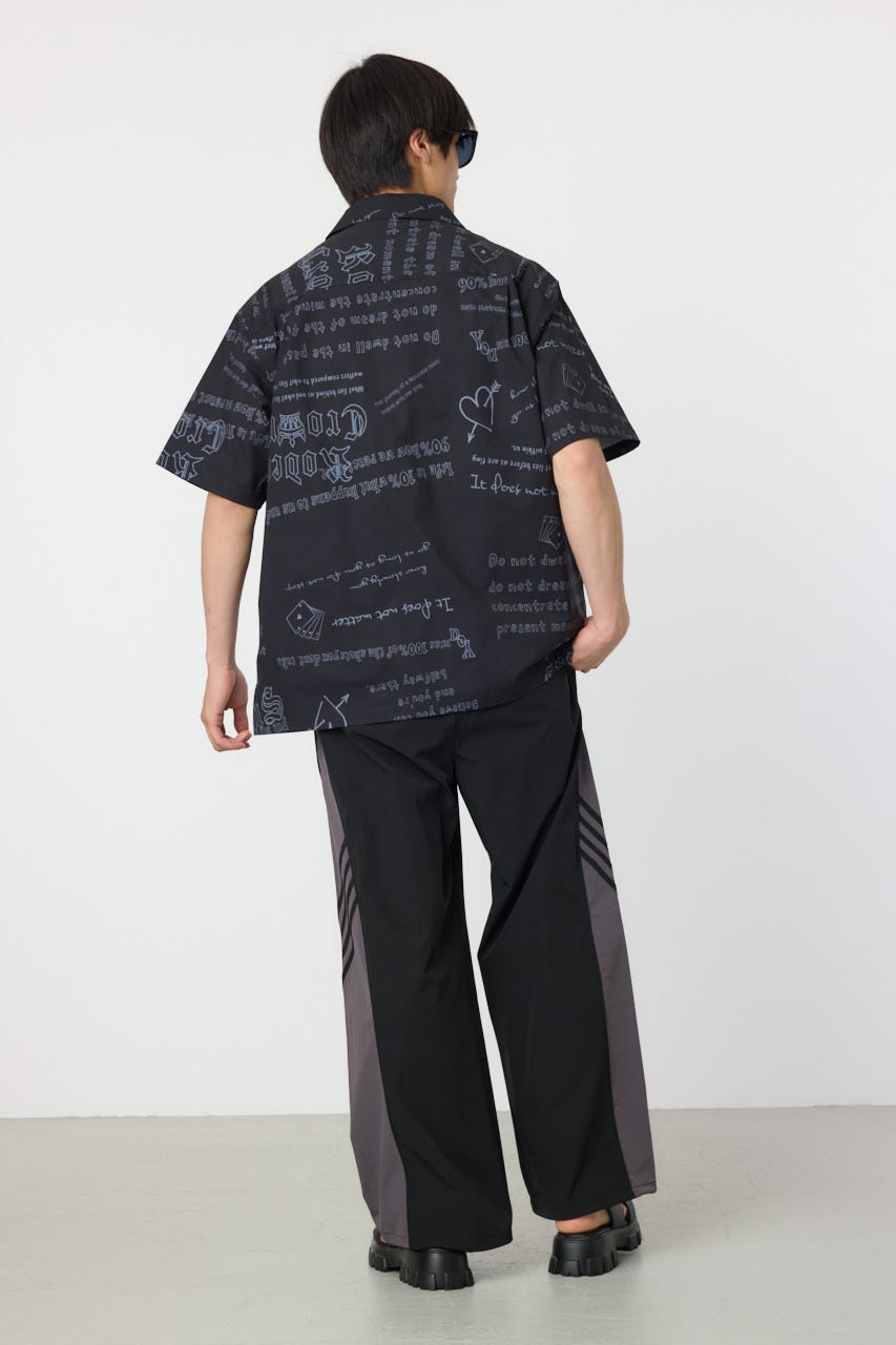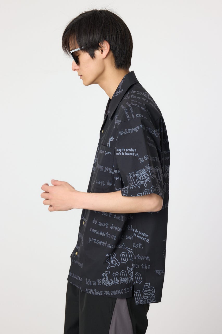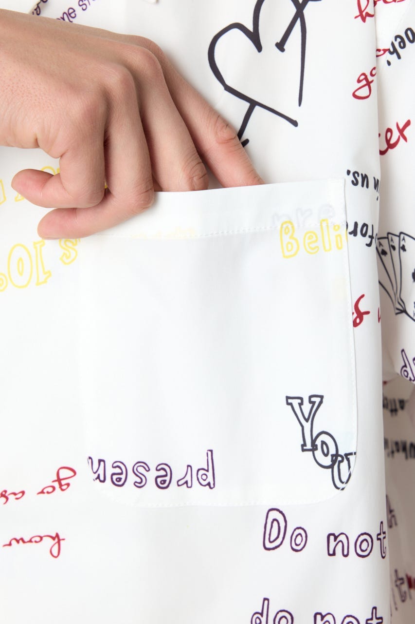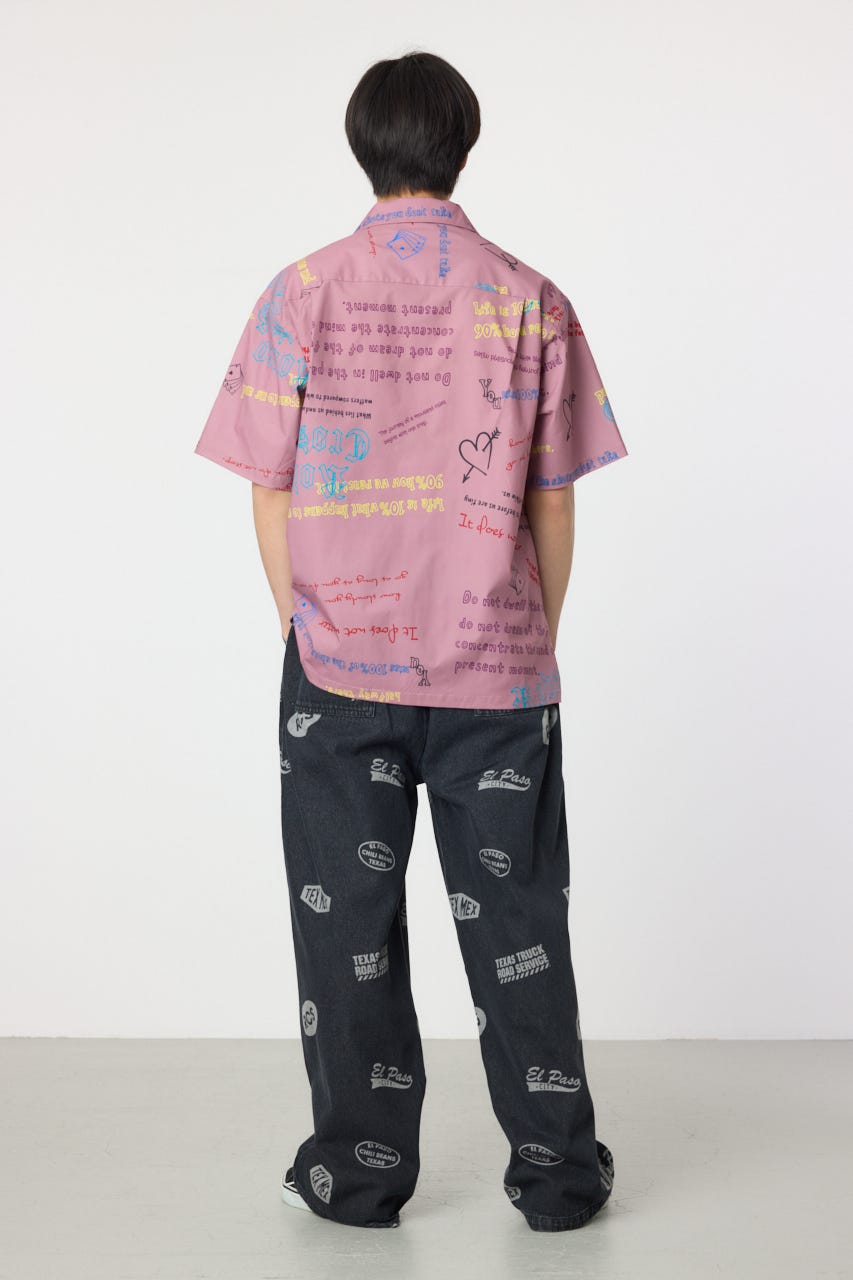 随所にちりばめられた手書き風レタリングデザインやモチーフプリントを組み合わせたオープンカラーシャツ。