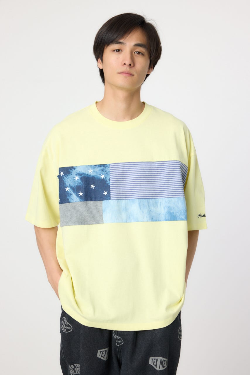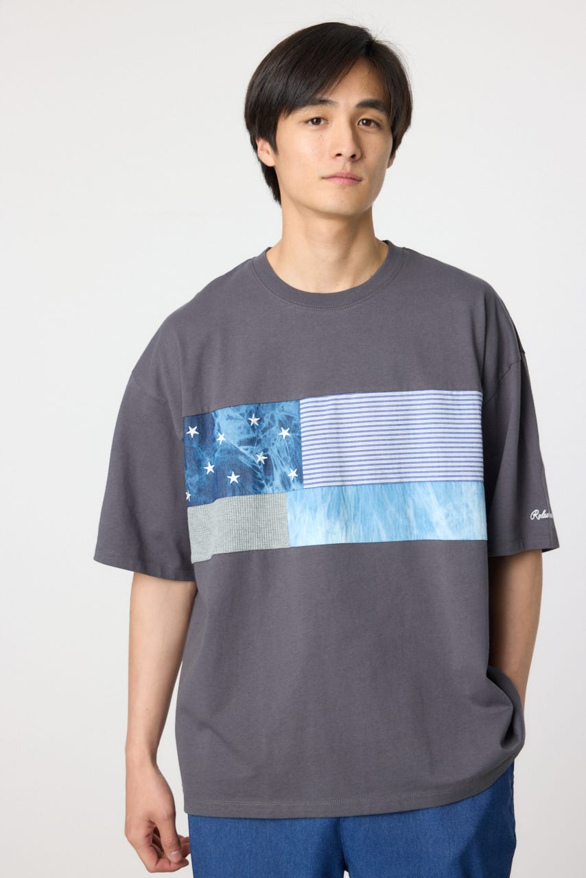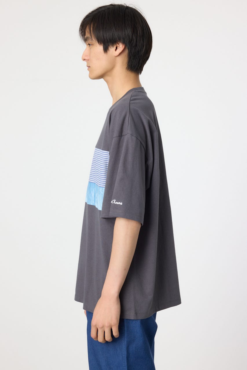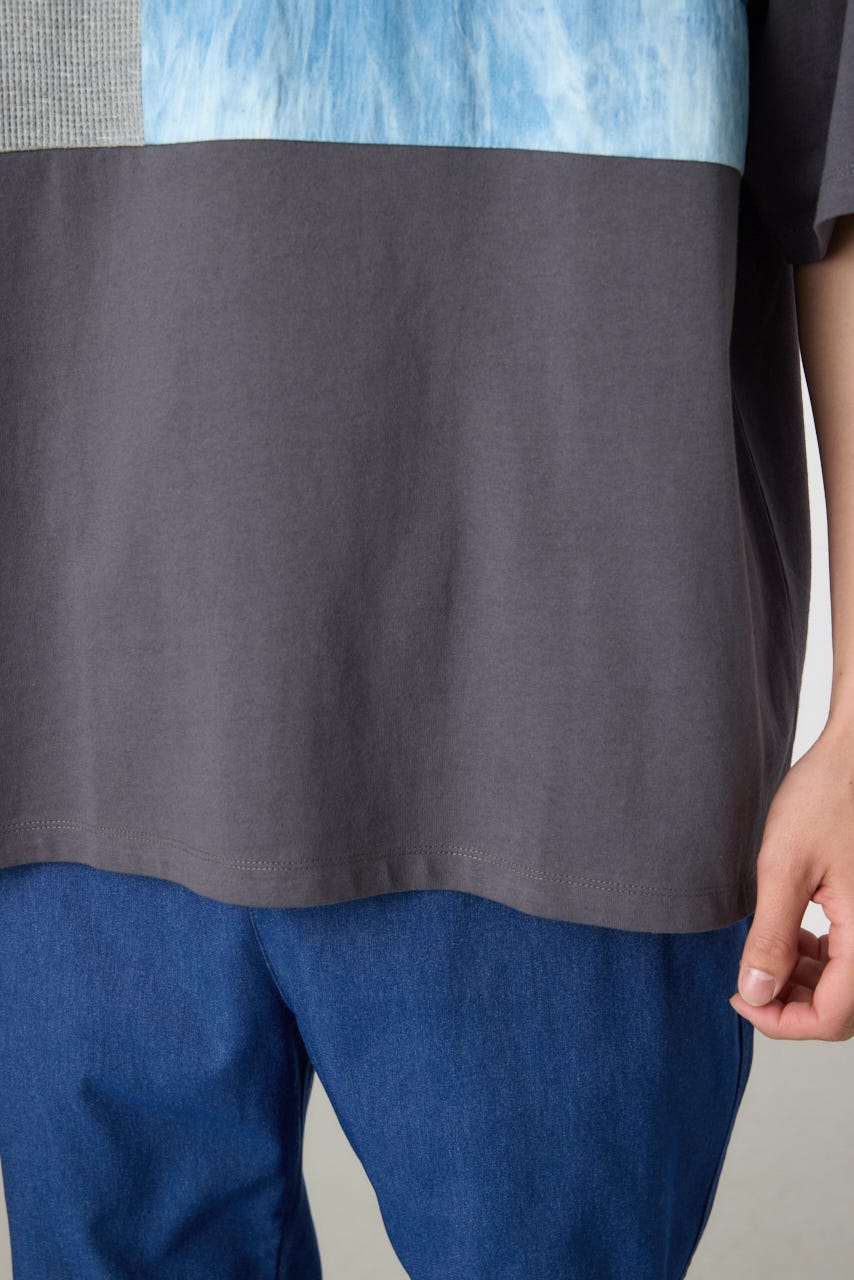 フロント部分にパッチワーク状に切替を施したデザインの半袖Tシャツ。