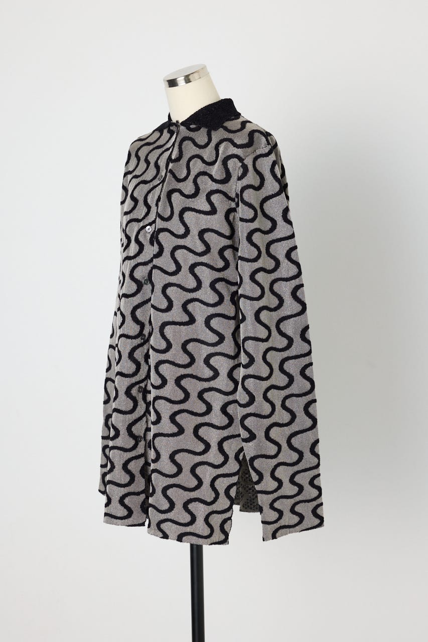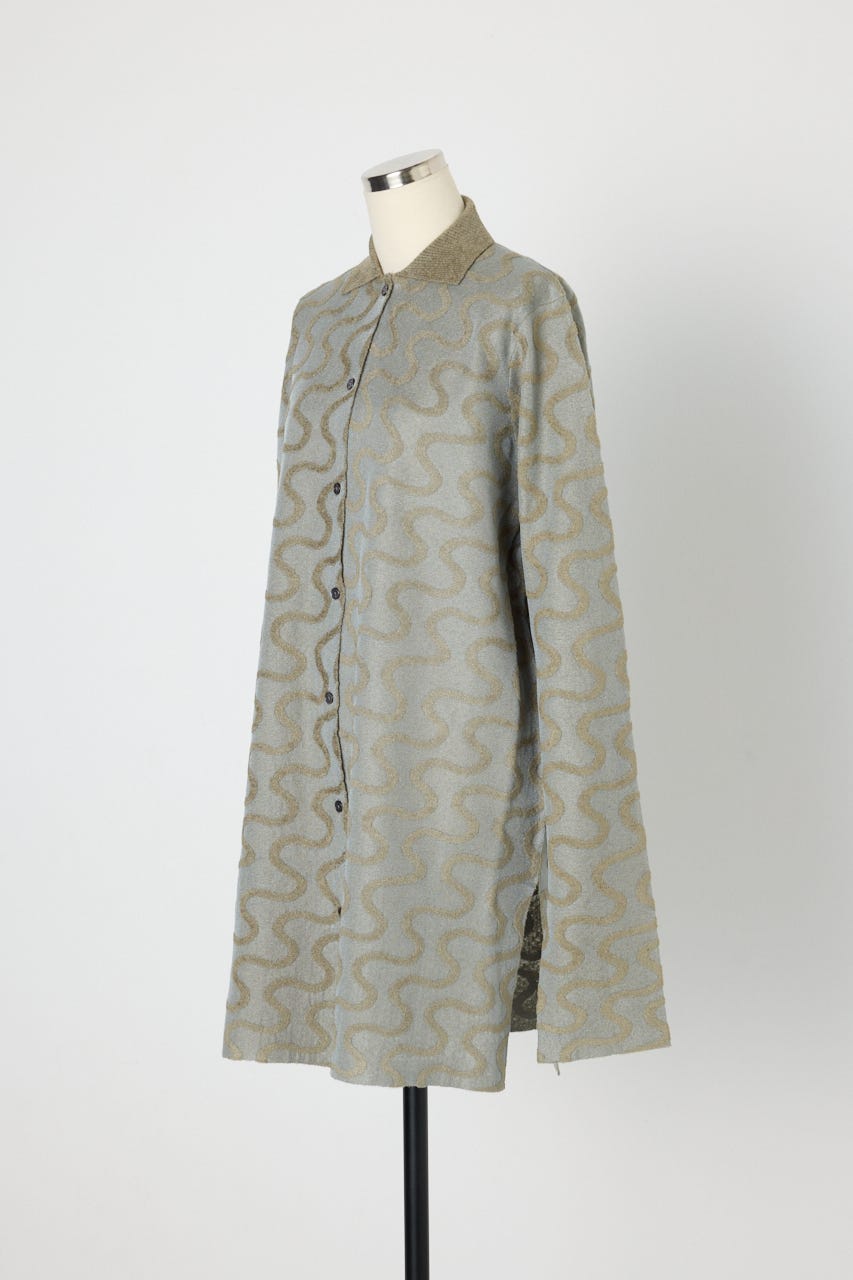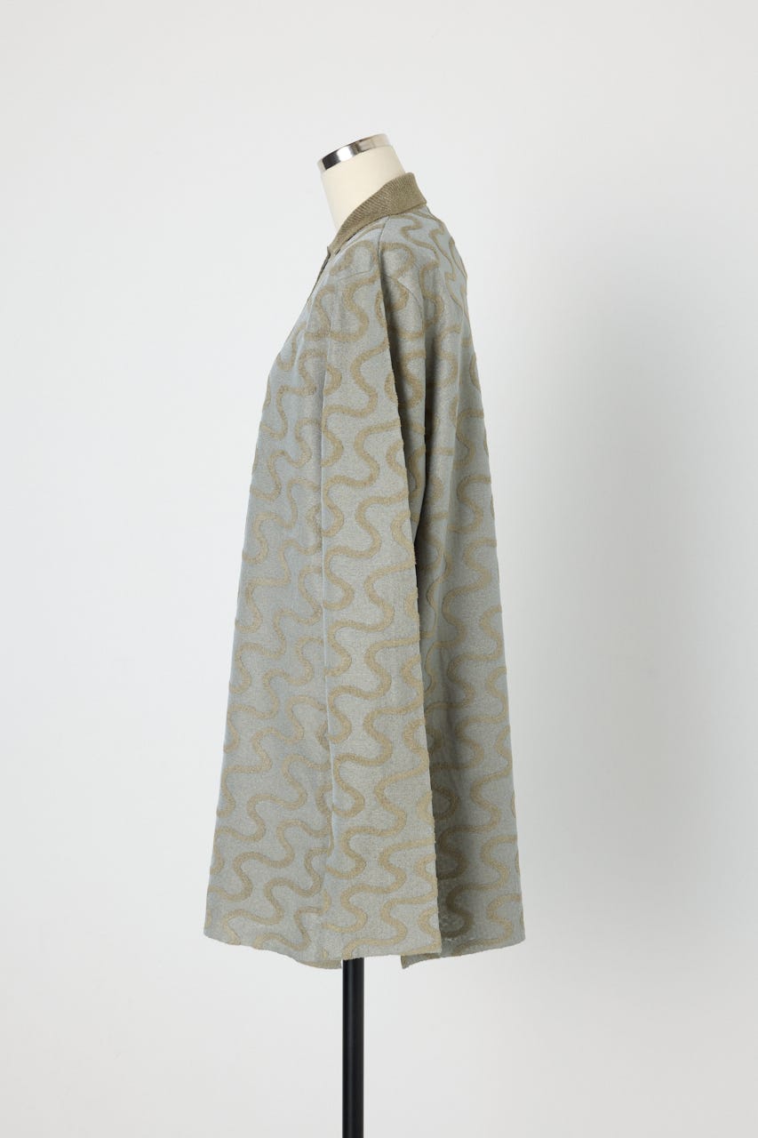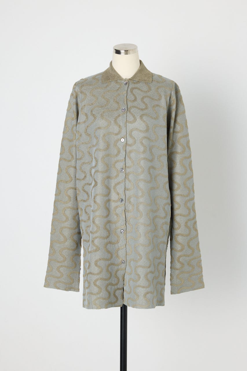キラキラとしたハリ感のあるクリア糸と毛羽のあるモール糸を使用したオーバーサイズのニットシャツ。