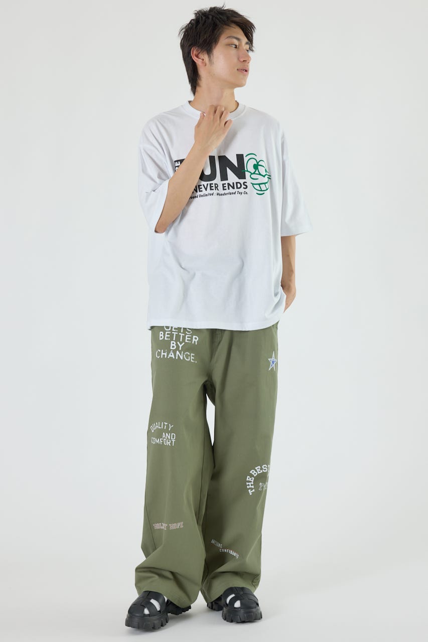 デニムパンツ、ワークパンツ、スケーターパンツなどを合わせてワークストリートスタイルがおすすめ。