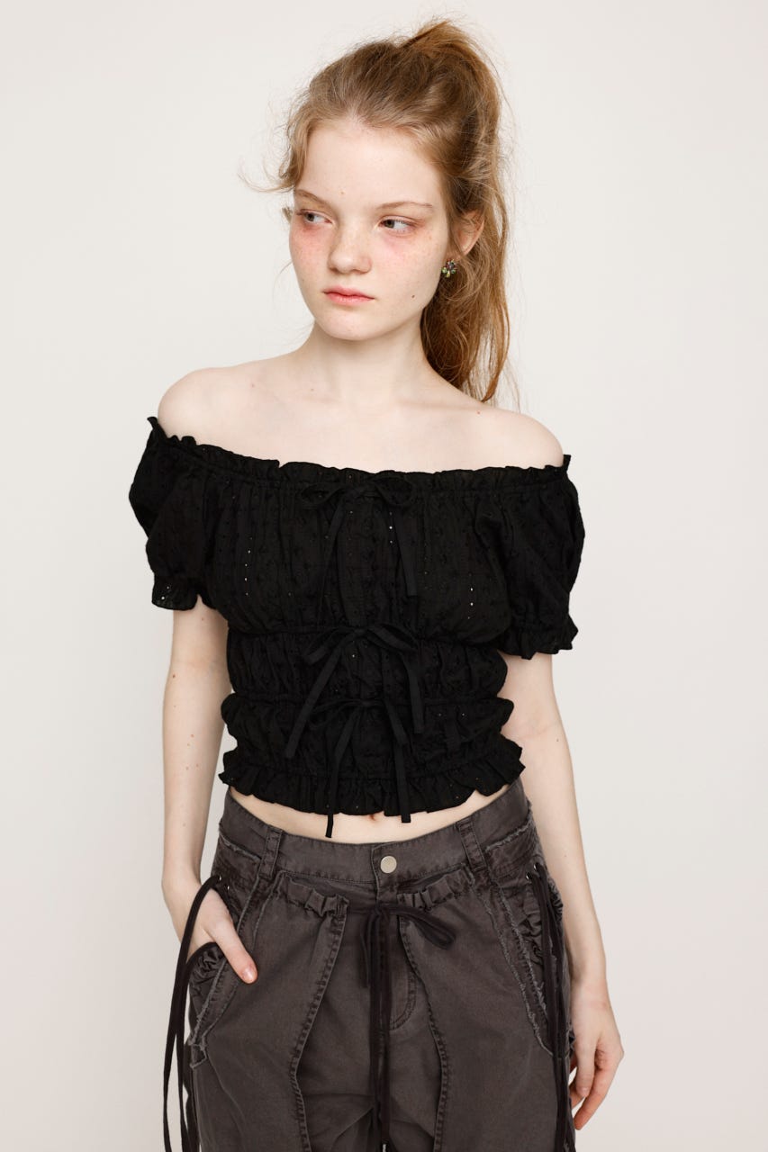 ■DETAIL:程よいデコルテの開きと、ボリューム感のあるパフスリーブが華奢見えするトップス。