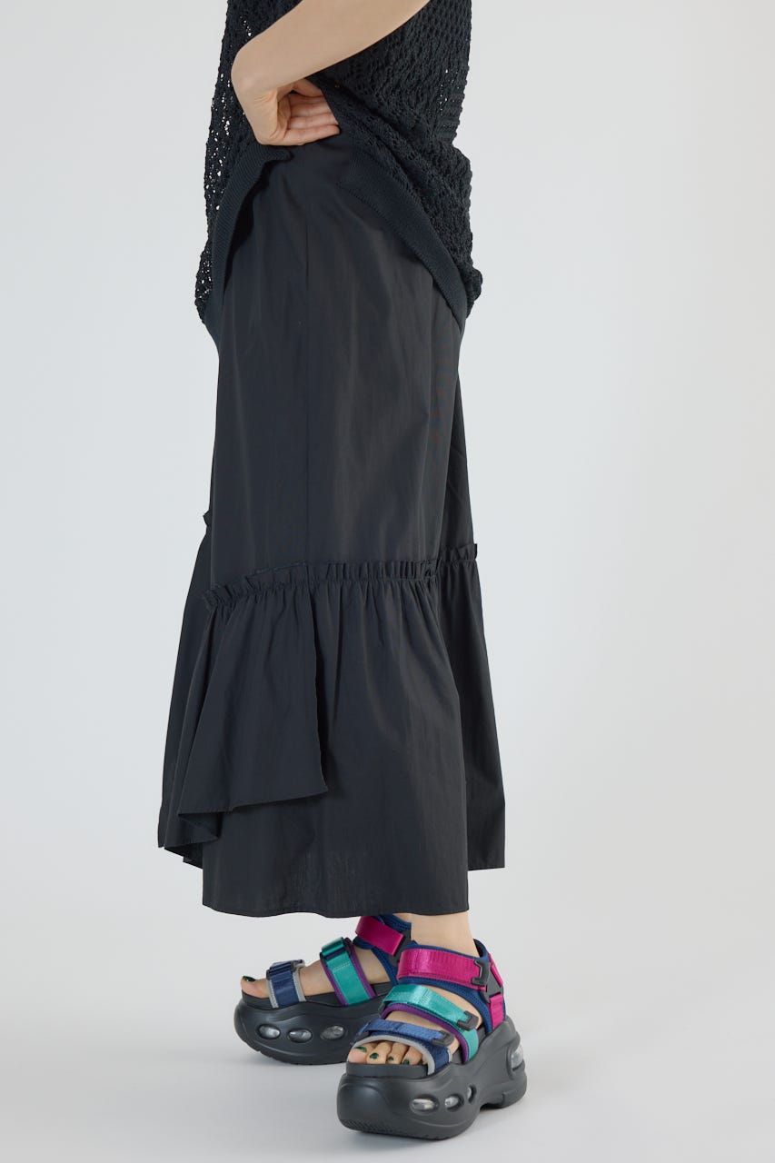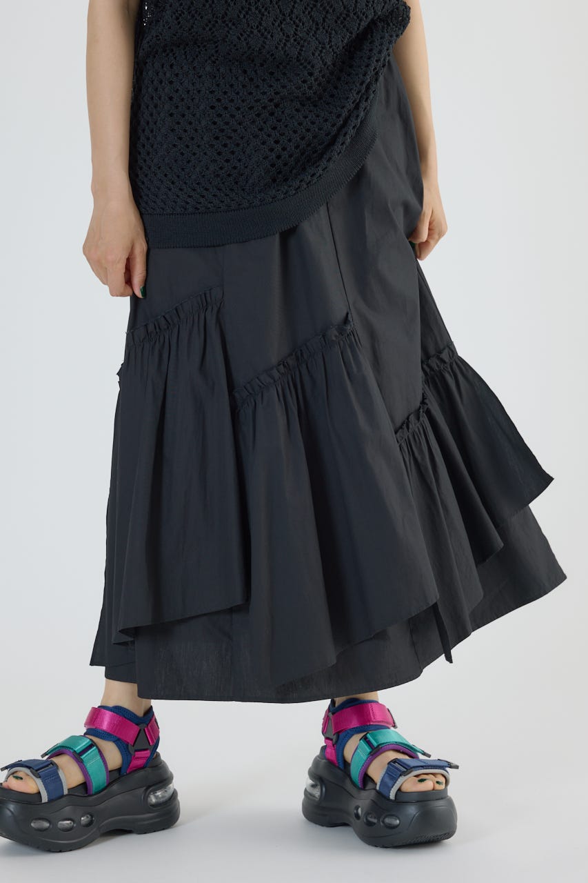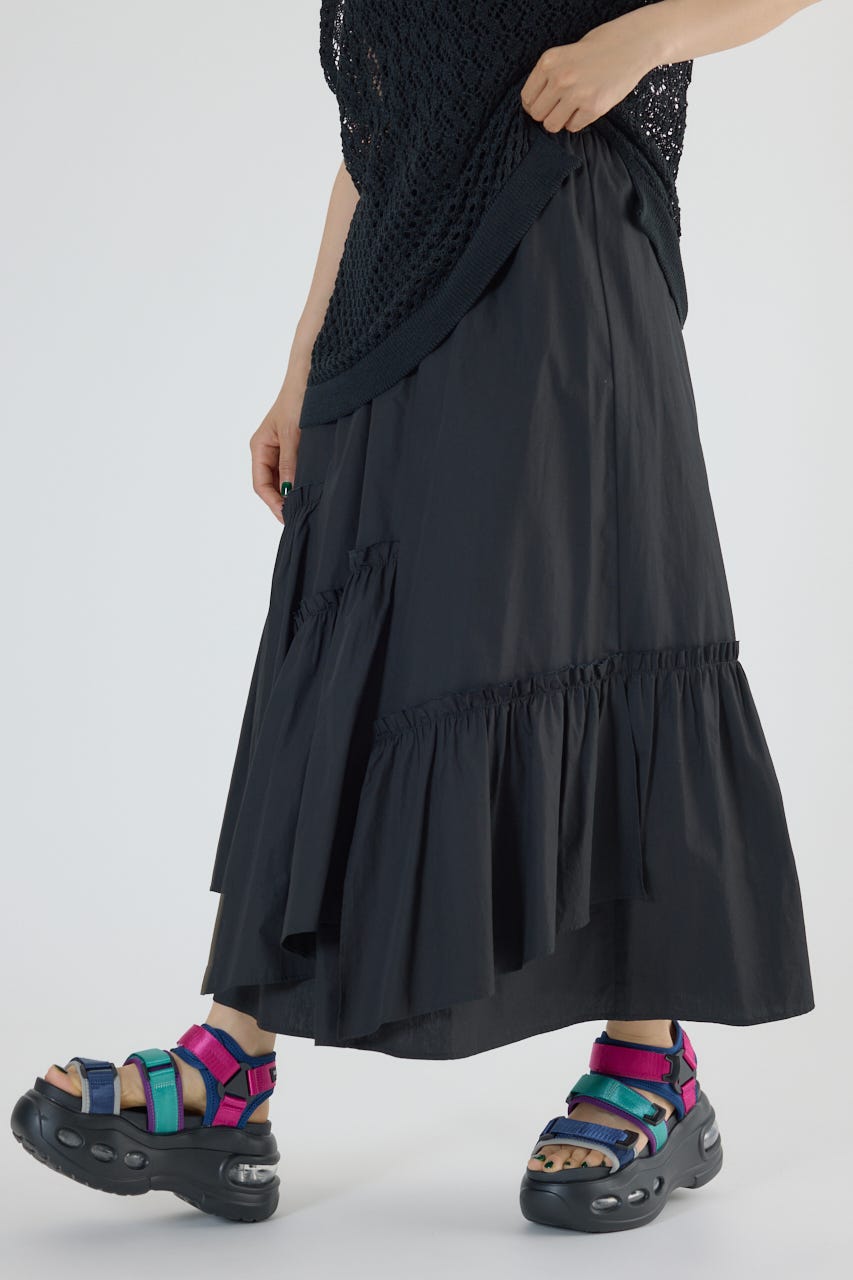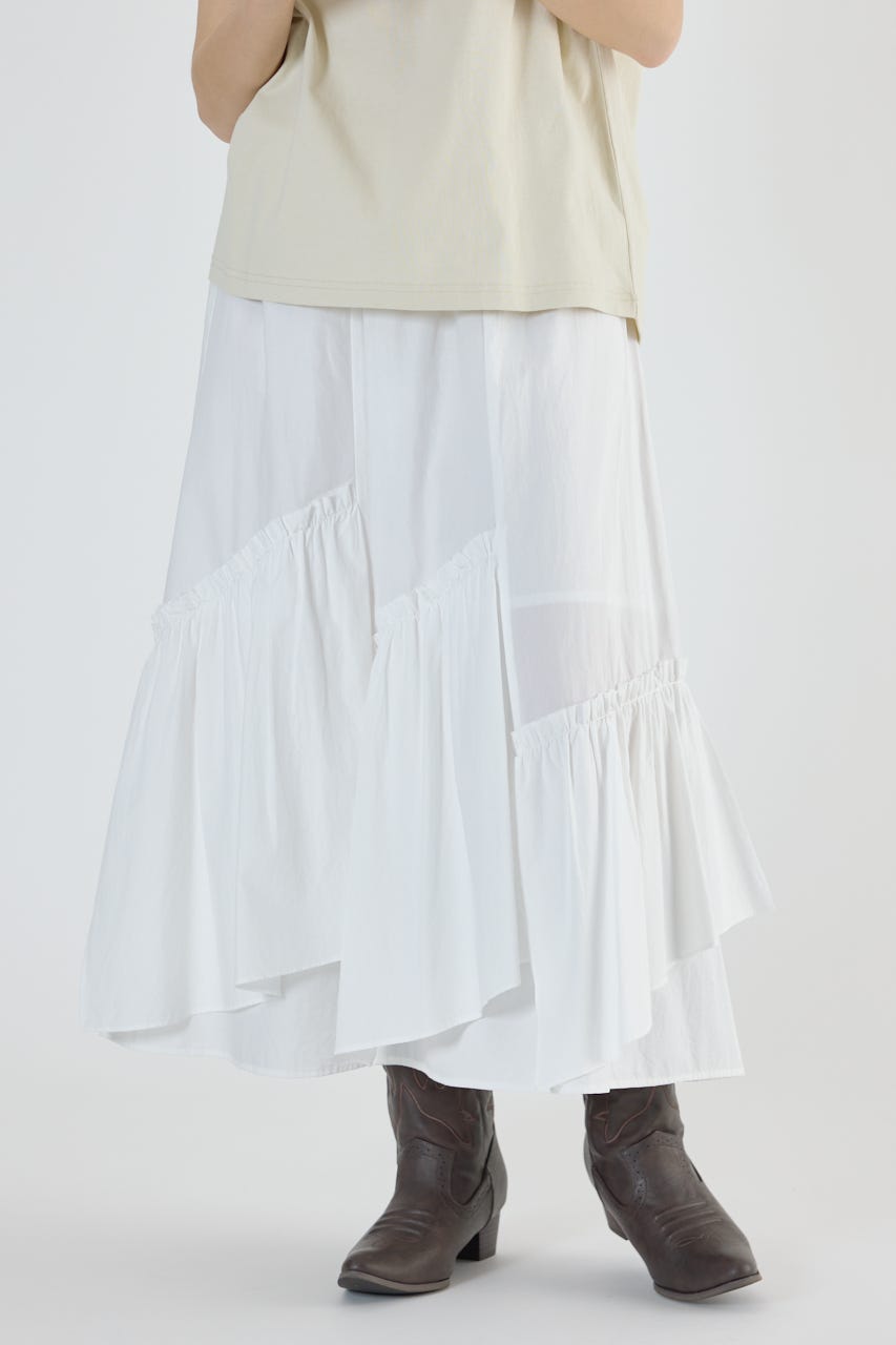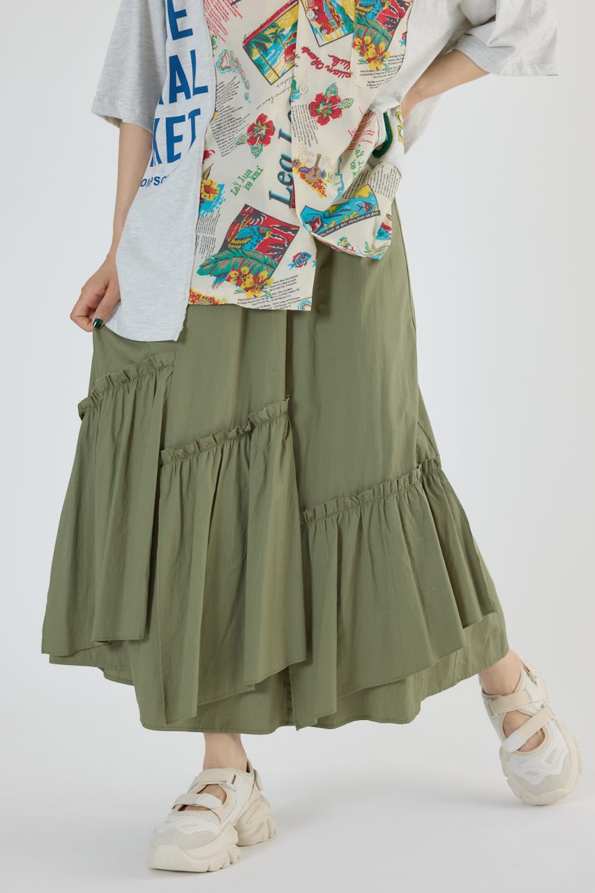 前裾に施したアシンメトリーなフリルが歩くたびに揺れ、華やかだけどカジュアルな万能スカート。