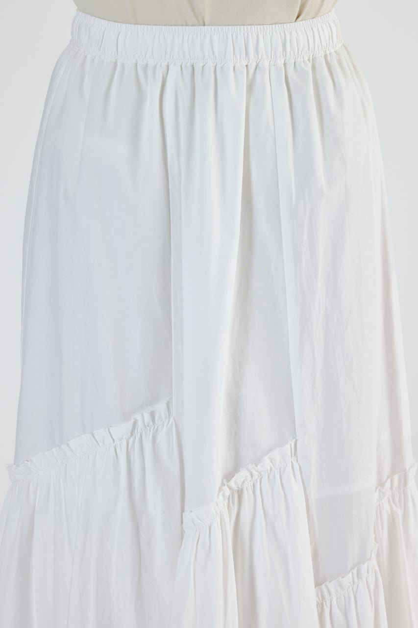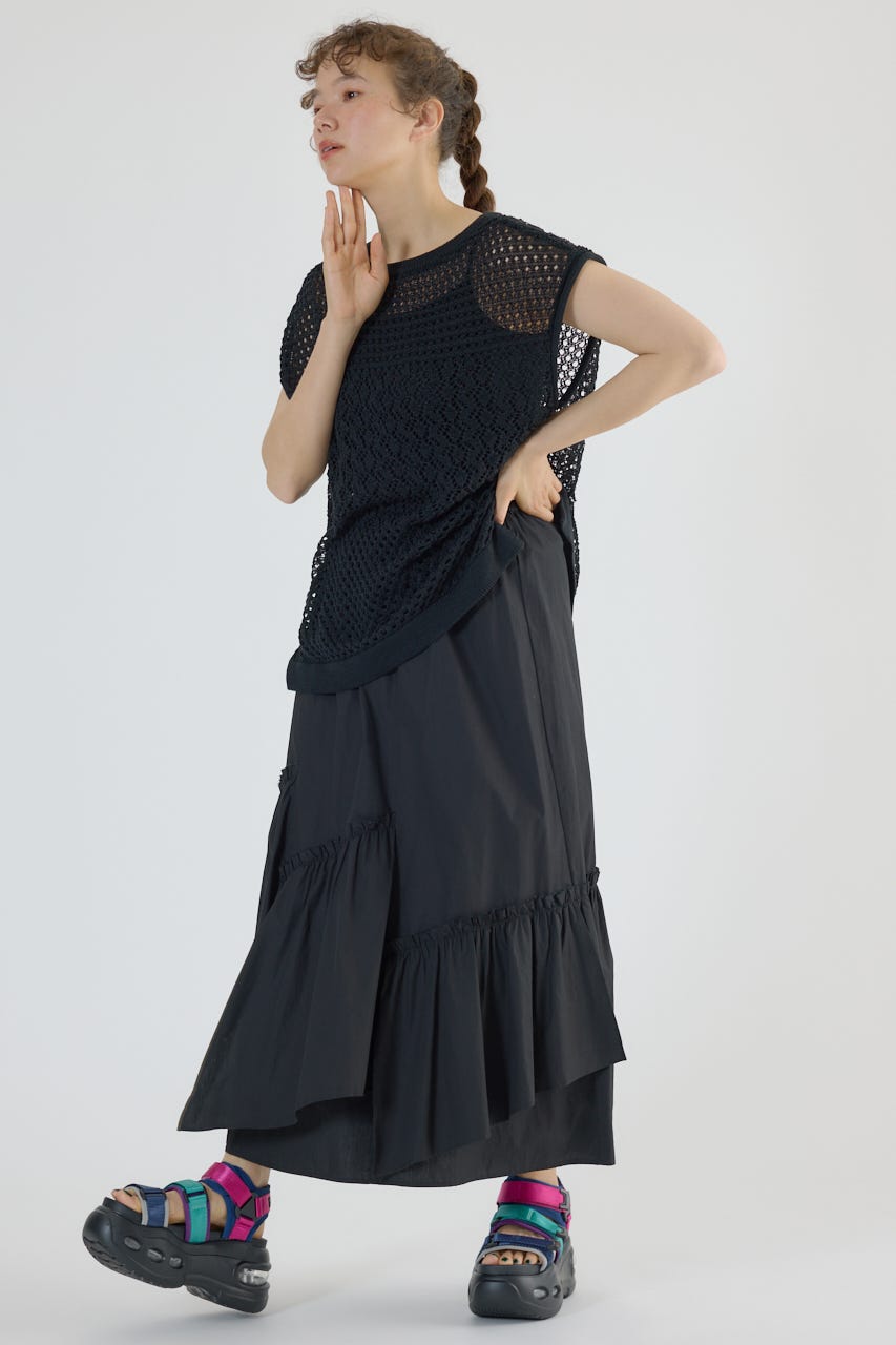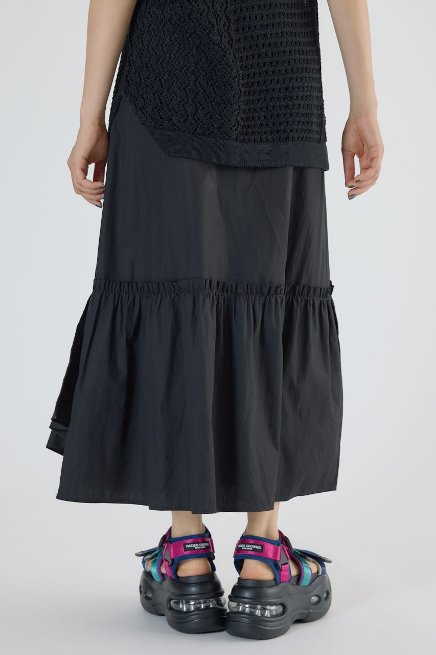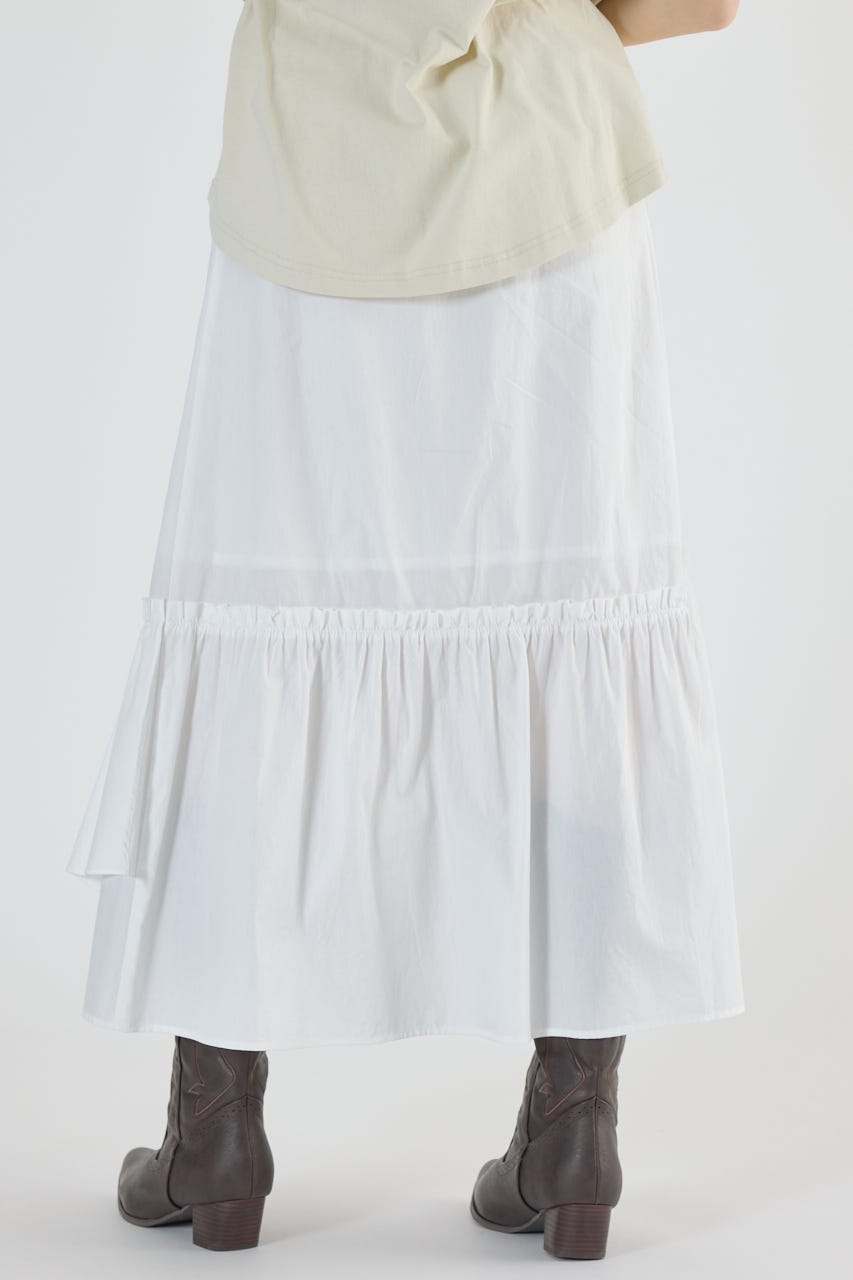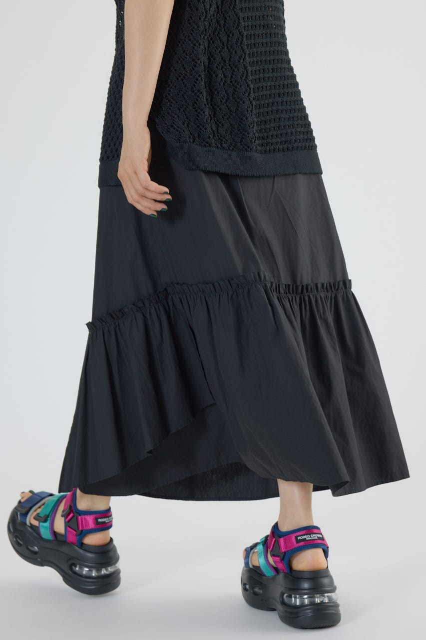 前裾に施したアシンメトリーなフリルが歩くたびに揺れ、華やかだけどカジュアルな万能スカート。