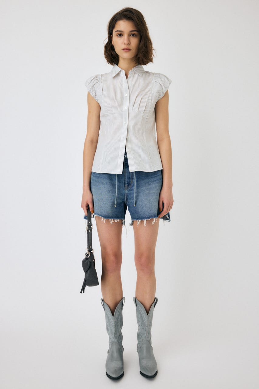 ショルダー部分のふわっと肩にかかるギャザーディテールや、身頃やバストなどのパネル切り替えでフィットさせたりボリュームを出したりすることでメリハリのある女性らしいシャツに仕上がっています。