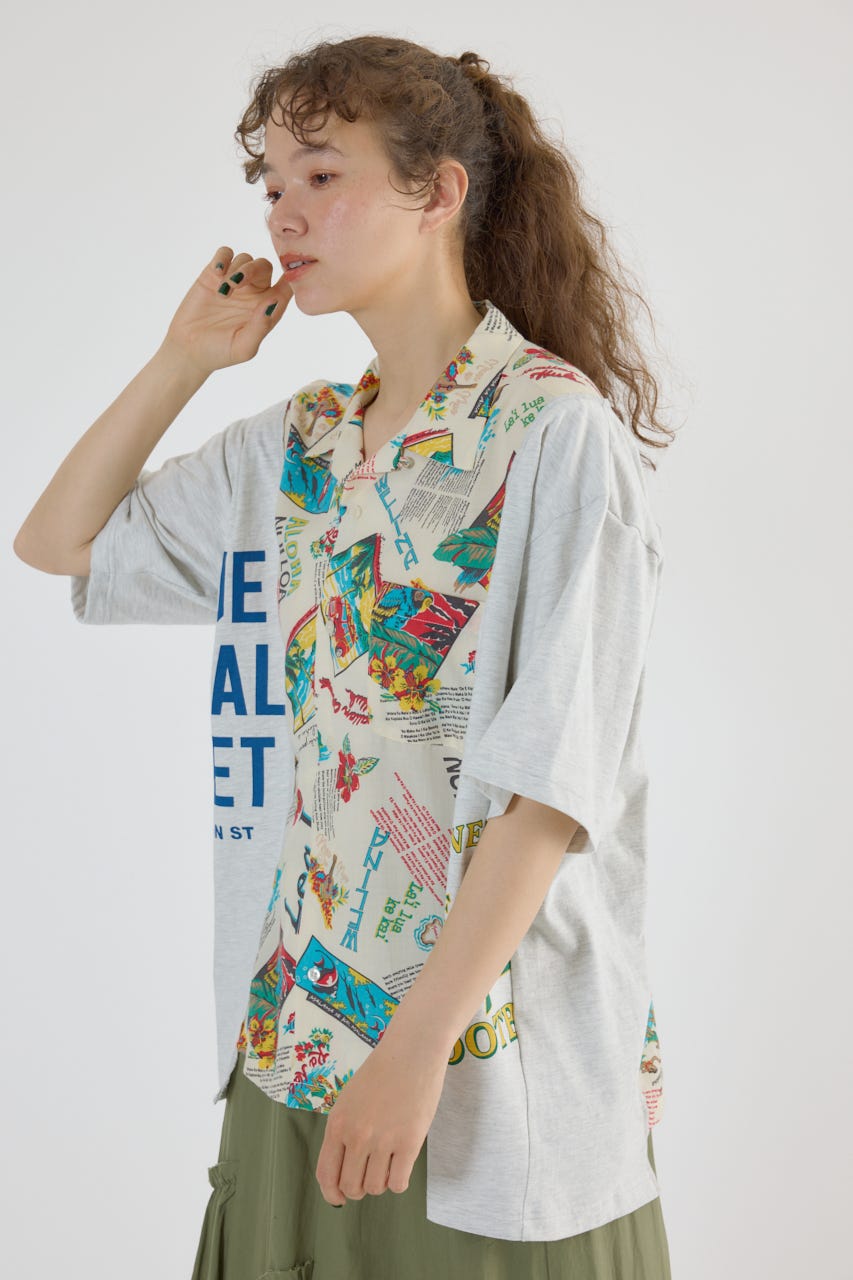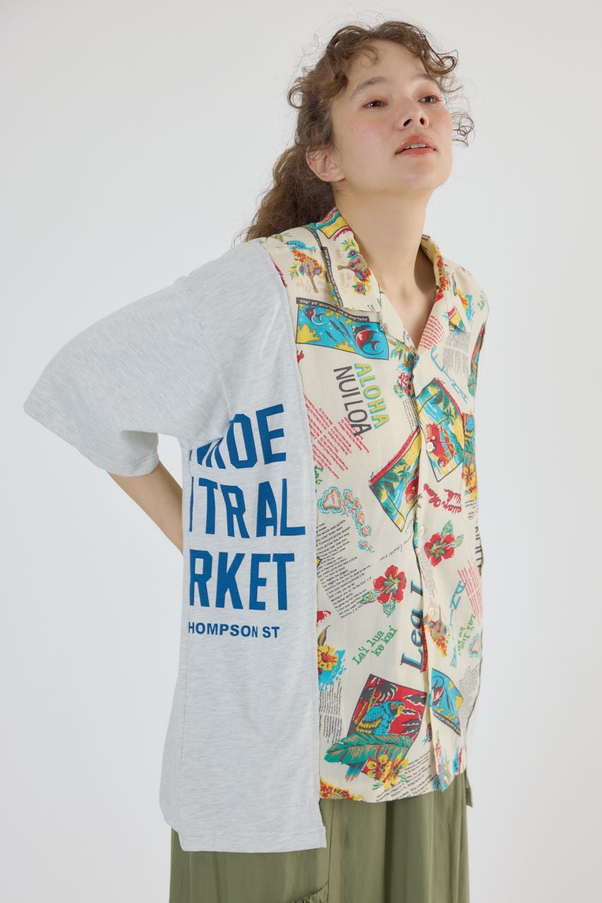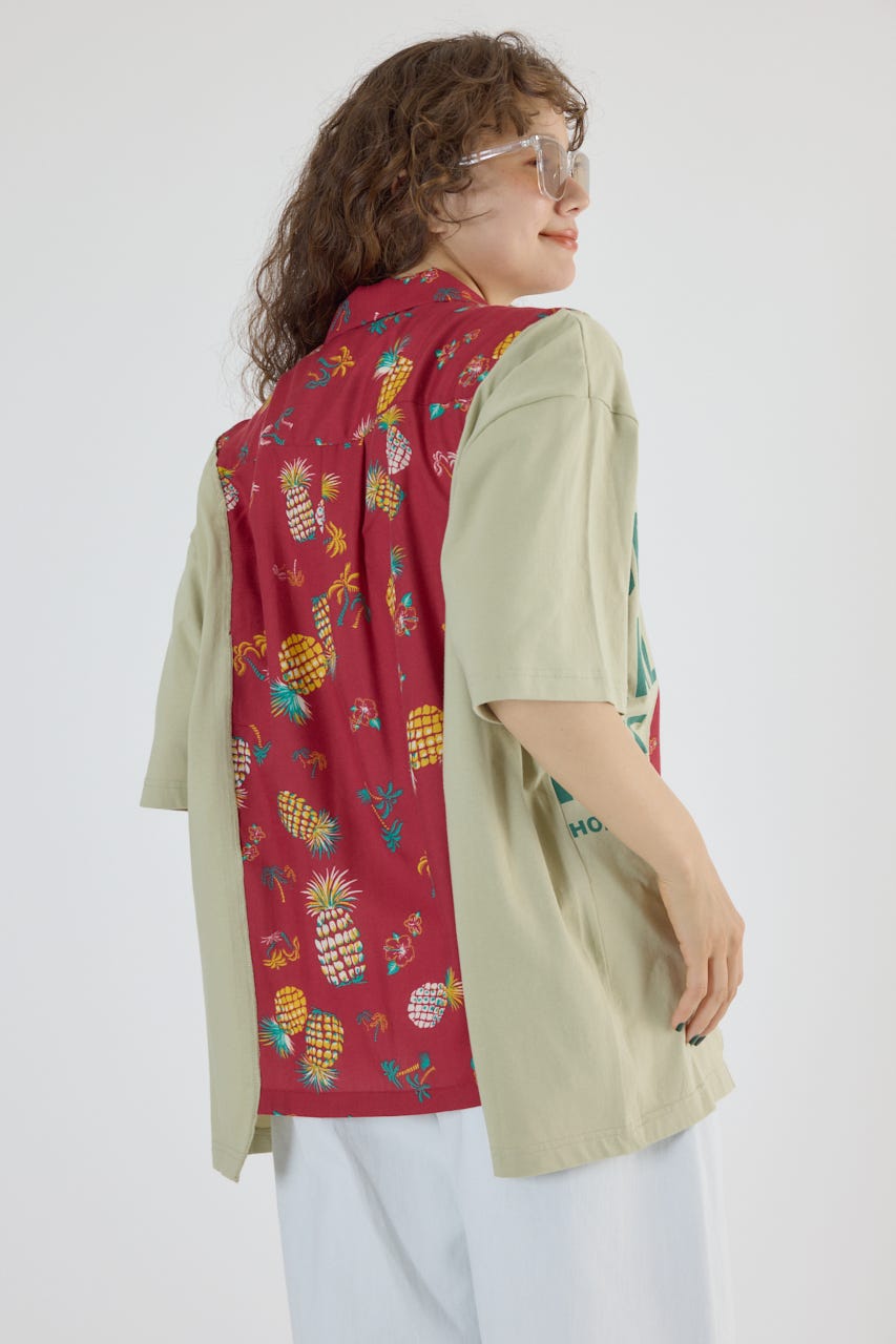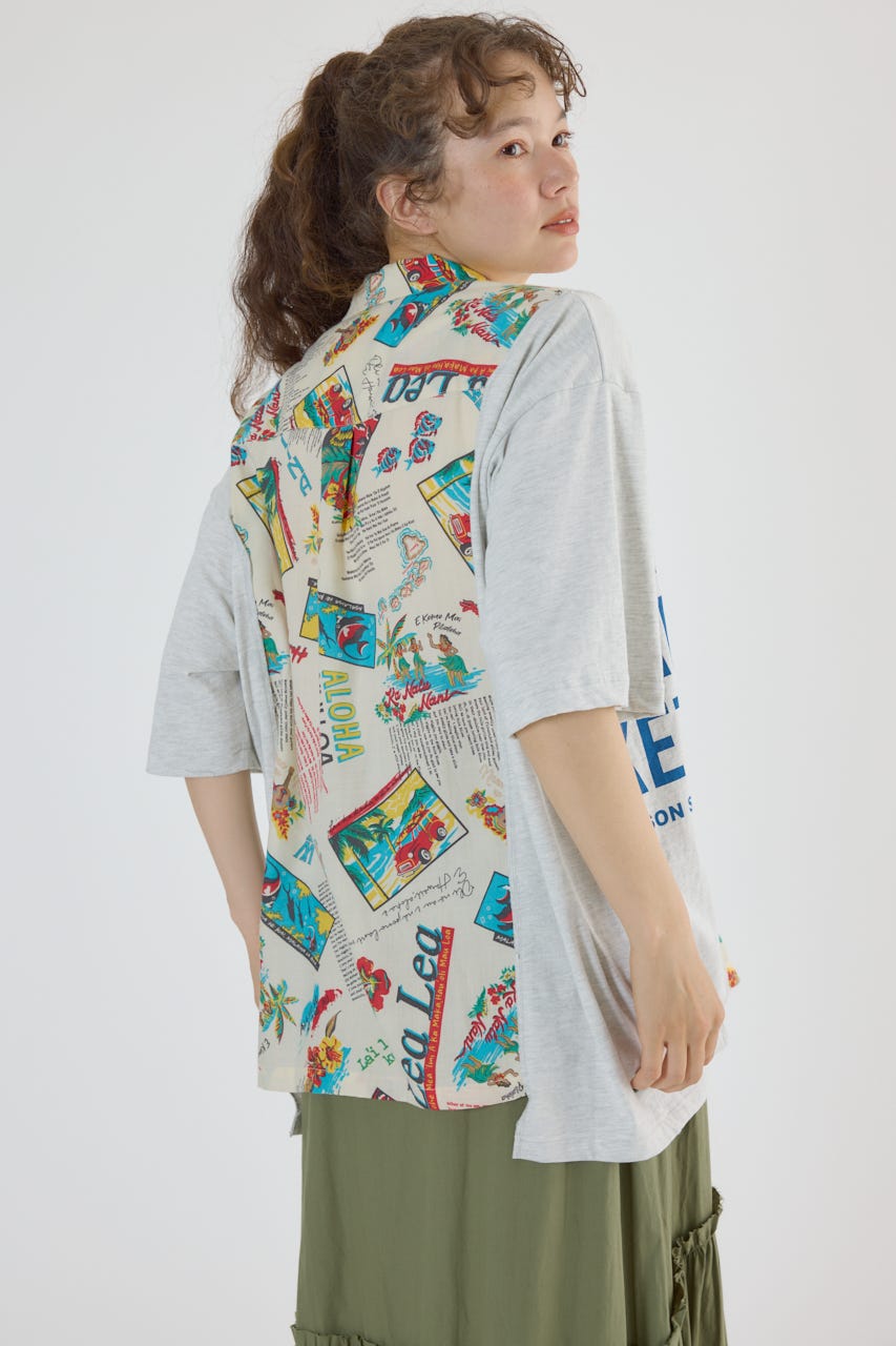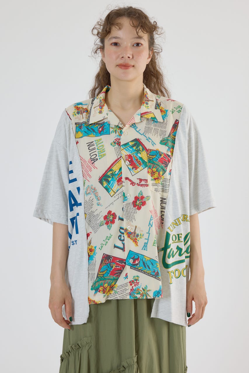 アロハシャツとプリントTシャツを切替えたイメージのリメイク風デザイン。