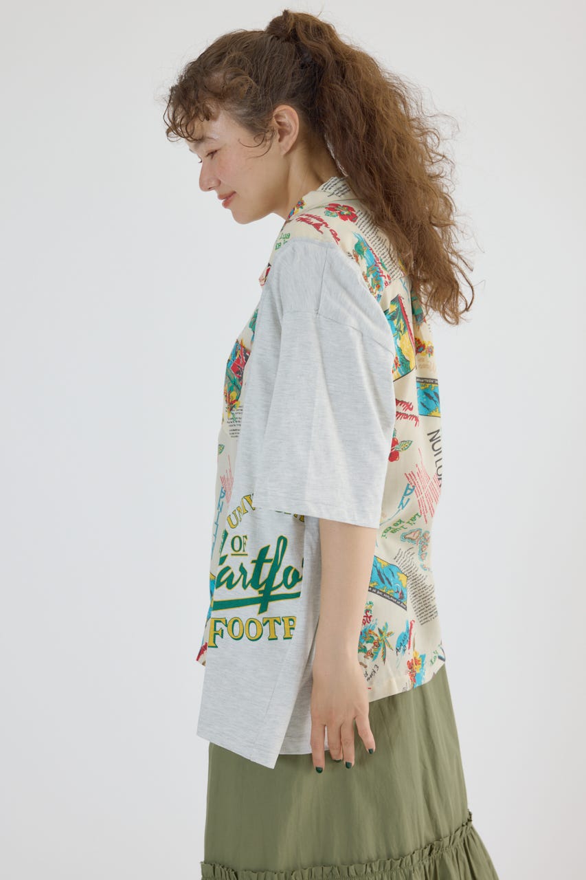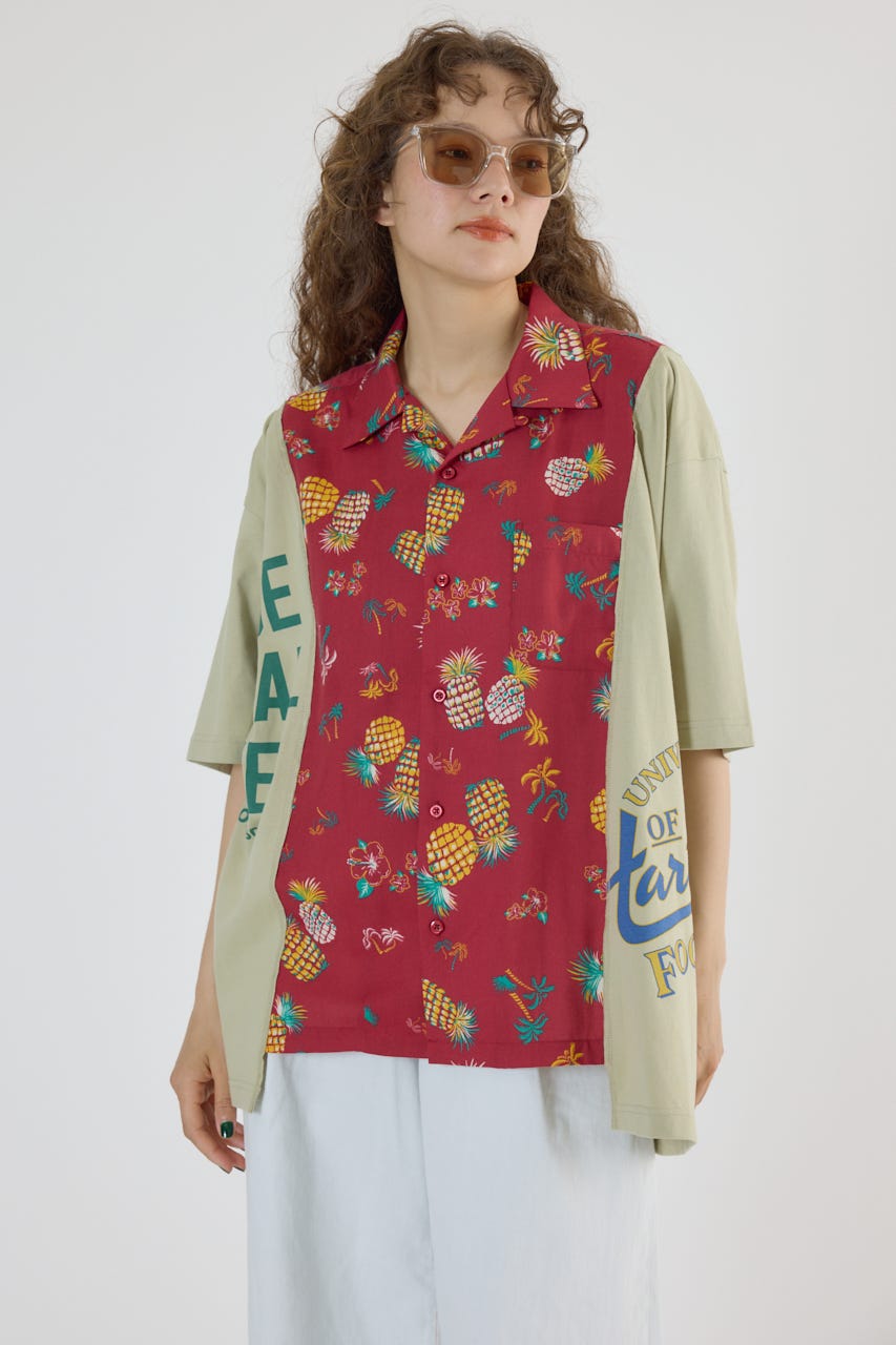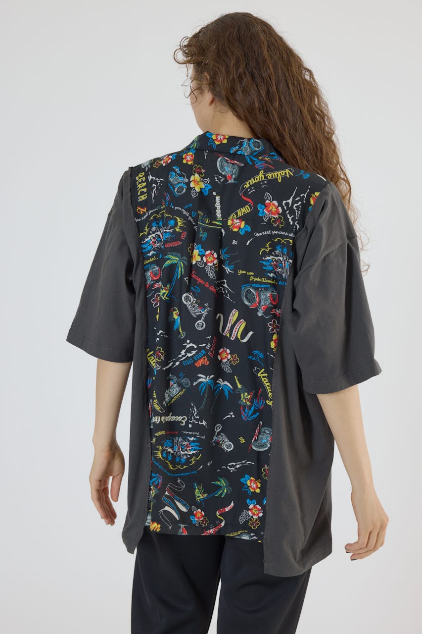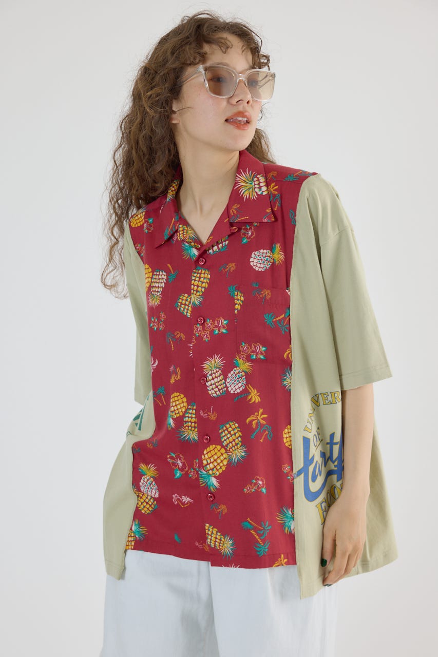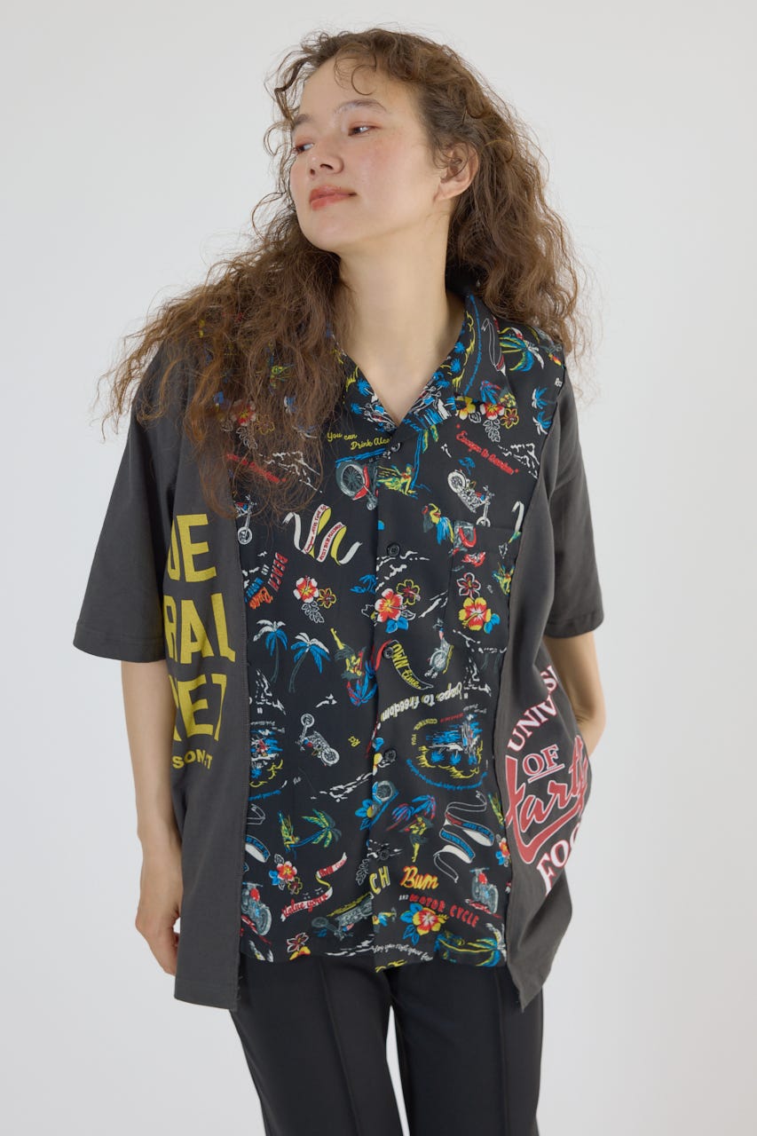 アロハシャツとプリントTシャツを切替えたイメージのリメイク風デザイン。