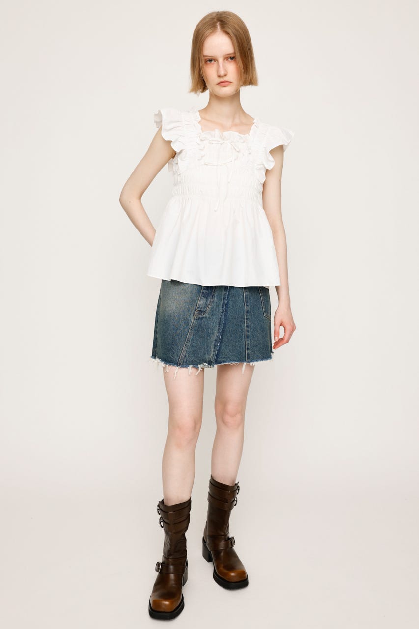 ■POINT:アーム部分にボリューム感のあるフリルをあしらい、フロントにはリボンディテールも取り入れた女性らしい印象のトップス。
