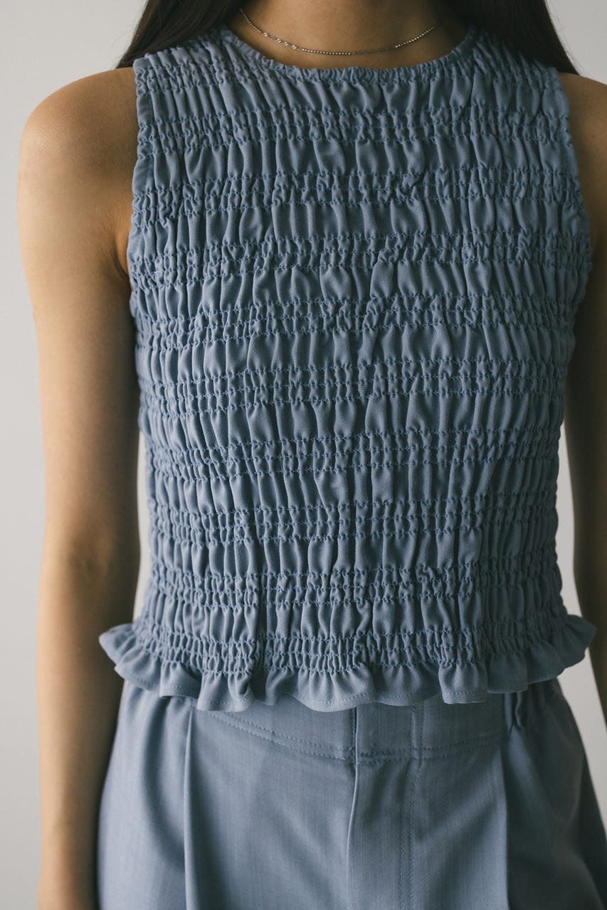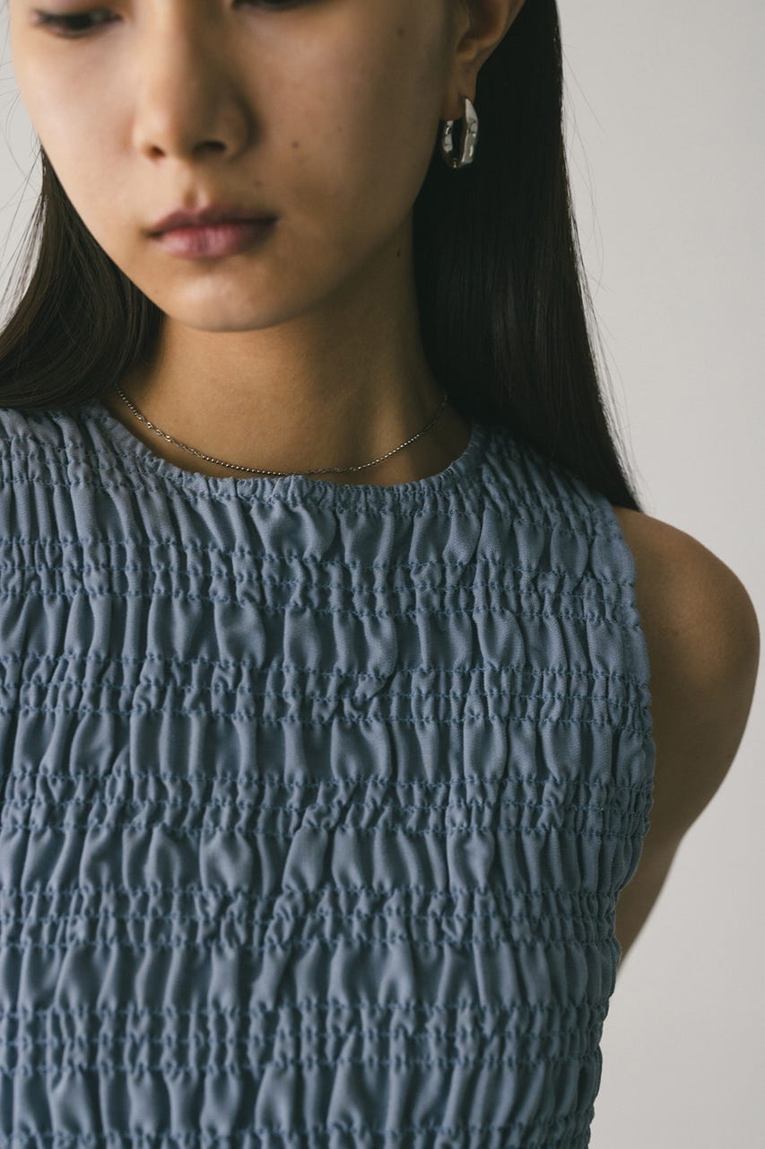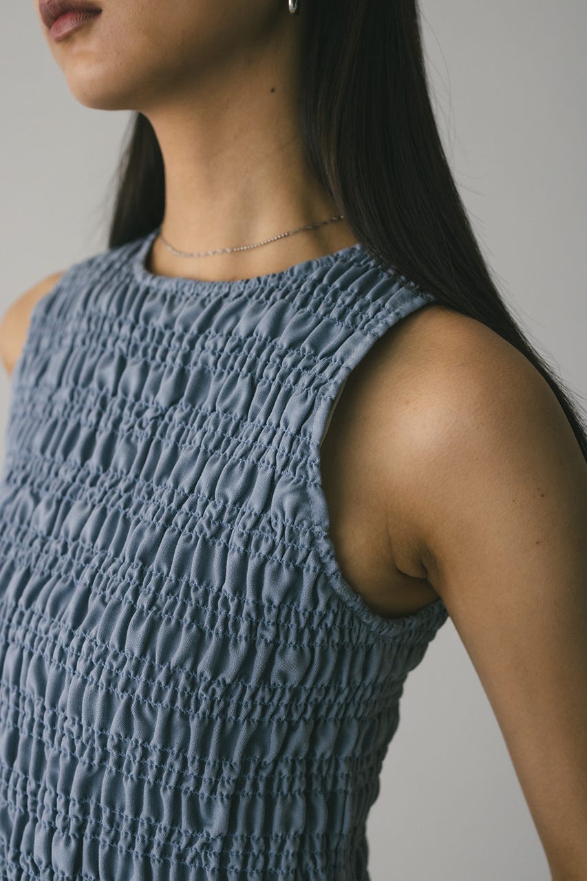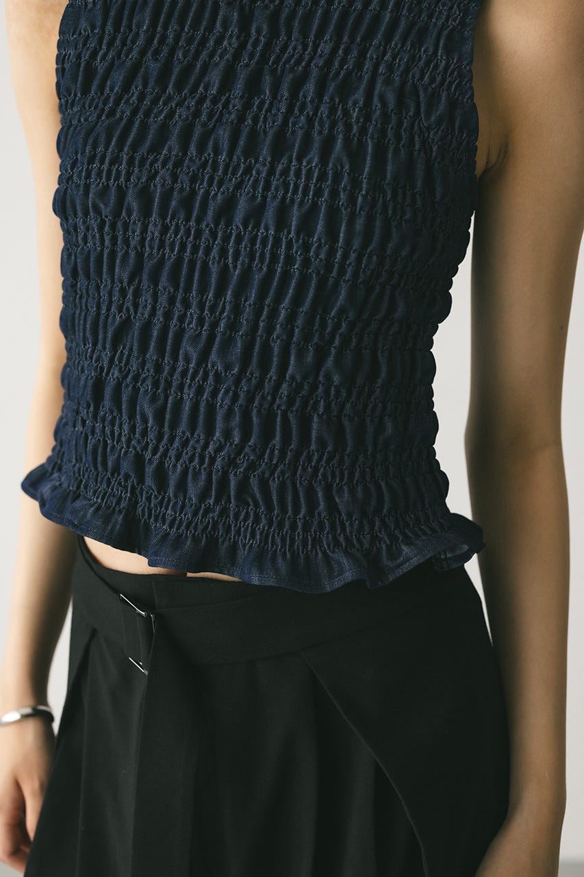 柔らかな肌触りやシルクのような光沢感、吸湿性や速乾性に優れているテンセル混デニム生地を使用したシャーリングトップ。