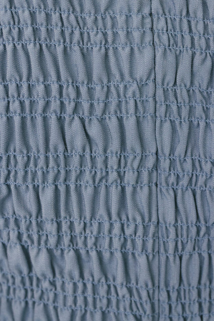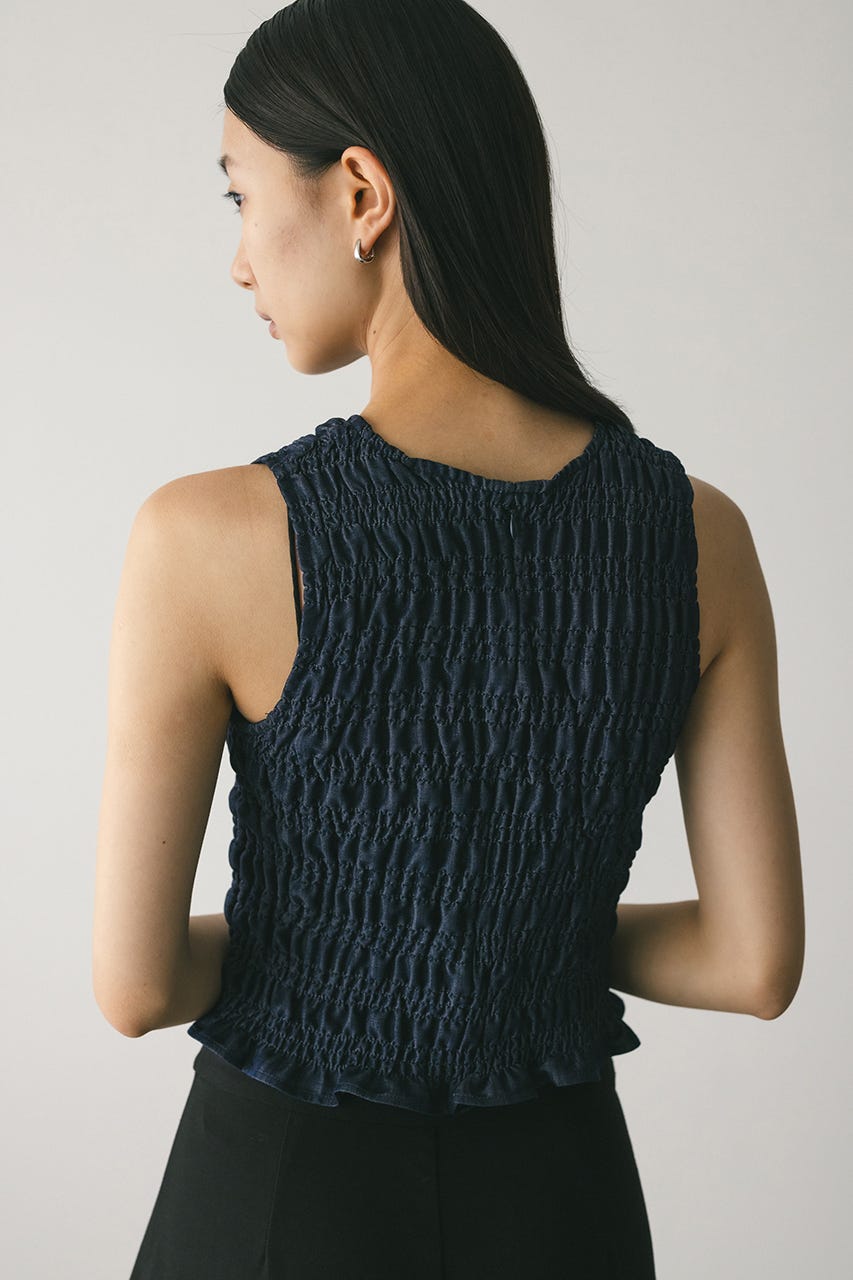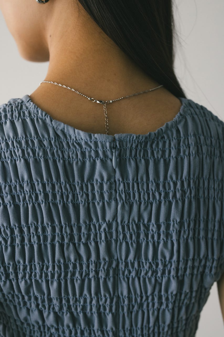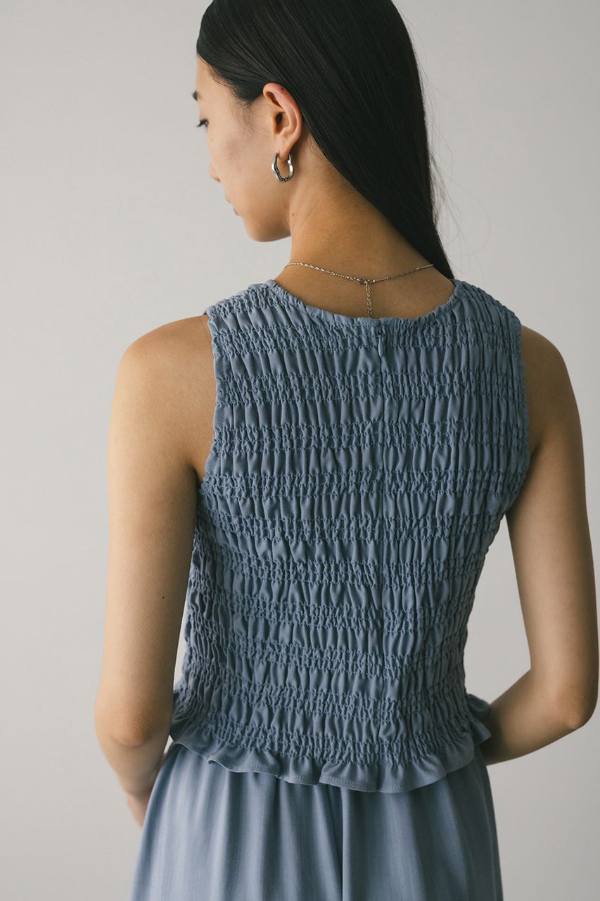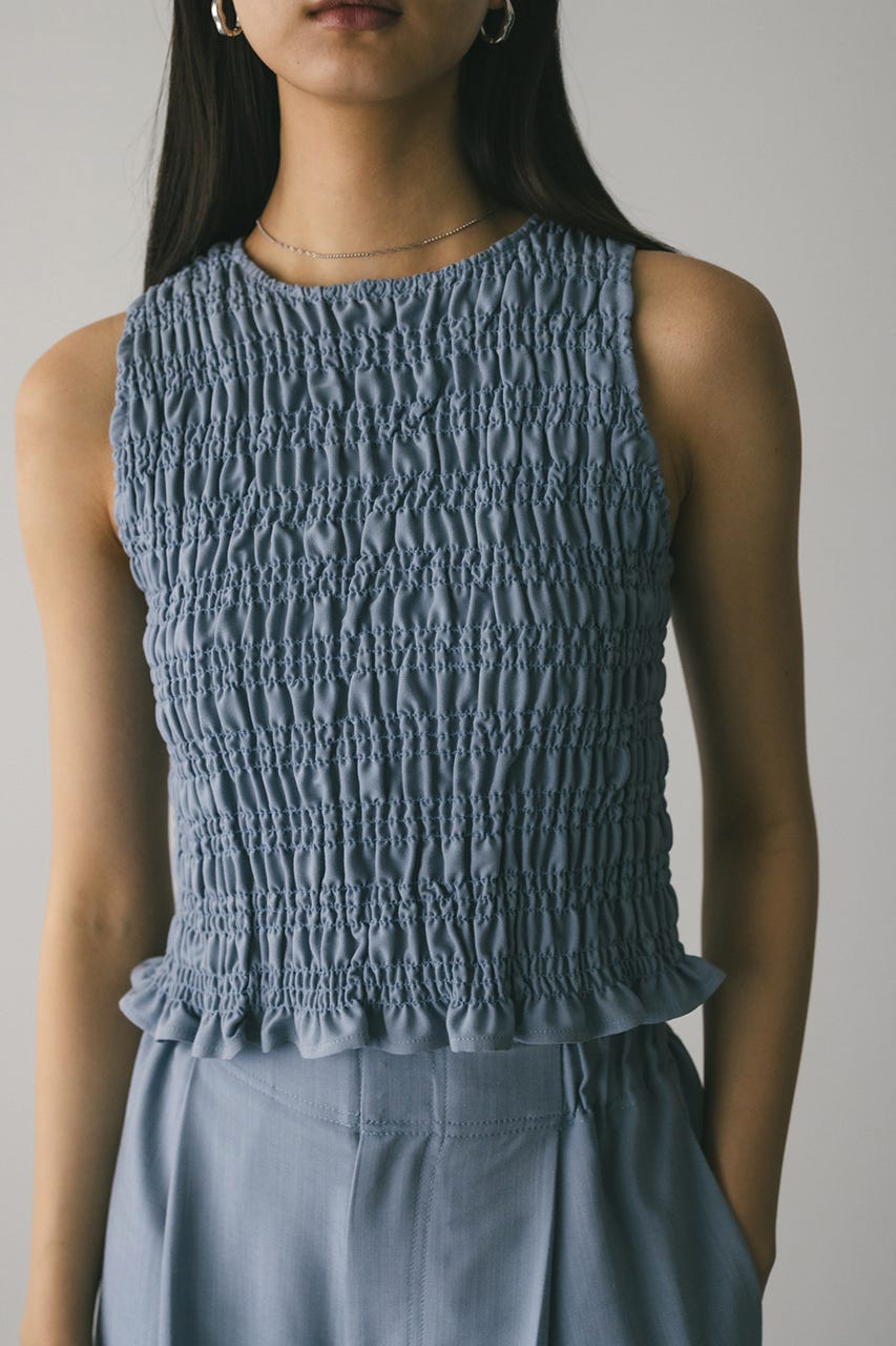 柔らかな肌触りやシルクのような光沢感、吸湿性や速乾性に優れているテンセル混デニム生地を使用したシャーリングトップ。
