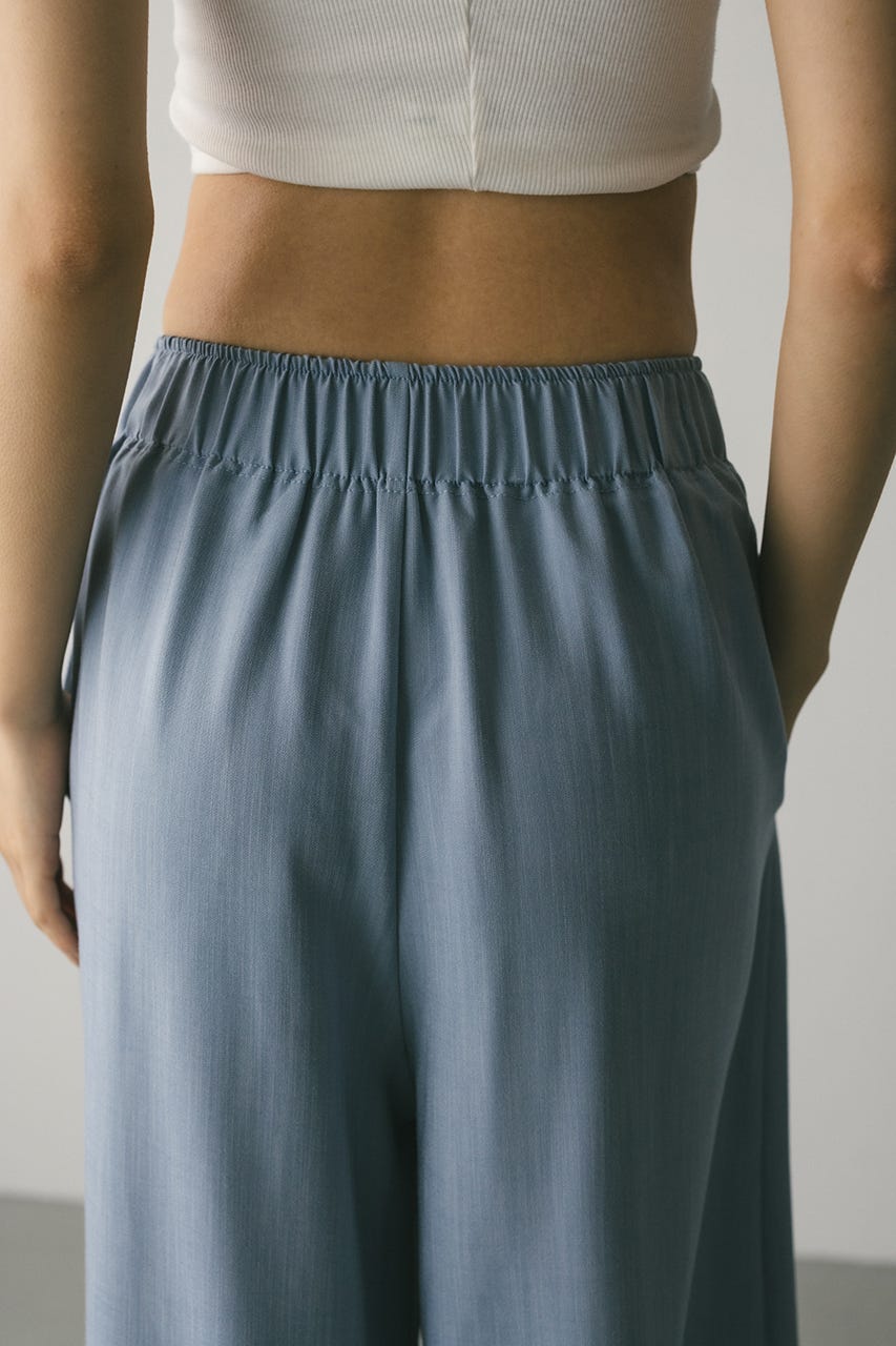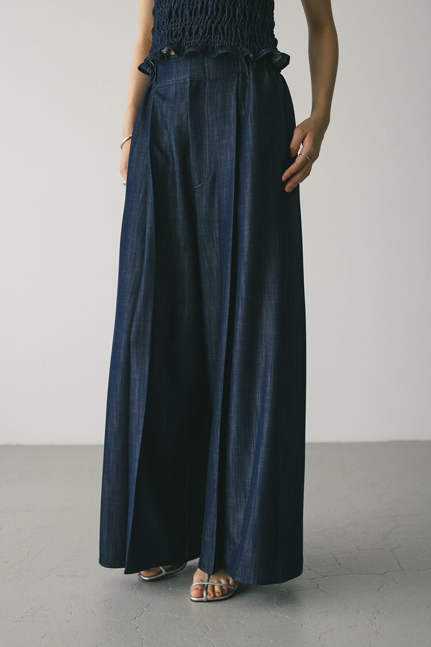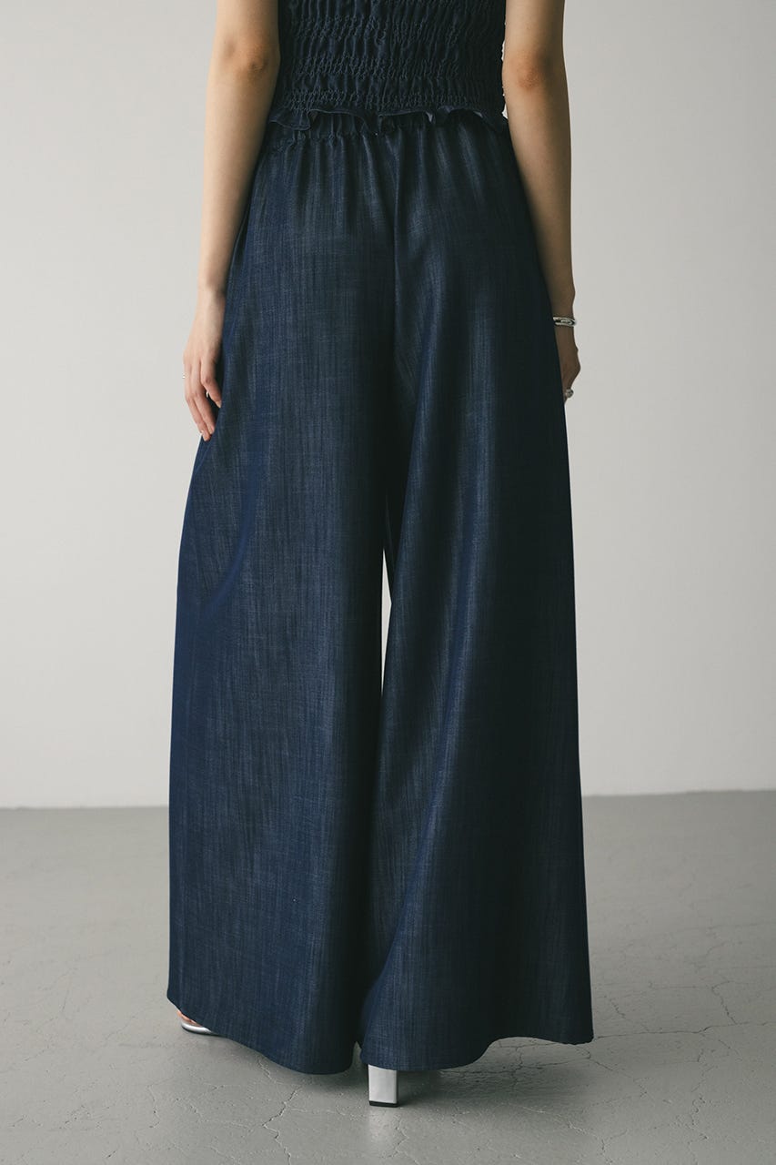 柔らかな肌触りやシルクのような光沢感、吸湿性や速乾性に優れているテンセル混デニム生地を使用したワイドパンツ。