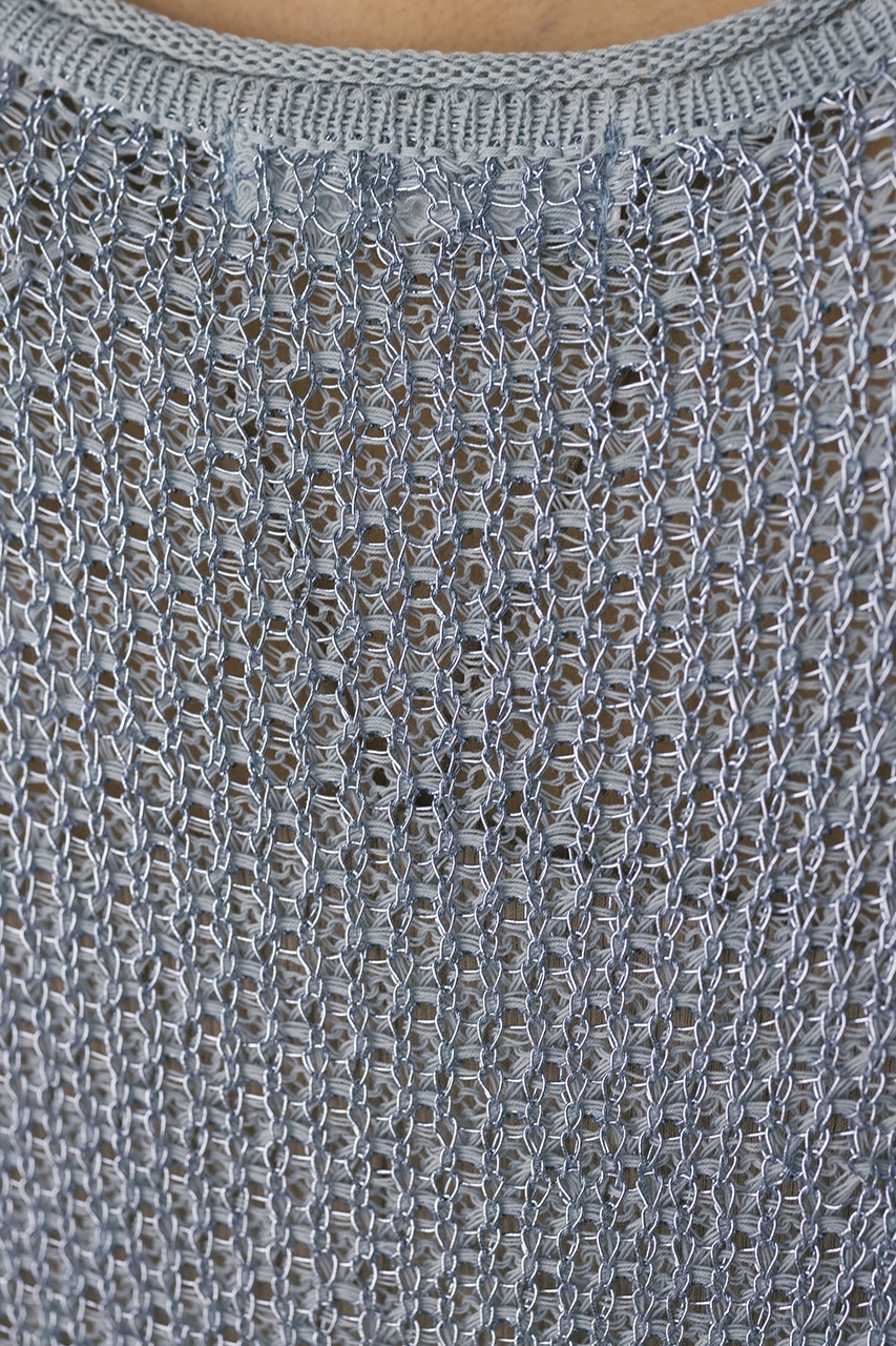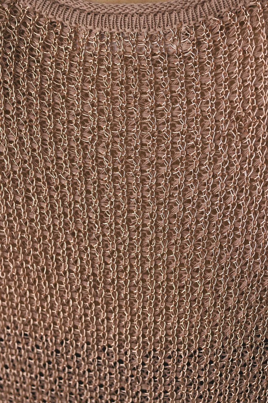 メタリックヤーンとハイツイストコットンをダブルフェイスに透かし編みにした一枚。