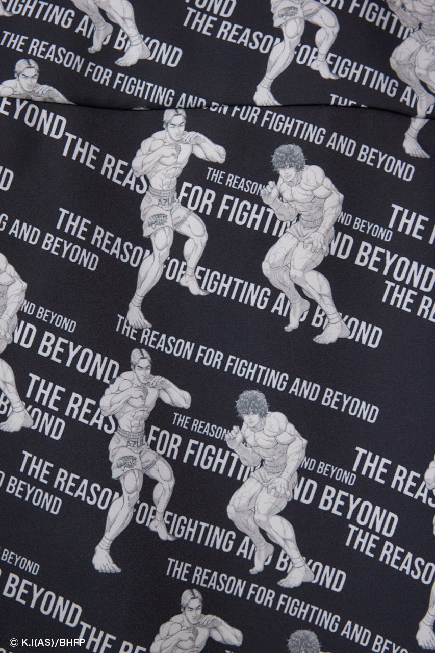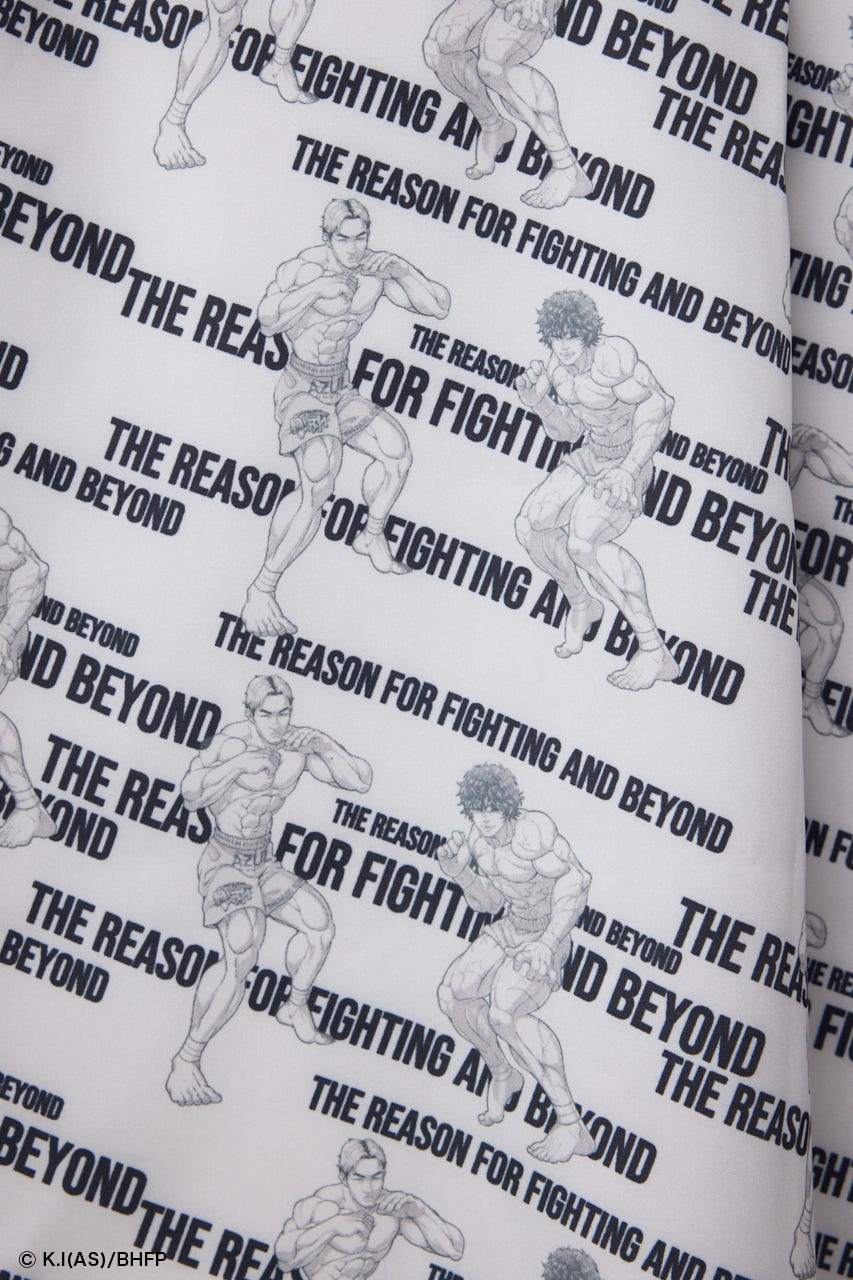 刃牙作者の板垣先生書下ろしの範馬刃牙×朝倉未来さん総柄デザインが入っており、高見えさせる1着となっております。