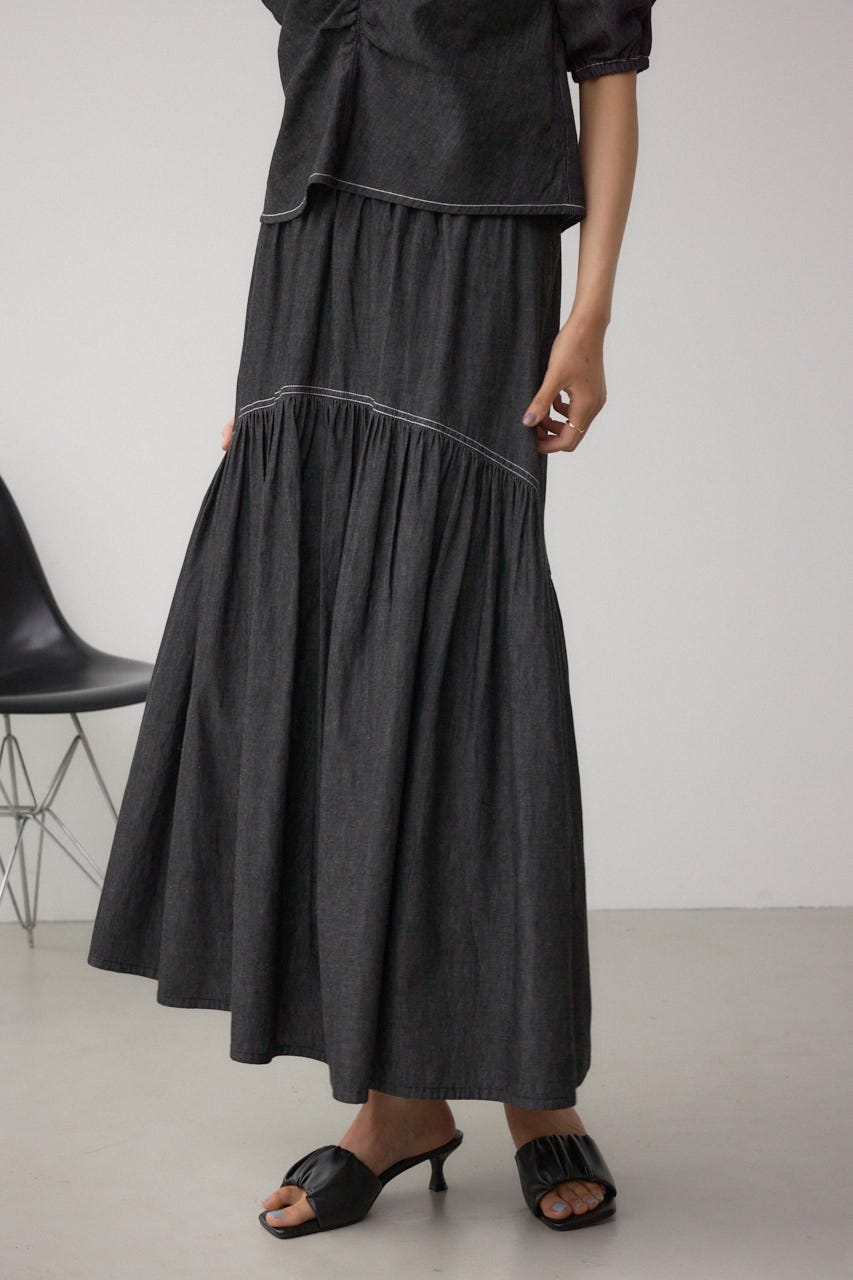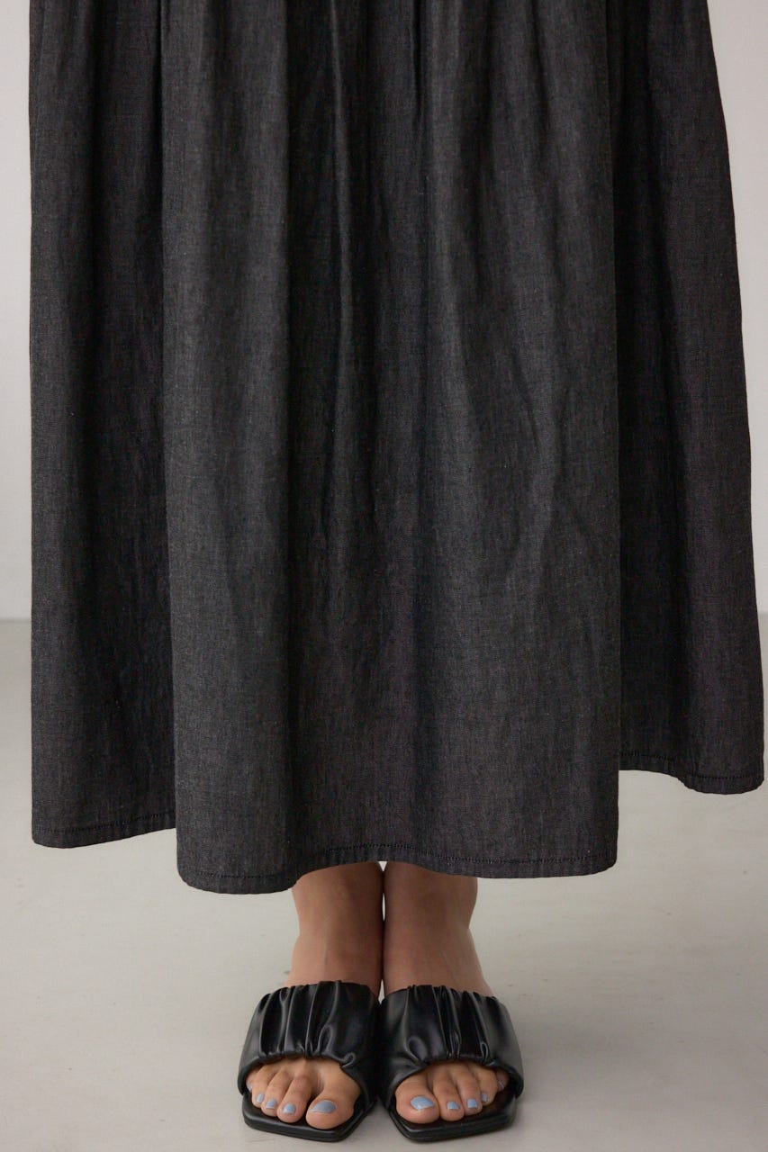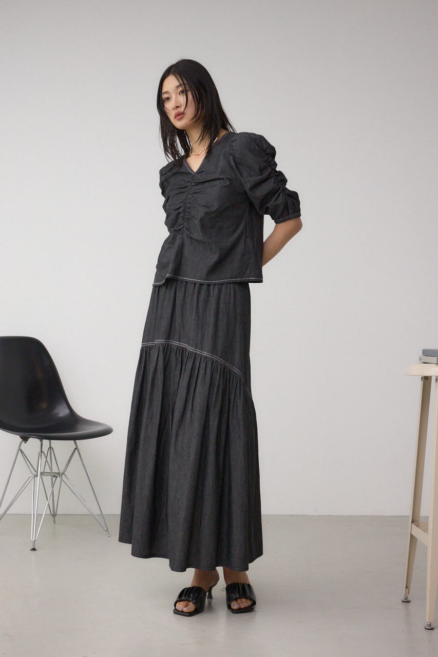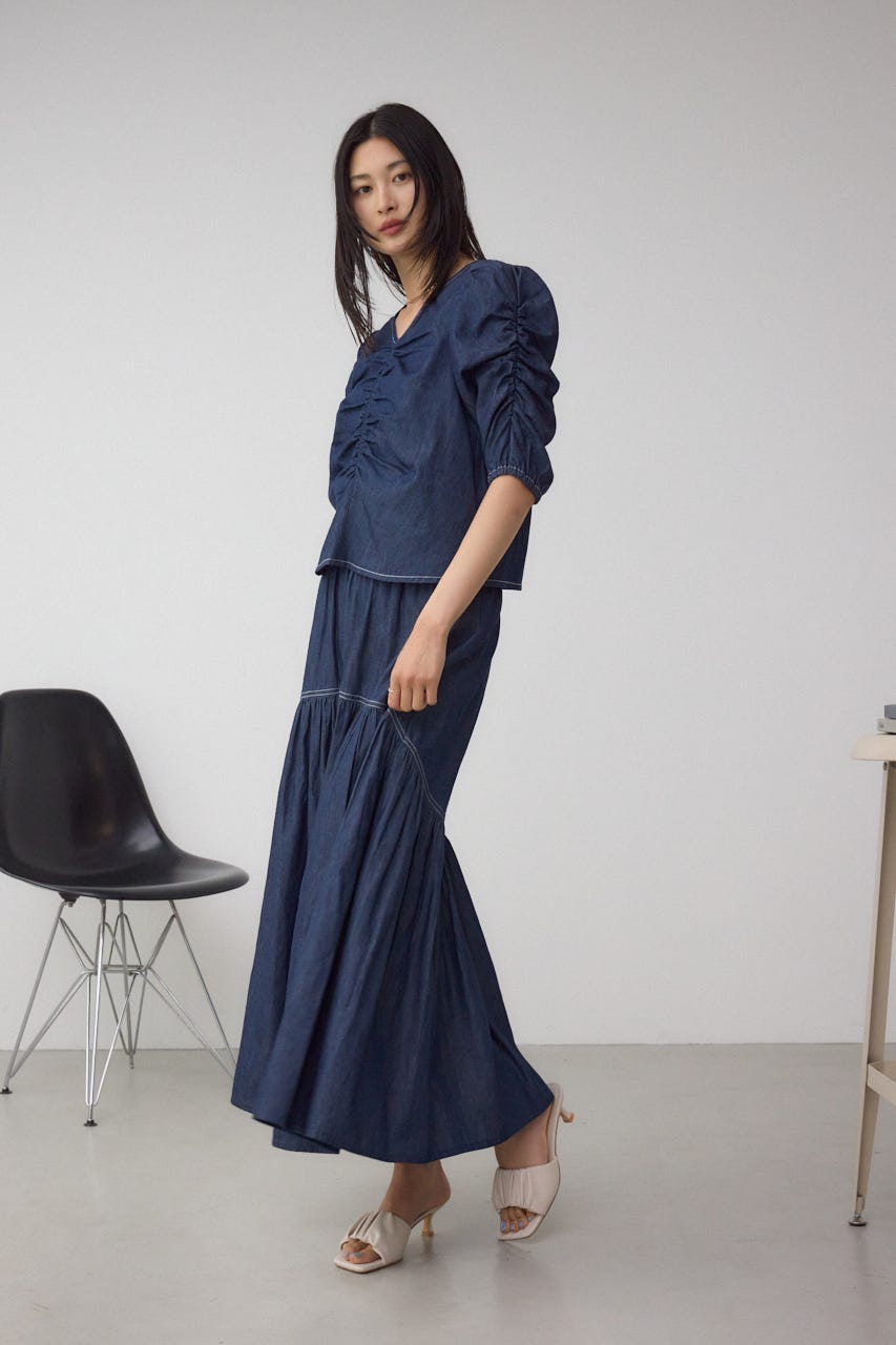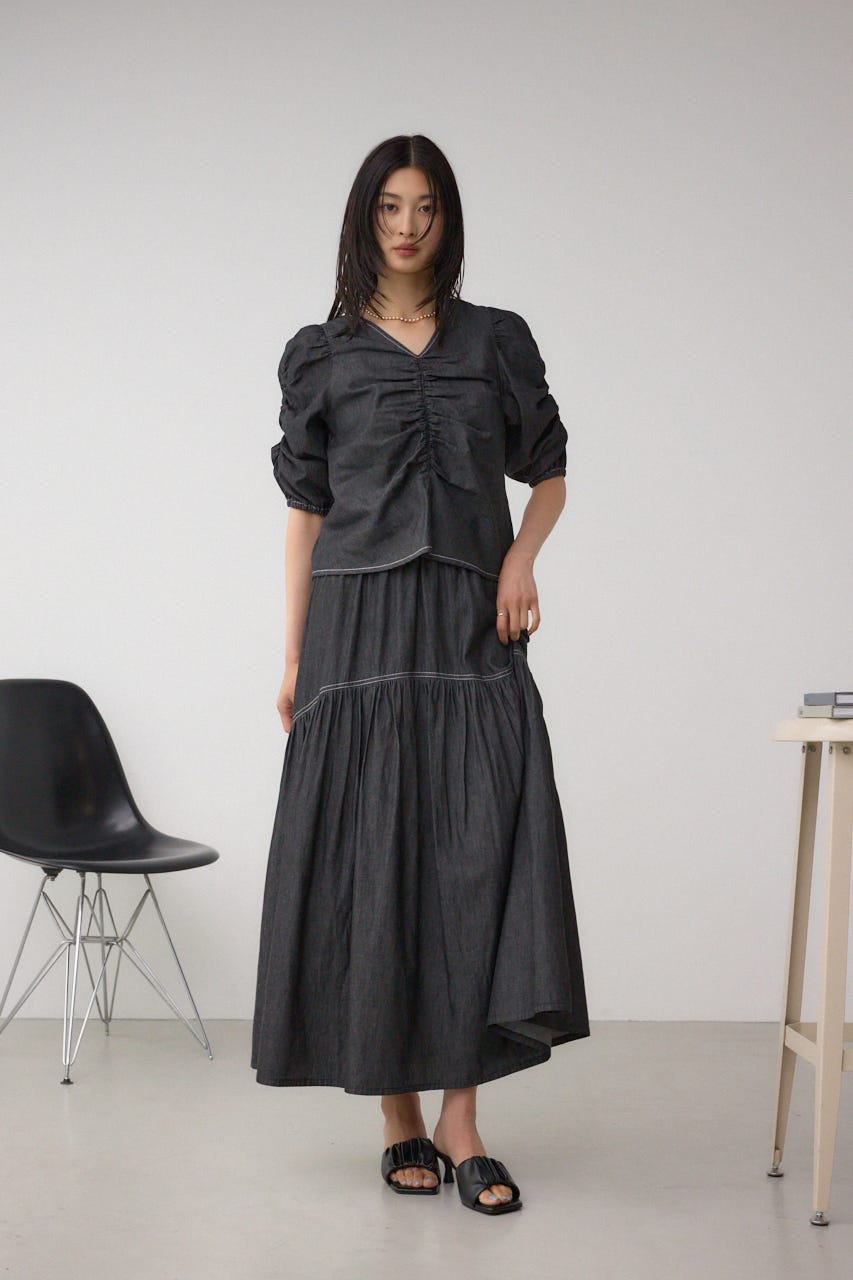同素材のブラウス(250IAC30-163G フロントギャザースリーブブラウス)を合わせてセットアップとして着用すると、ワンピース風な着こなしになります。