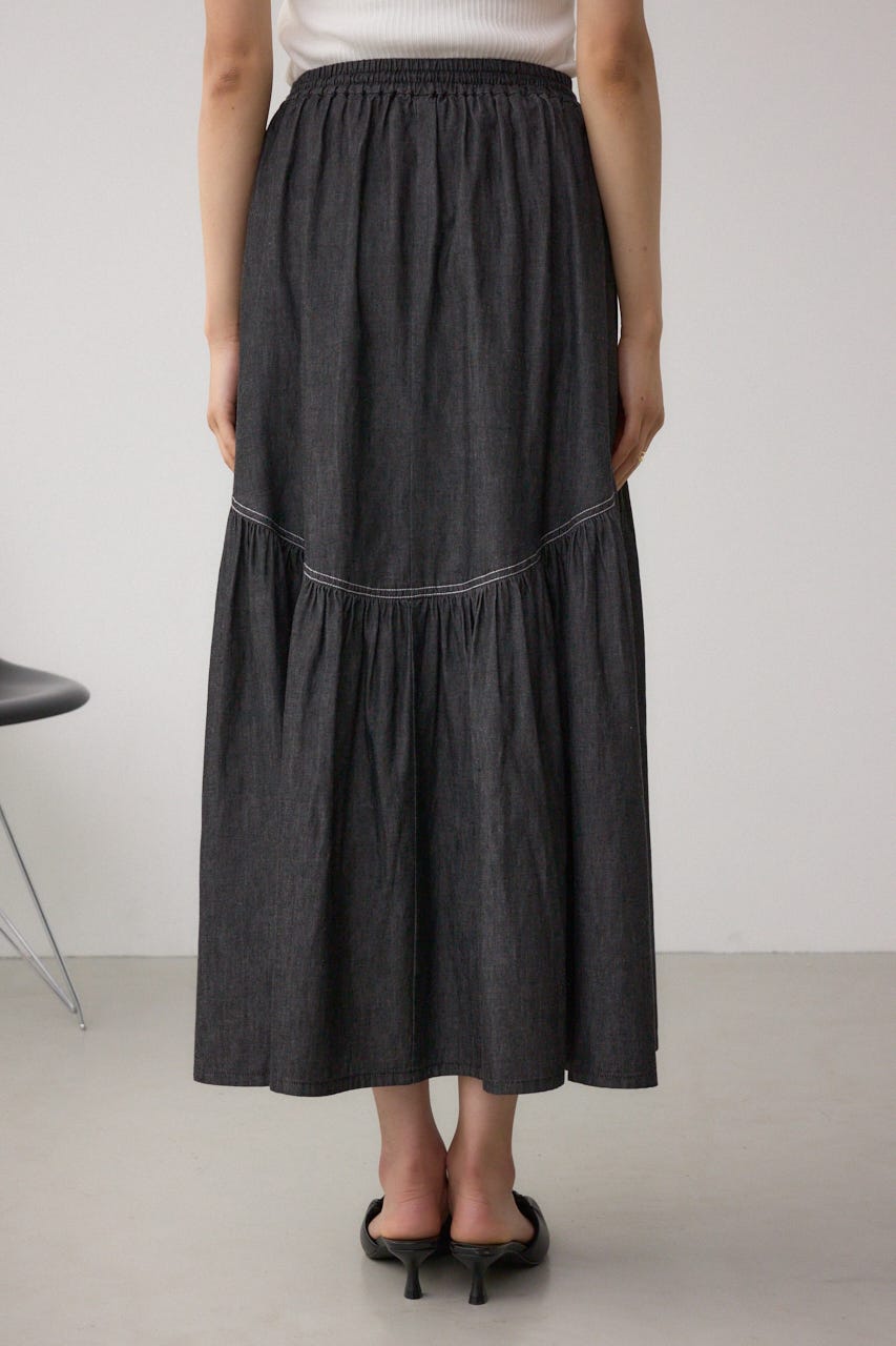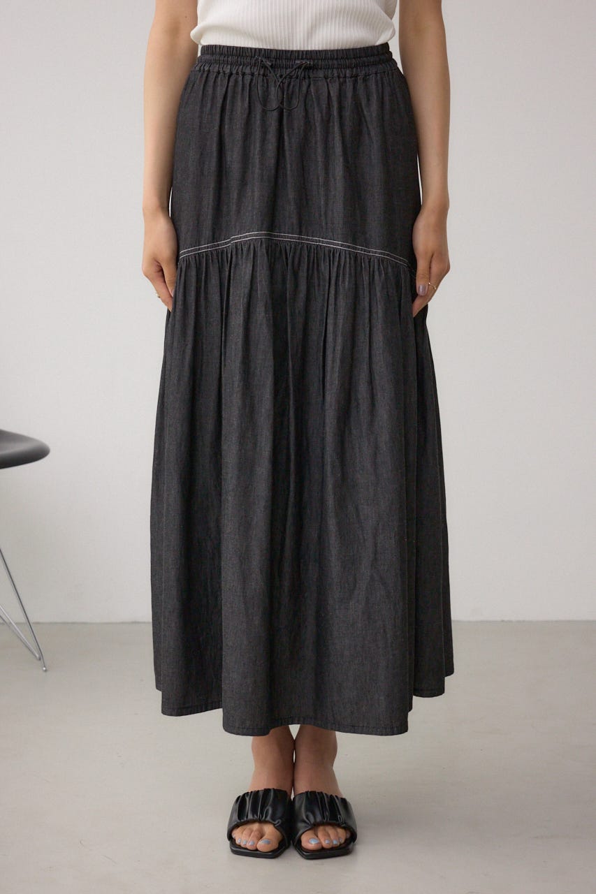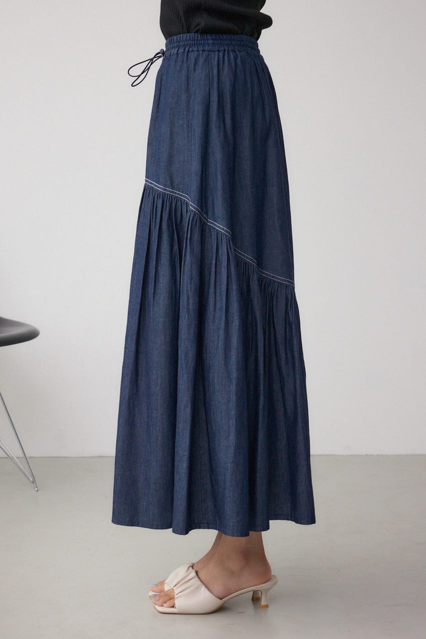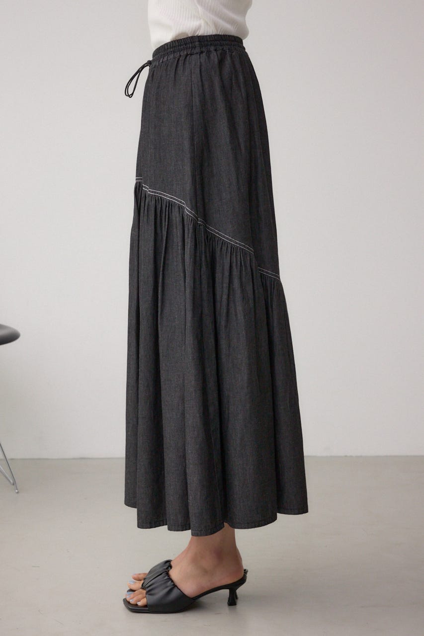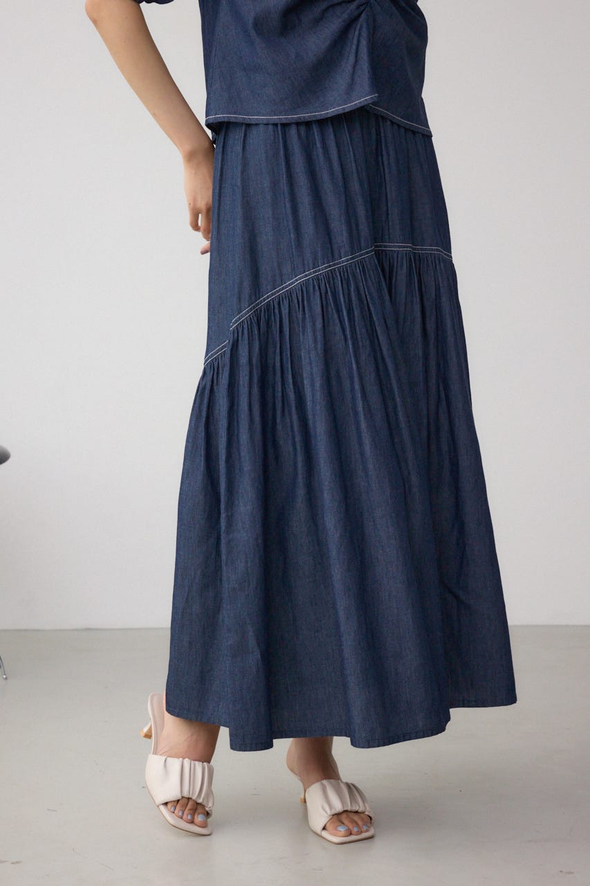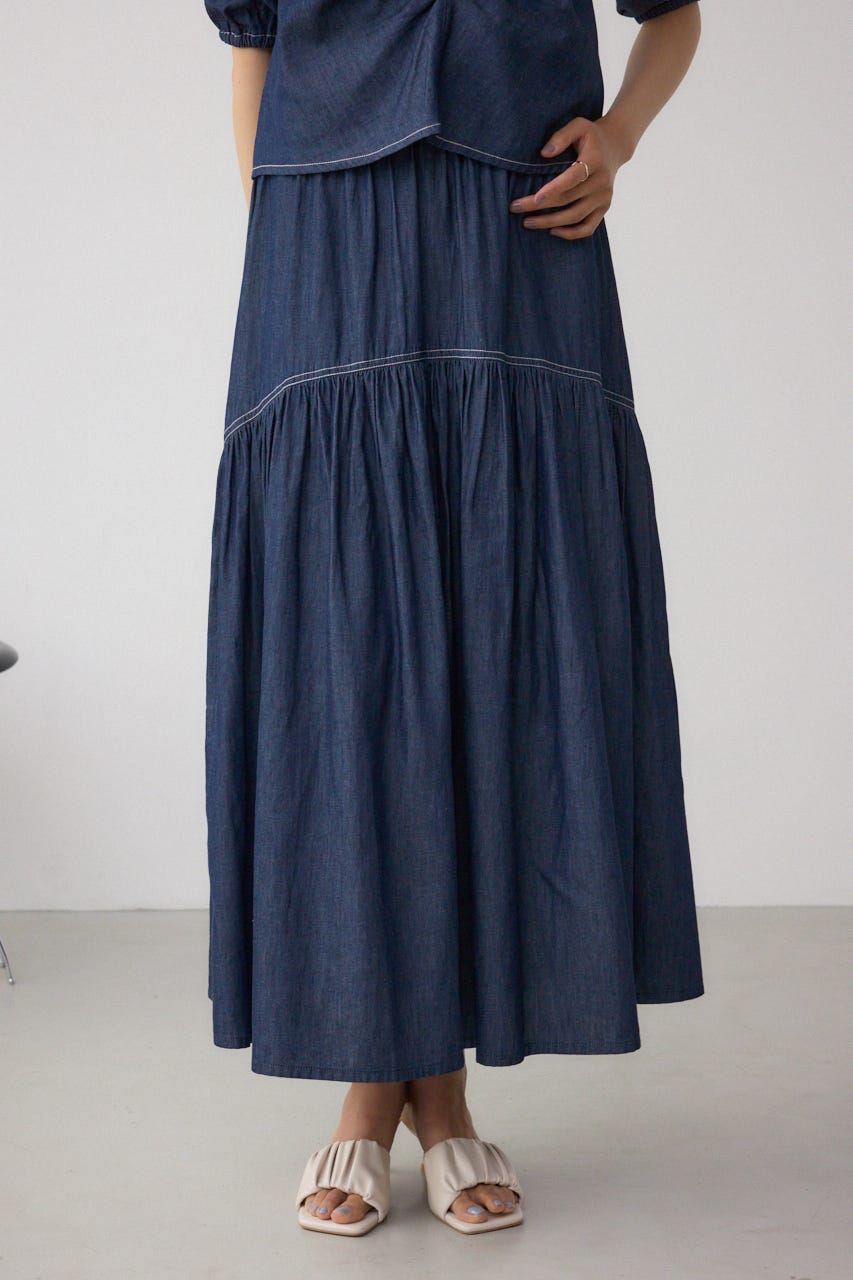 同素材のブラウス(250IAC30-163G フロントギャザースリーブブラウス)を合わせてセットアップとして着用すると、ワンピース風な着こなしになります。