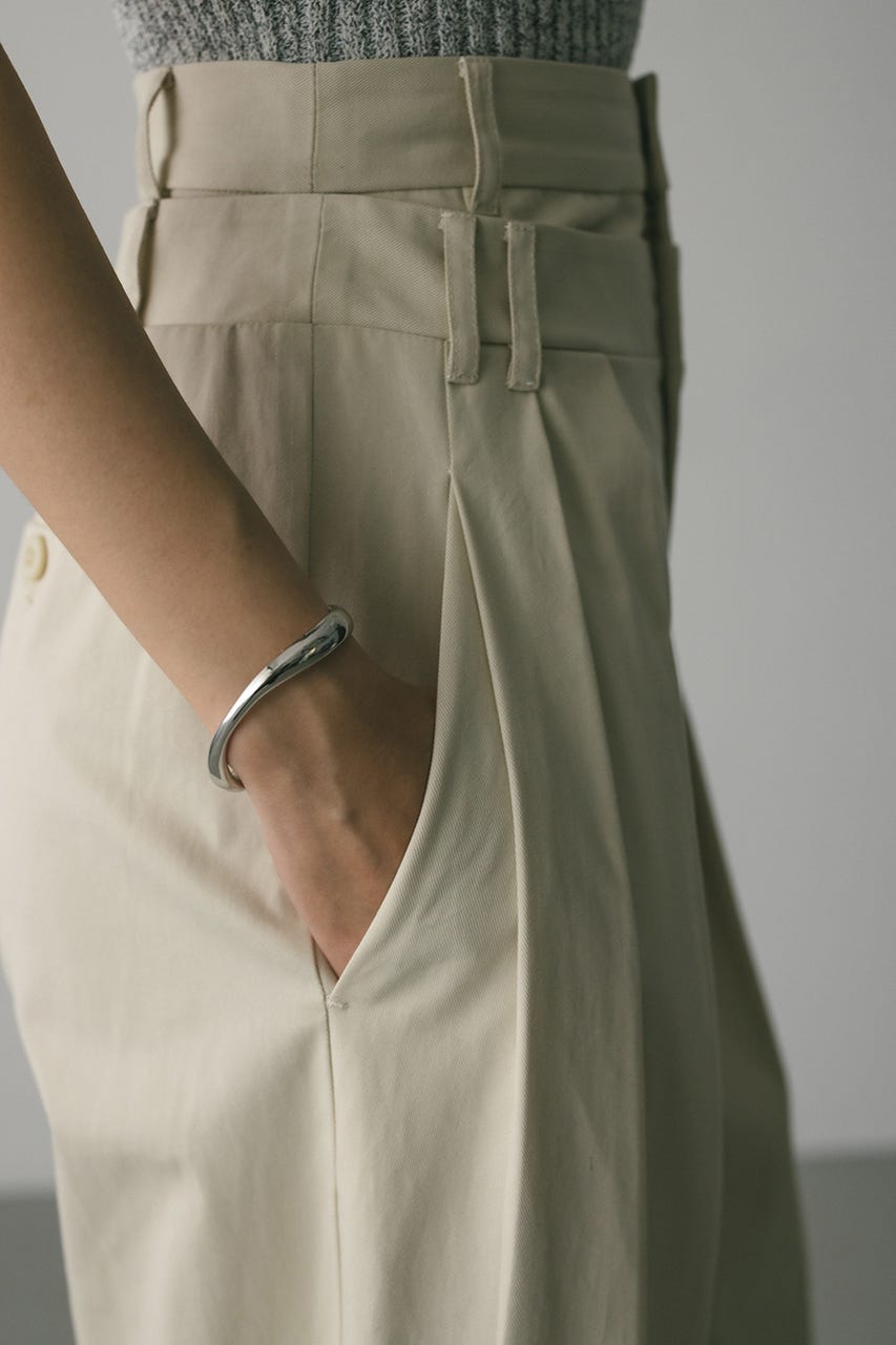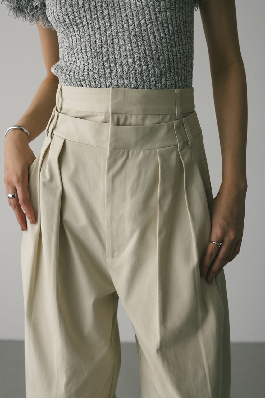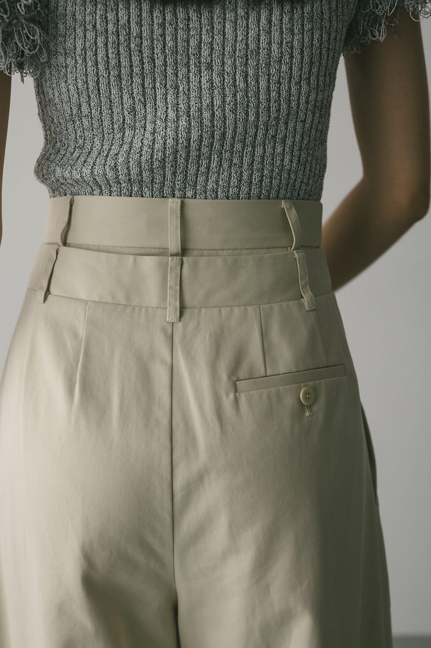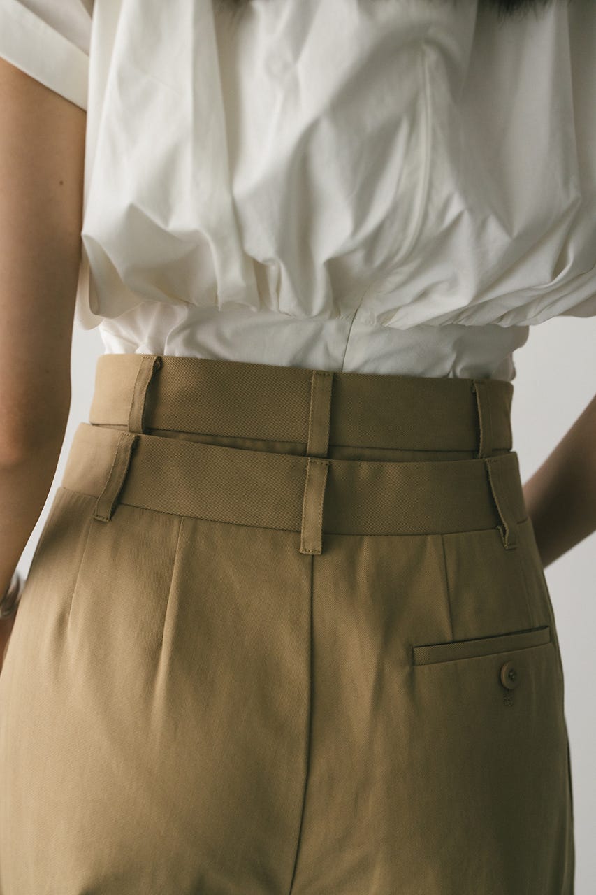 スタイルアップしてくれるレイヤーウエストがポイントの型崩れしにくいチノパンツ。