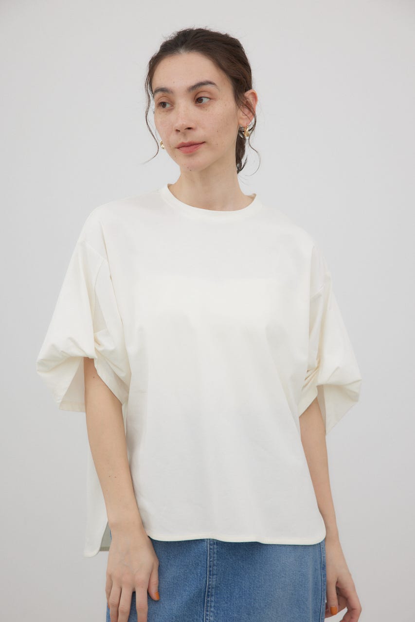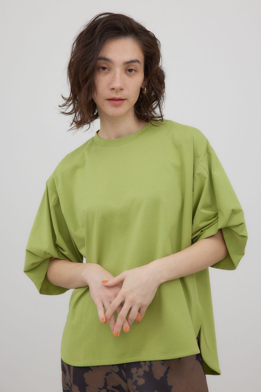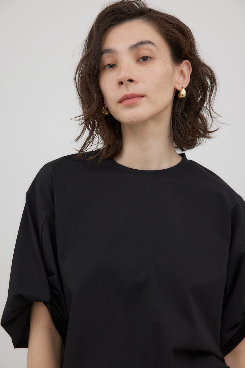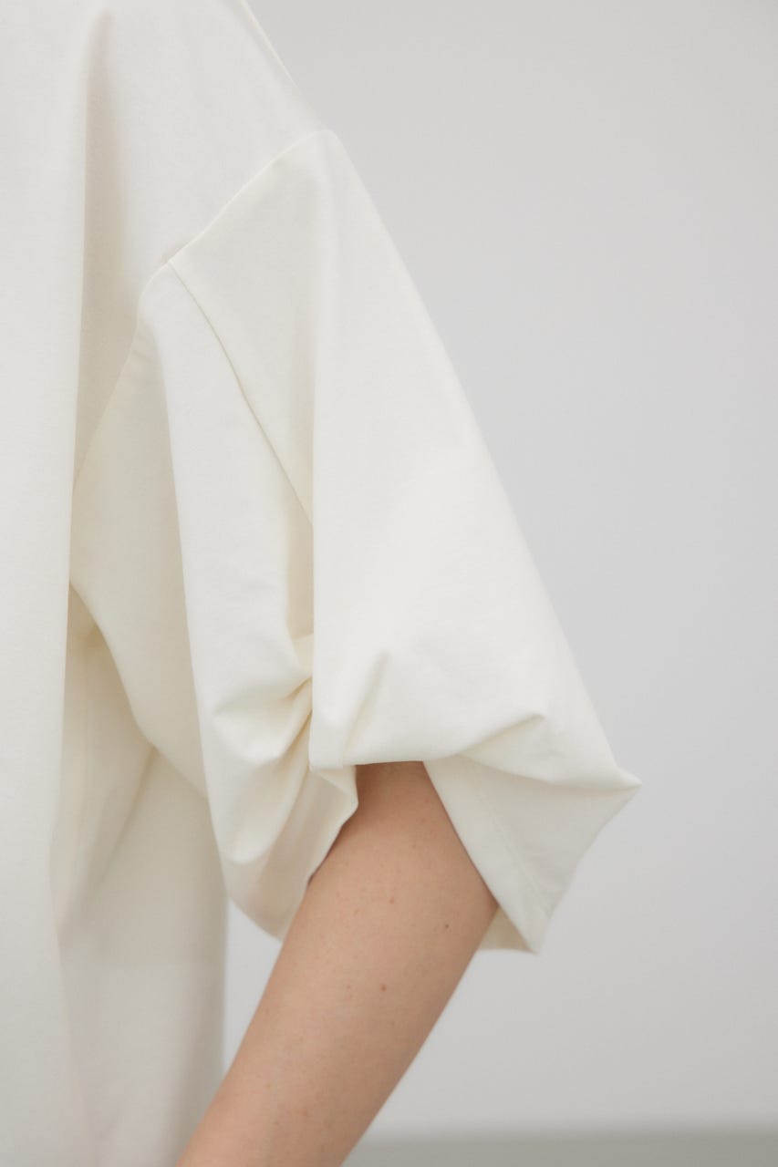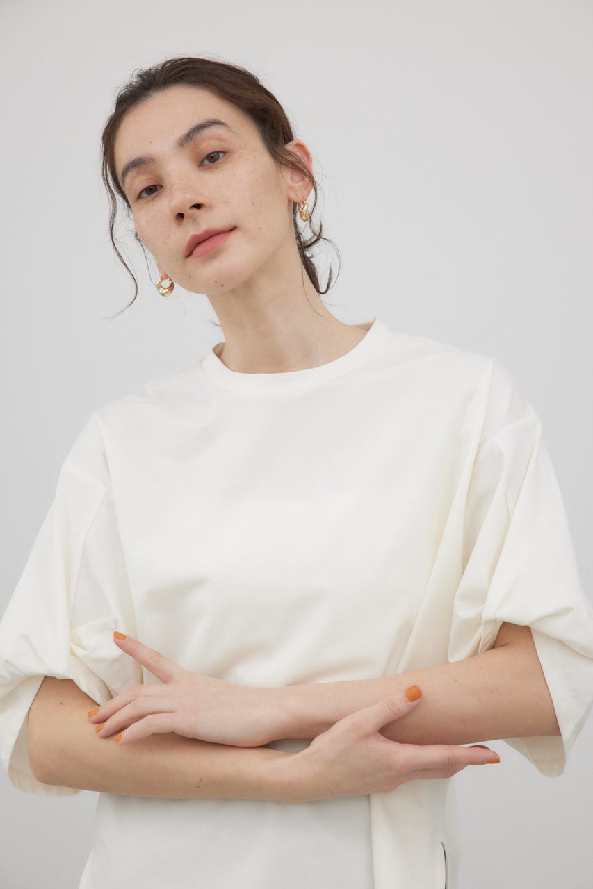 袖を捻ったようなデザインを加えた、シンプルなTシャツ。